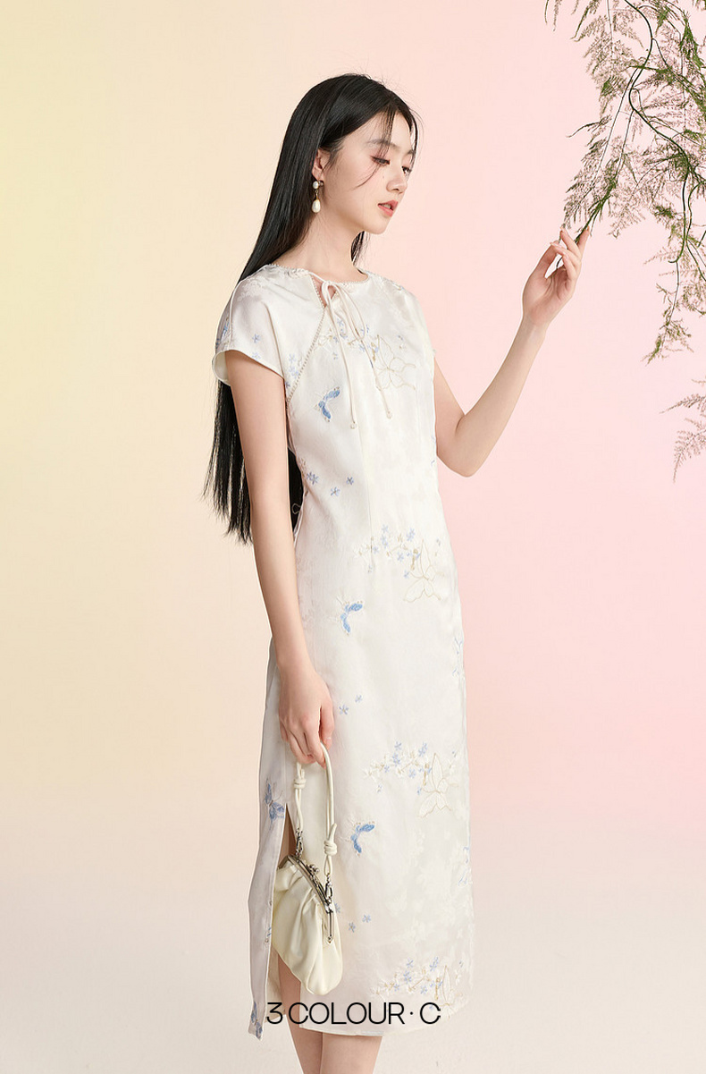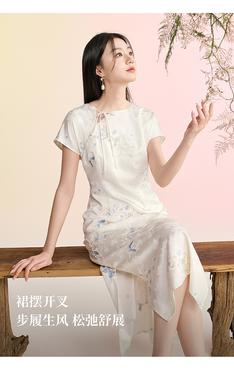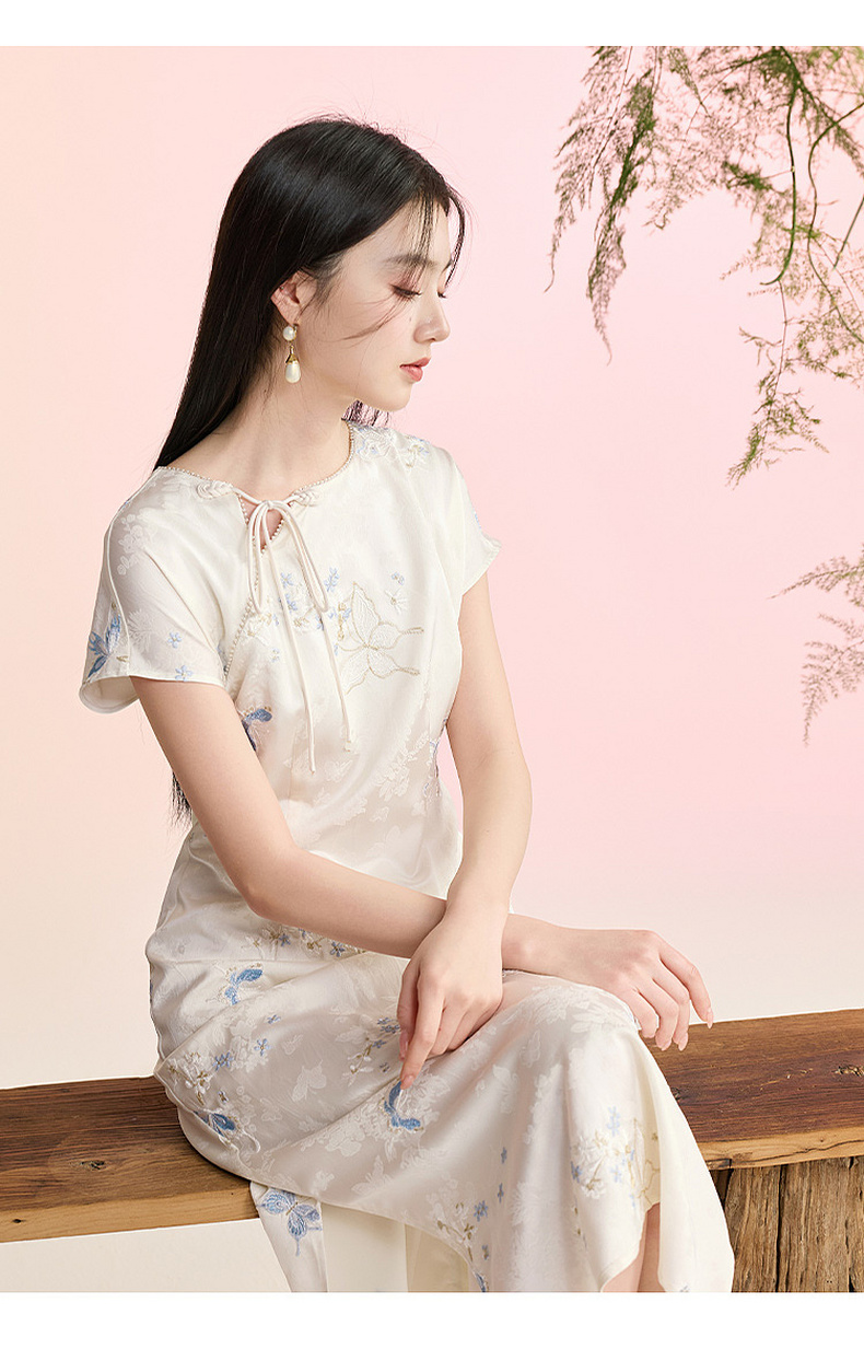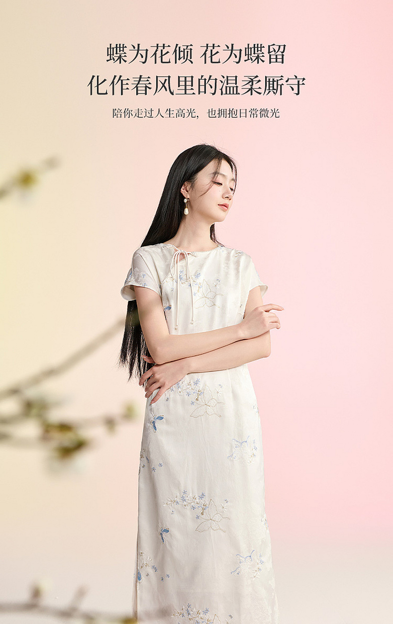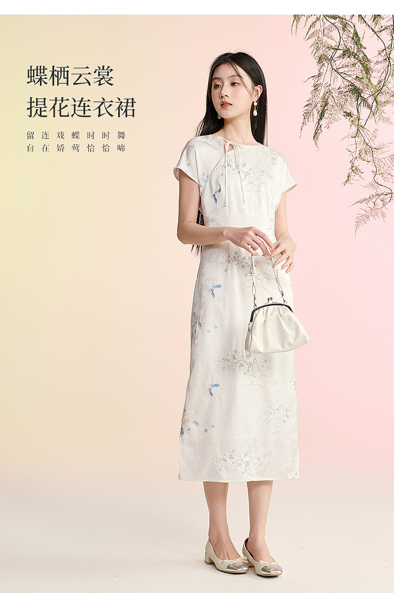 三彩【蝶栖云裳】2026春季新款新中式连衣裙提花绣花开叉长裙C