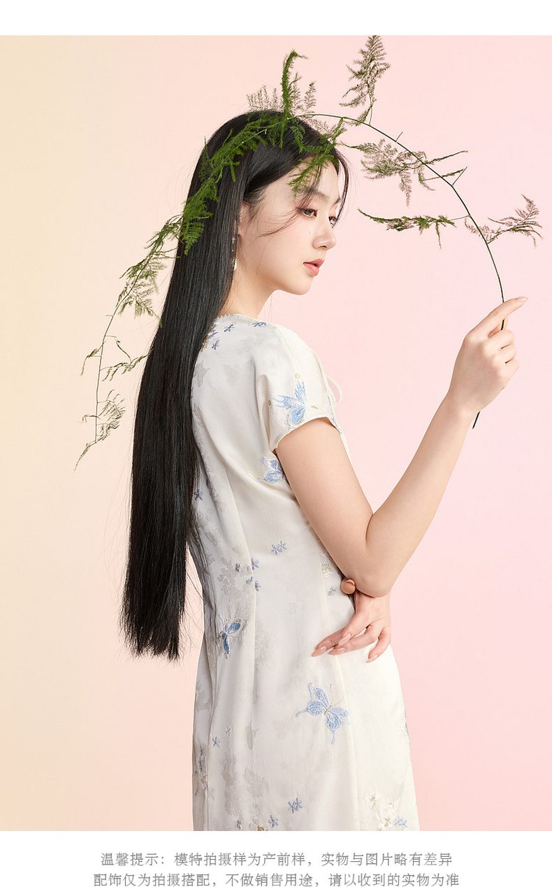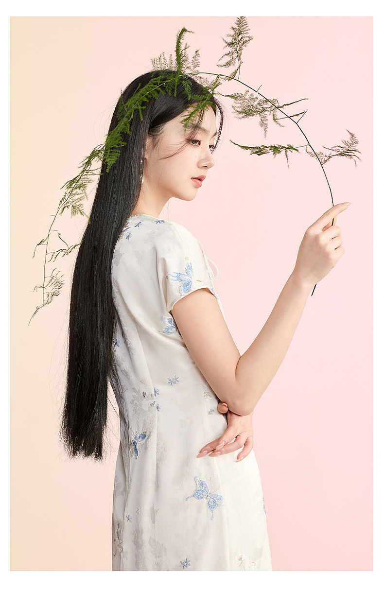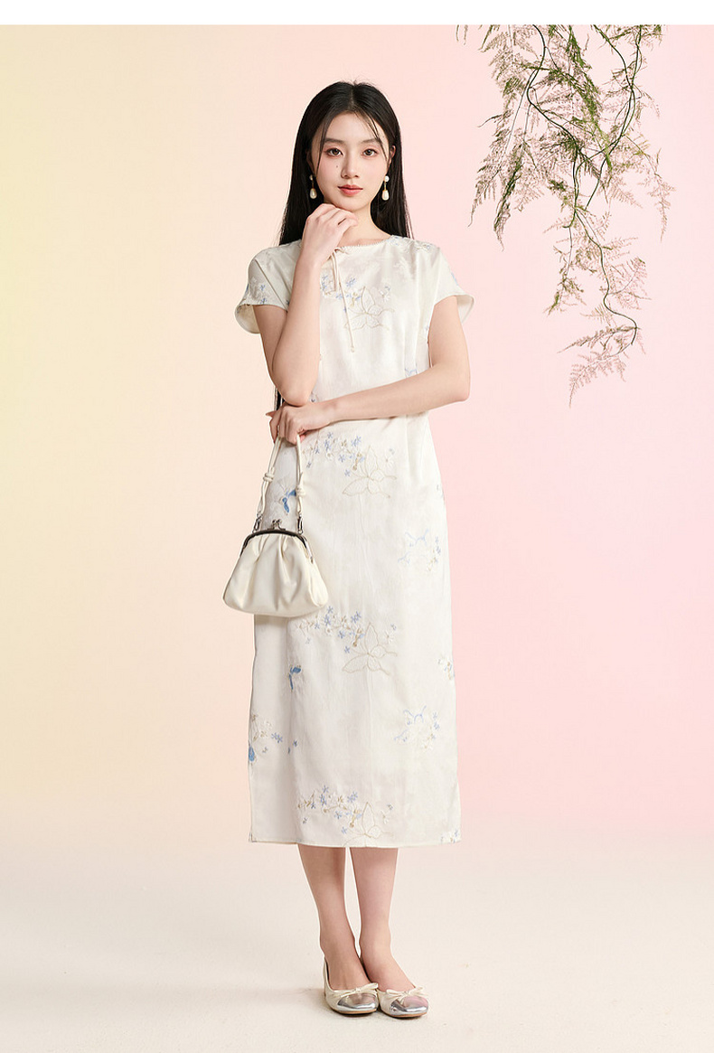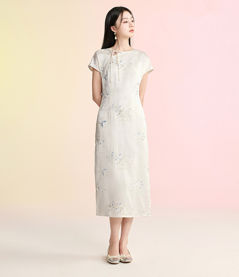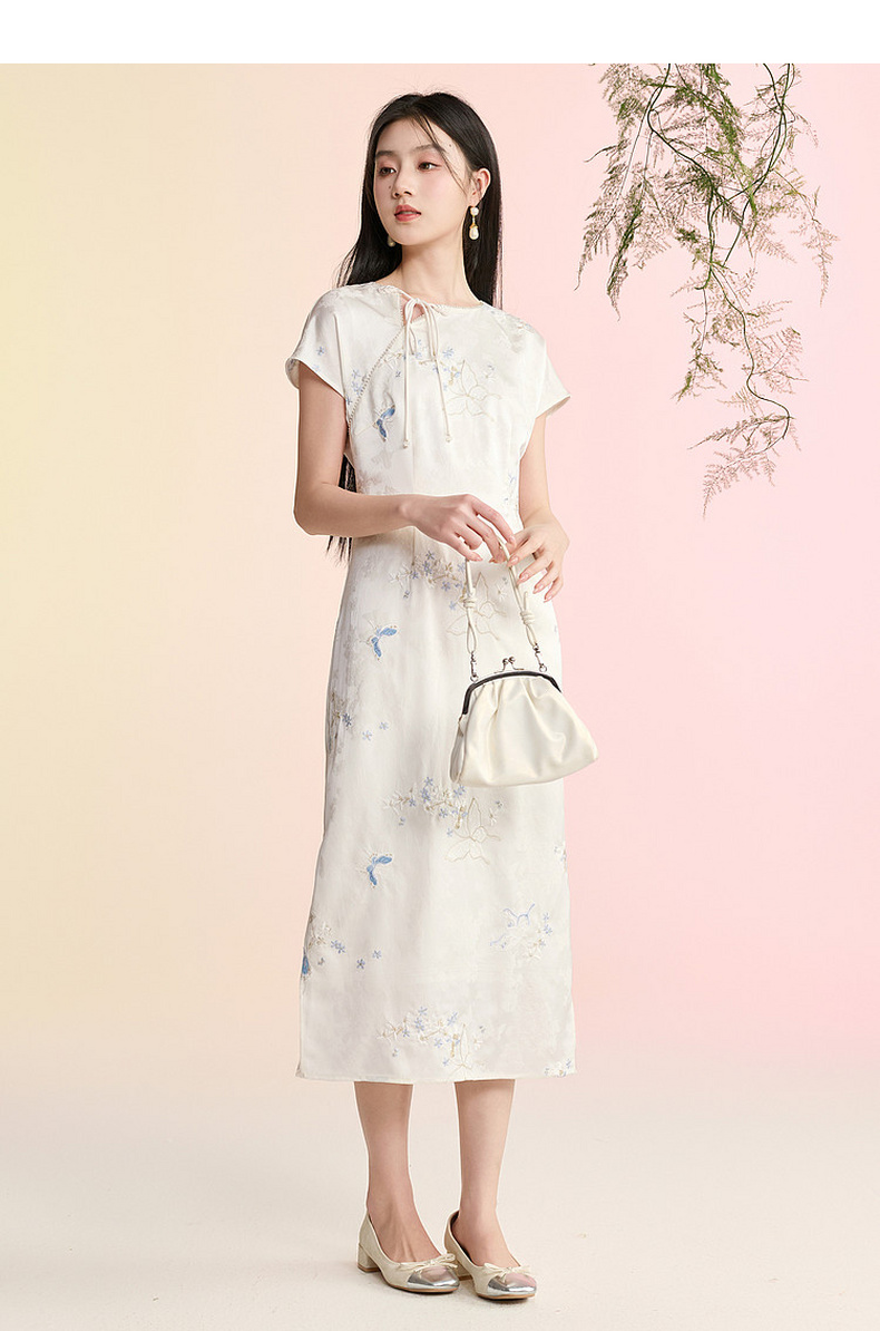 三彩【蝶栖云裳】2026春季新款新中式连衣裙提花绣花开叉长裙C