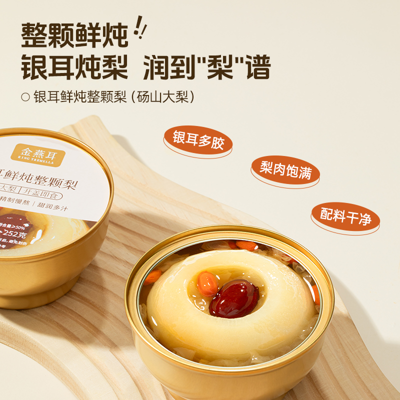 金燕耳整颗梨主要原料:饮用水、鲜梨、鲜银耳、冰糖、新疆灰枣、枸杞,配料干净,坚持0添加。其中采用的梨是砀山大梨,梨的清脆多汁与鲜银耳的细腻滑嫩,再搭配上冰糖的甘甜,每一口都是软糯香甜、层次分明。"
