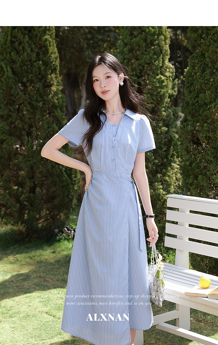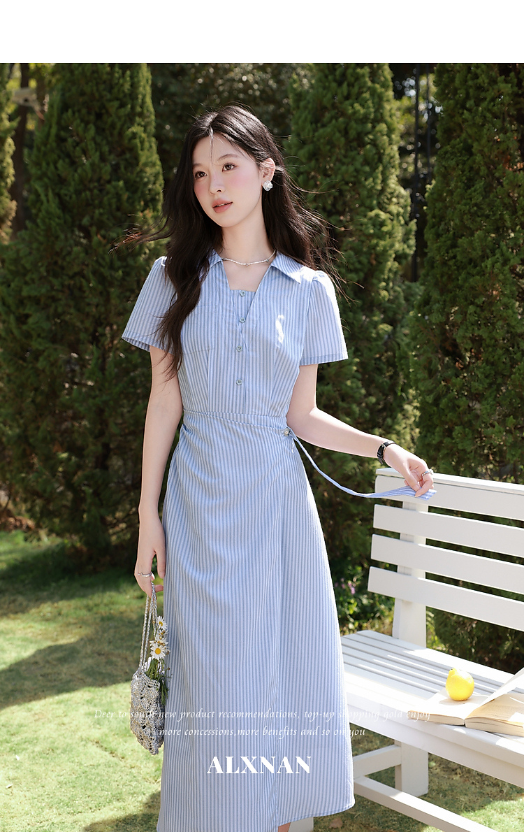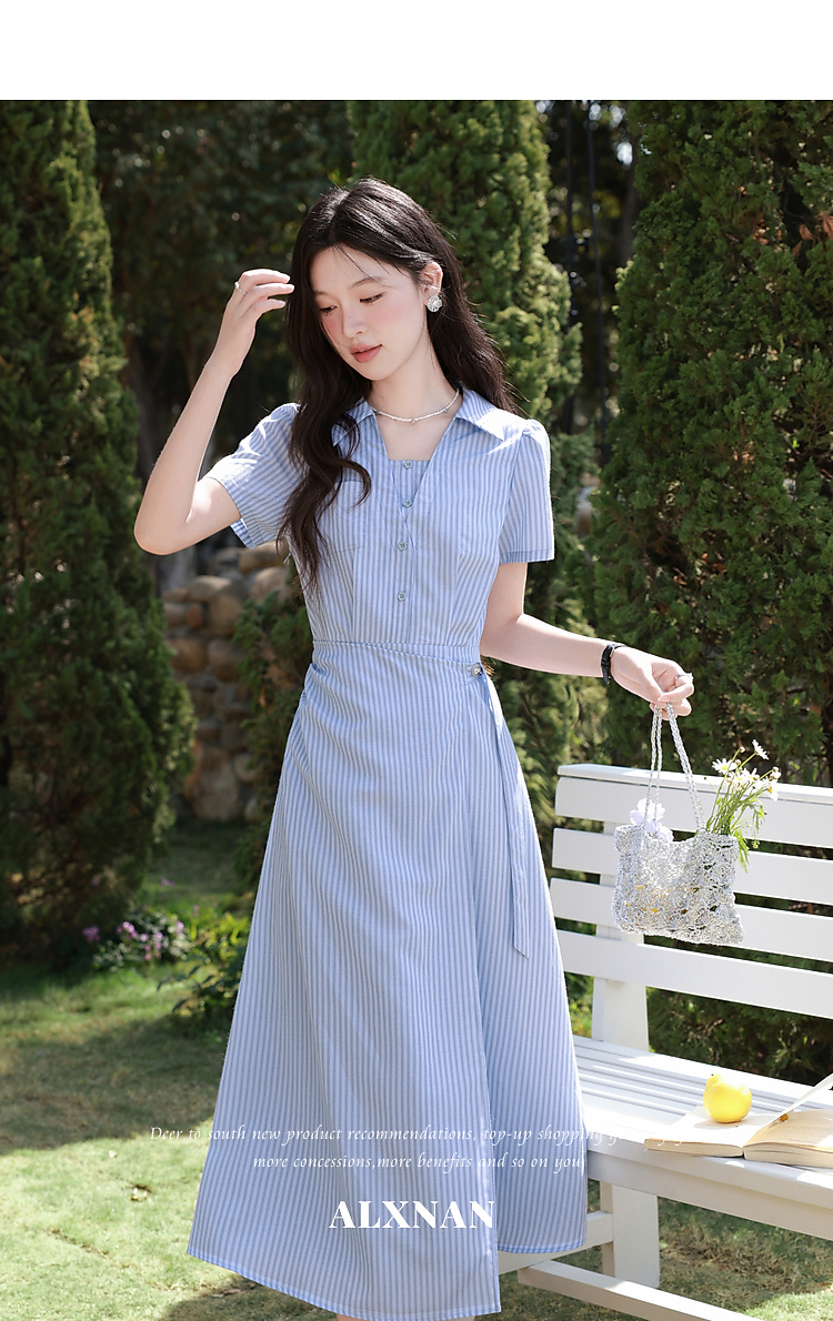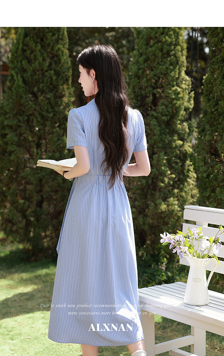 鹿向南「蓝岛续歌」法式温柔设计感条纹收腰裙显瘦蓝色气质连衣裙