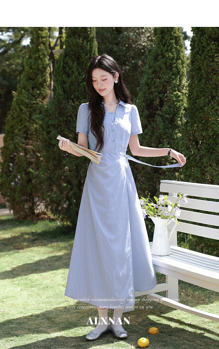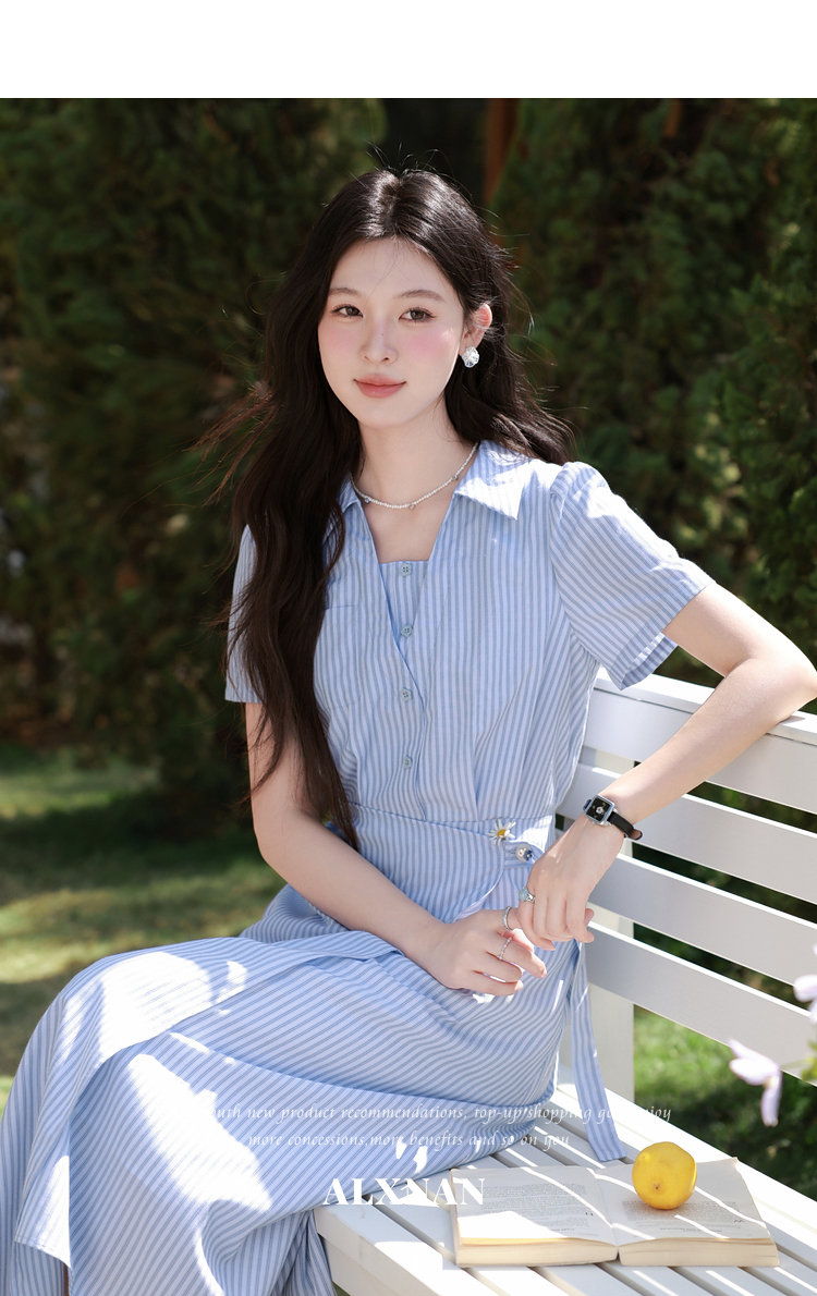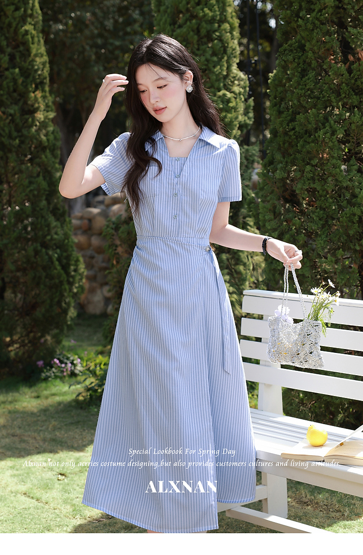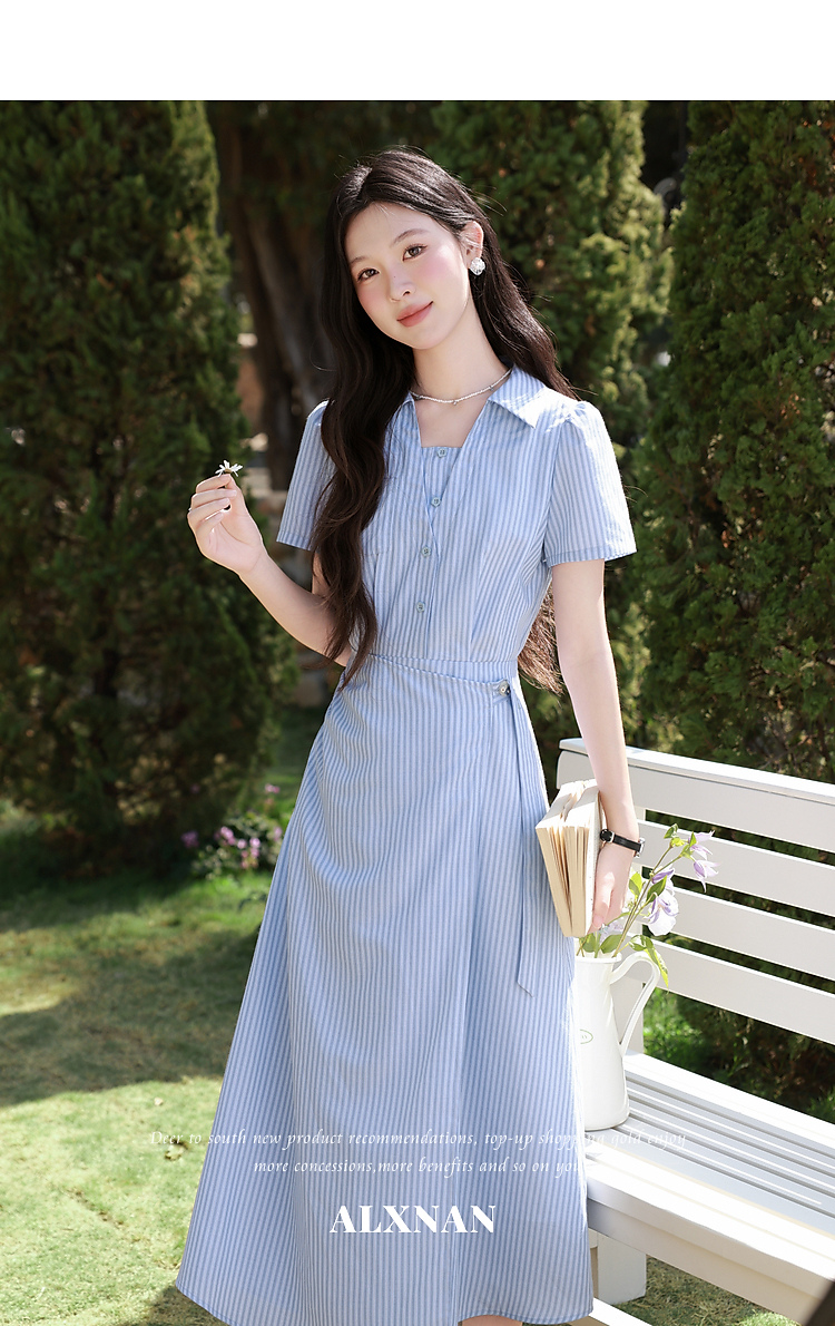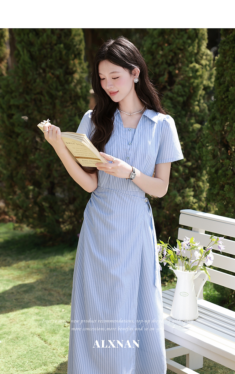鹿向南「蓝岛续歌」法式温柔设计感条纹收腰裙显瘦蓝色气质连衣裙