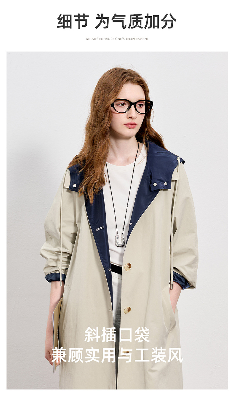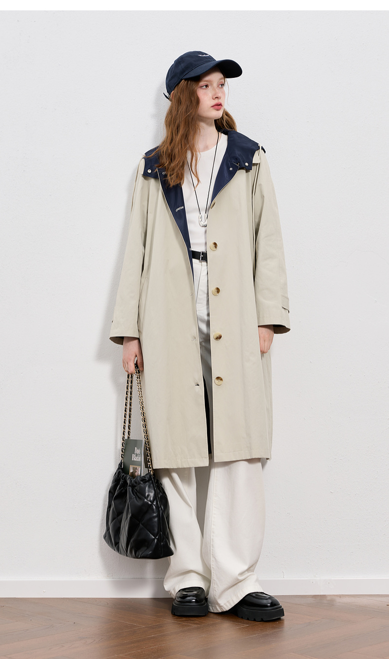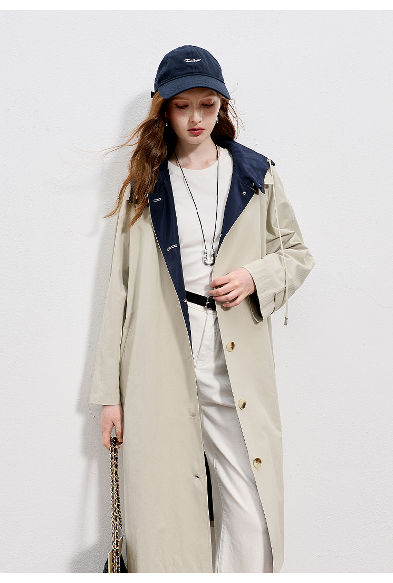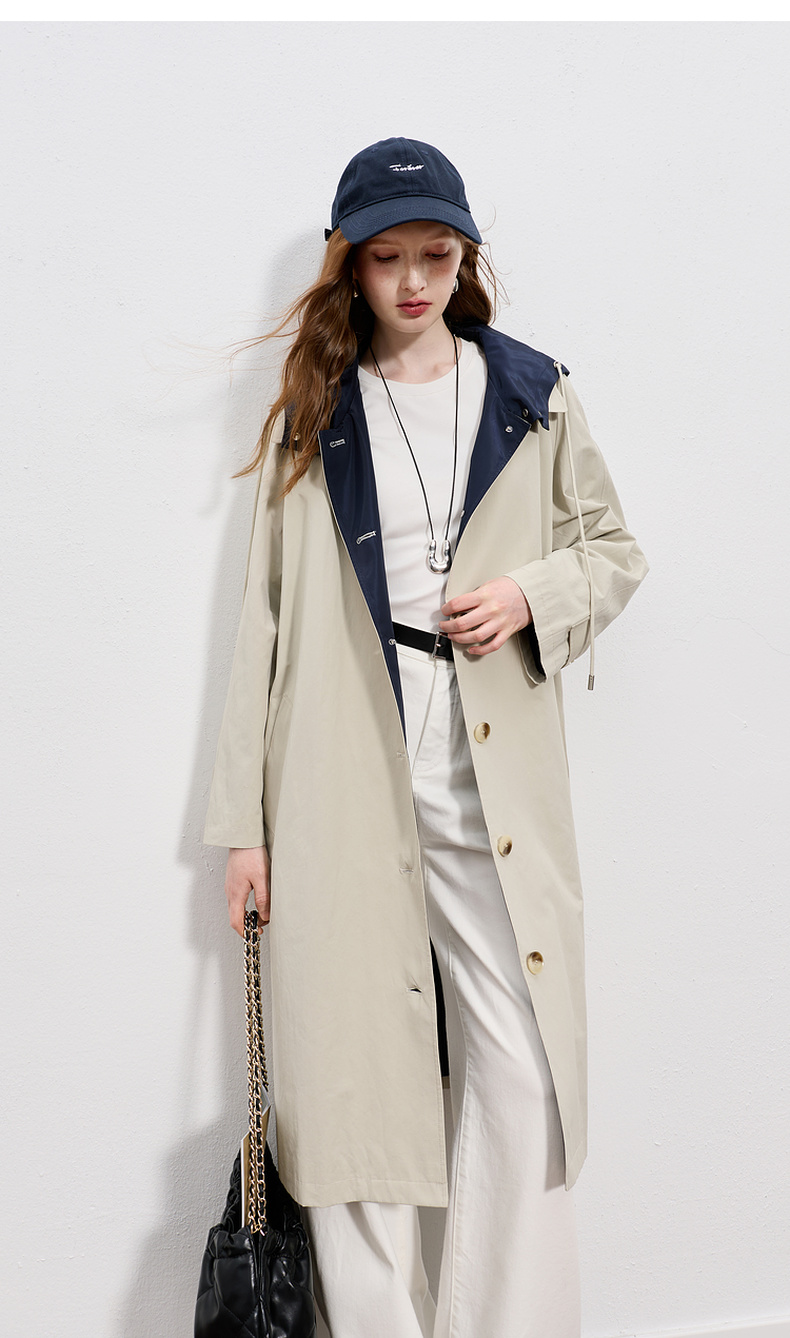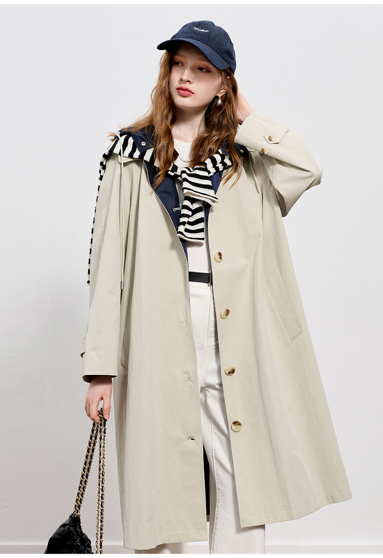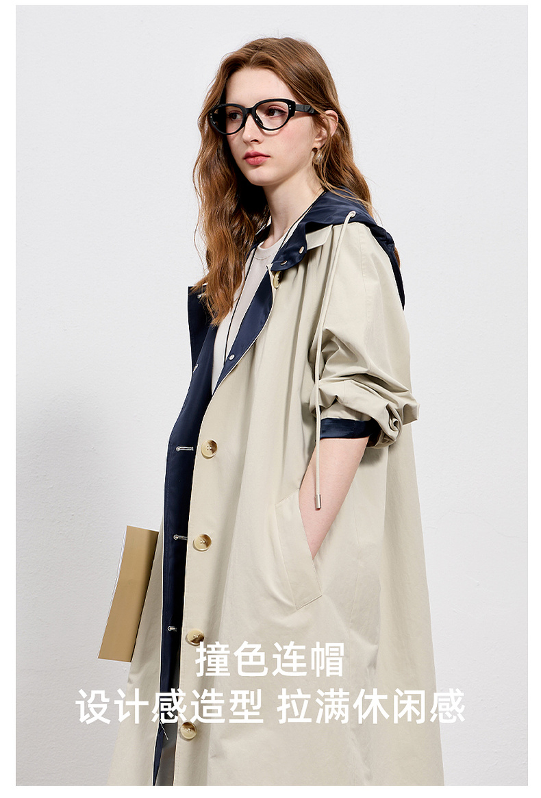 三彩2025秋季新款宽松长款连帽风衣外套长袖休闲气质通勤简约S