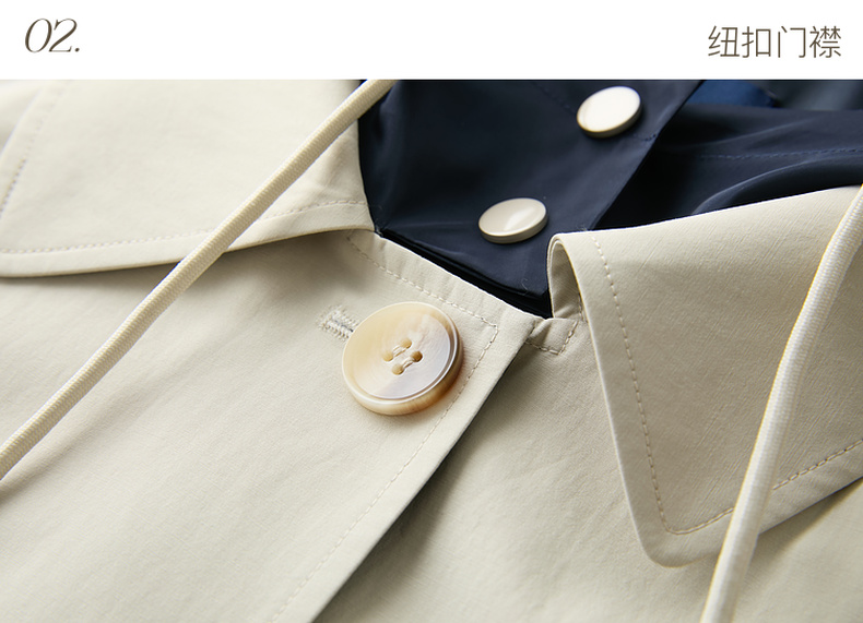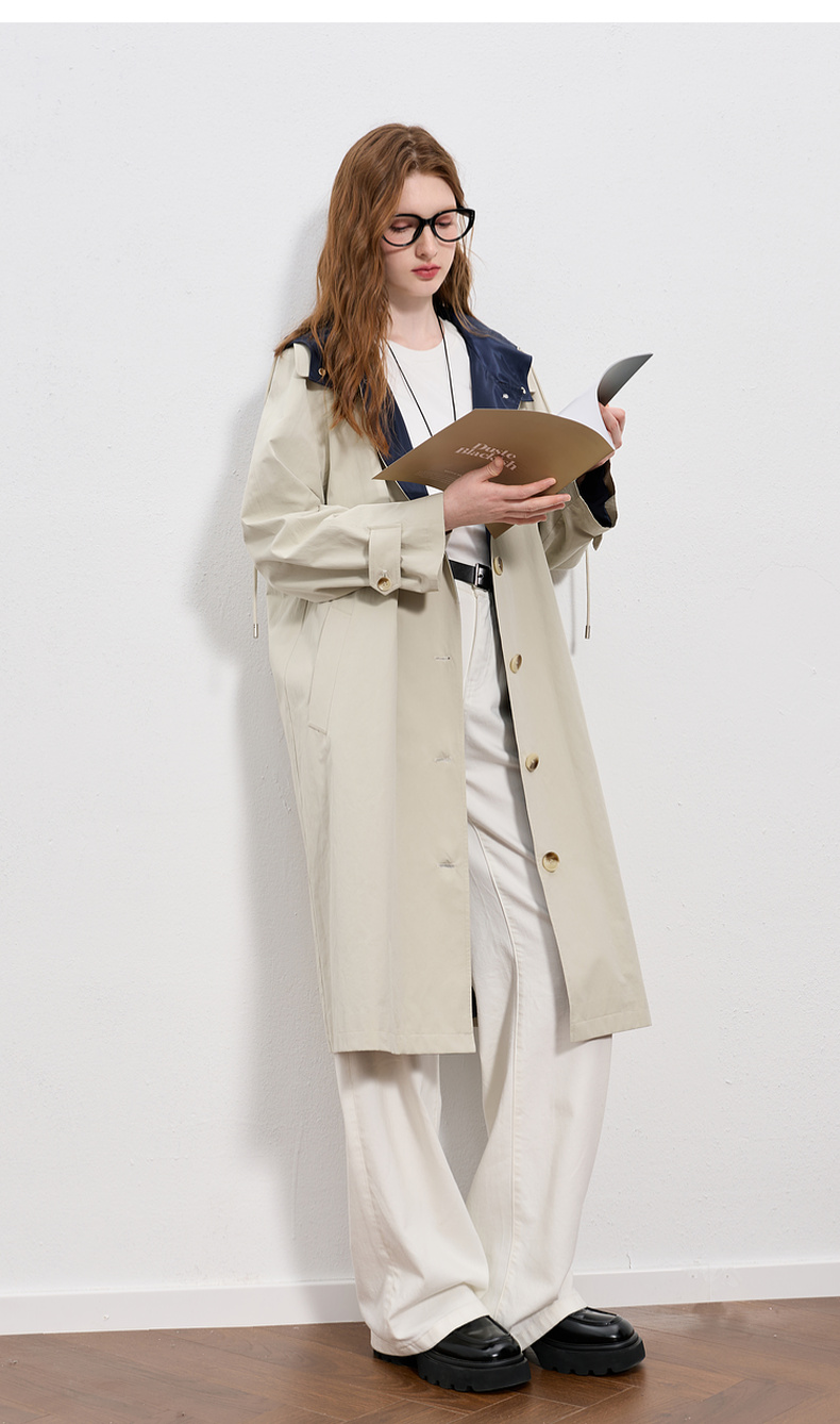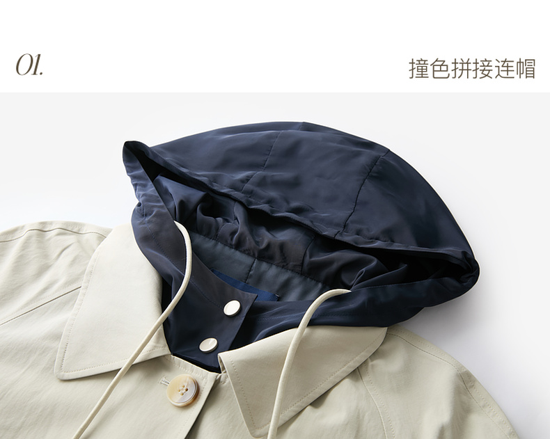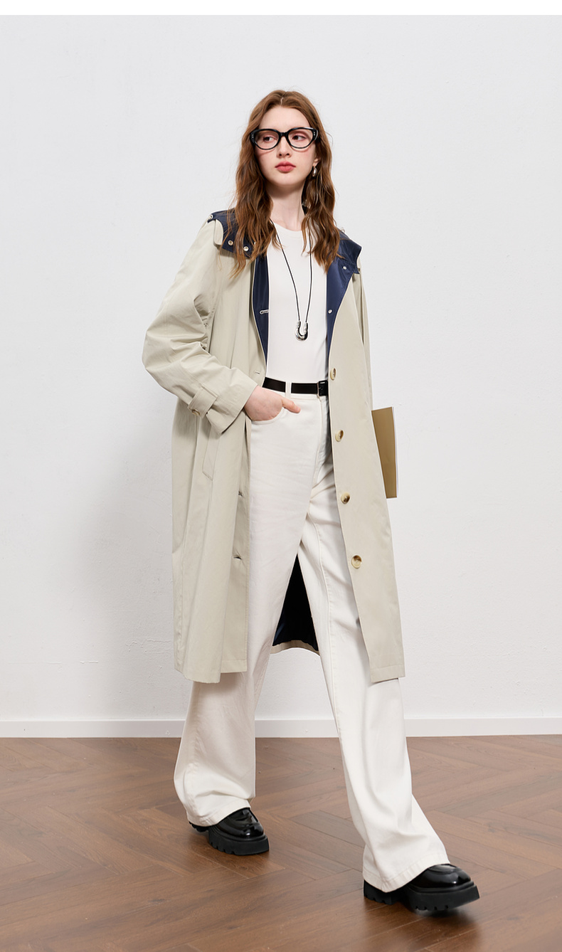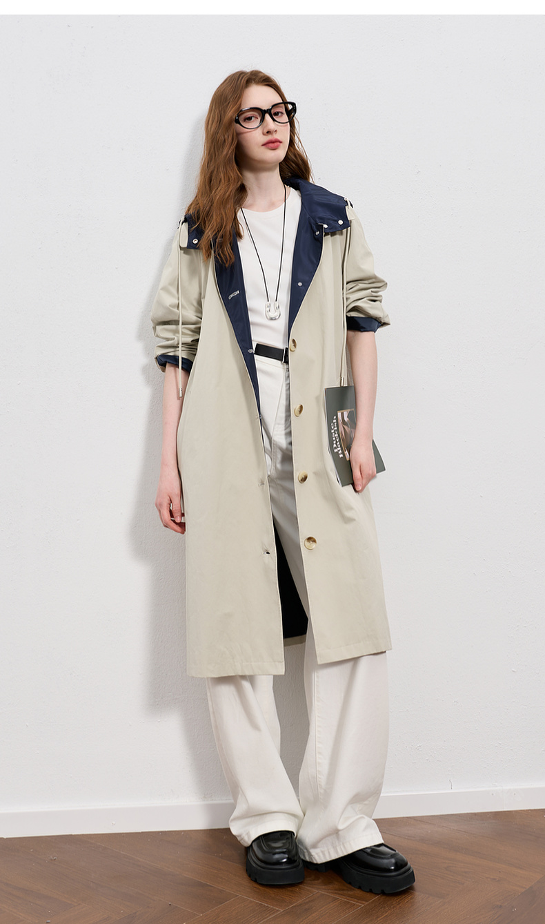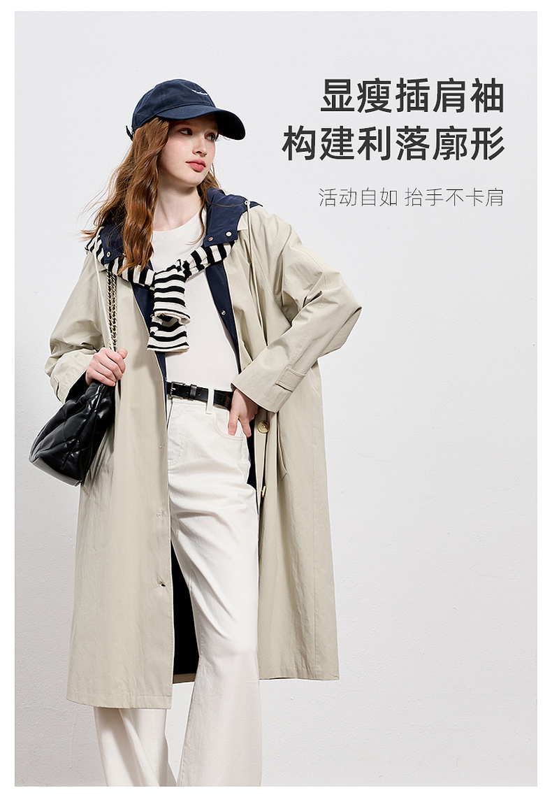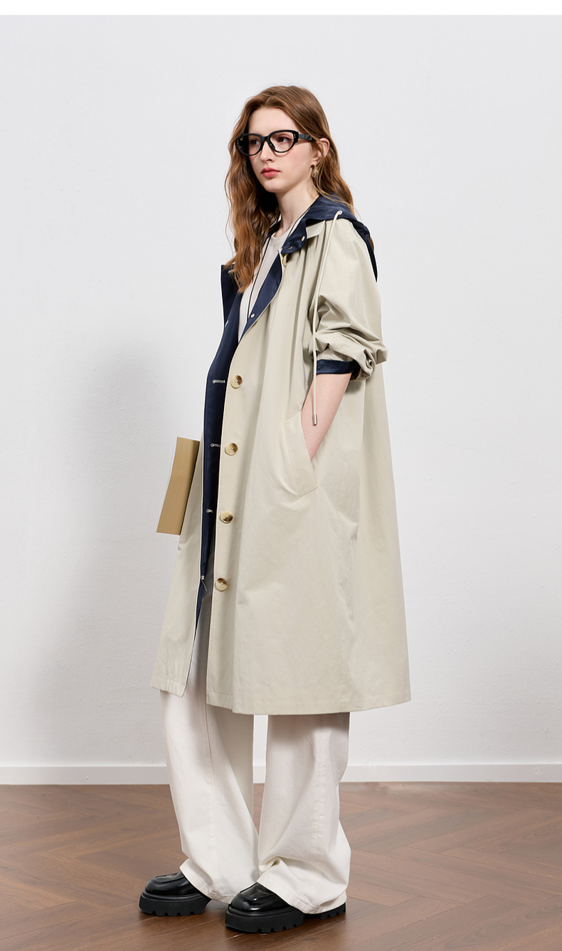 三彩2025秋季新款宽松长款连帽风衣外套长袖休闲气质通勤简约S