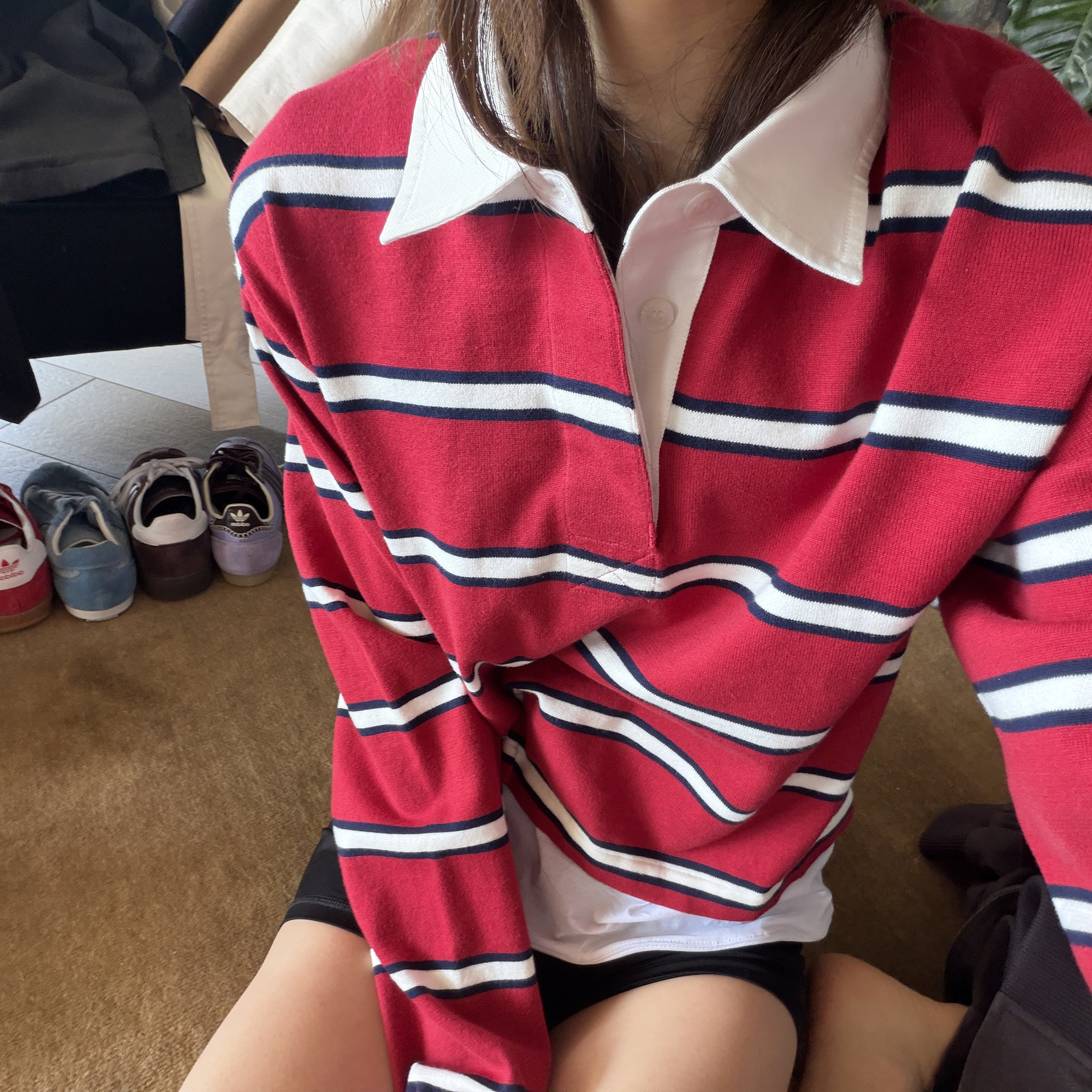 ROMI STUDIO“美式氛围”红白撞色条纹全棉长袖针织上衣RWDSS92031