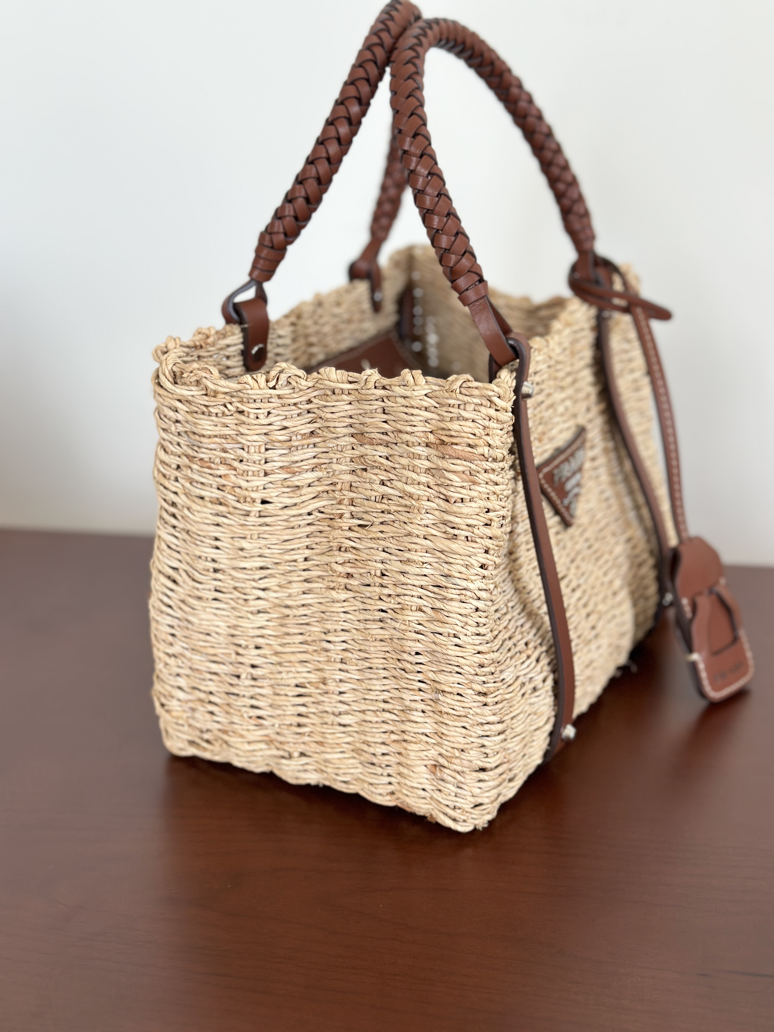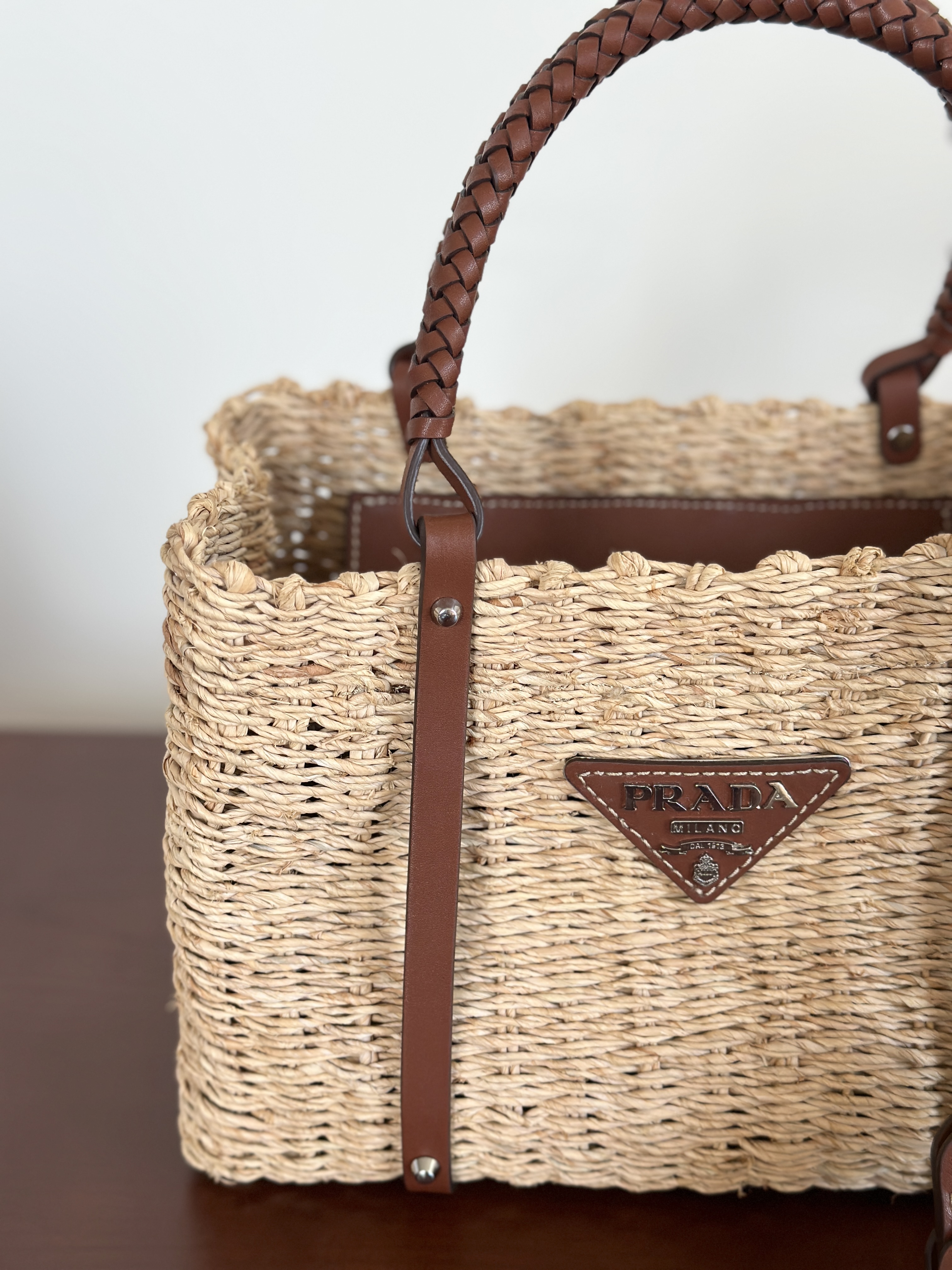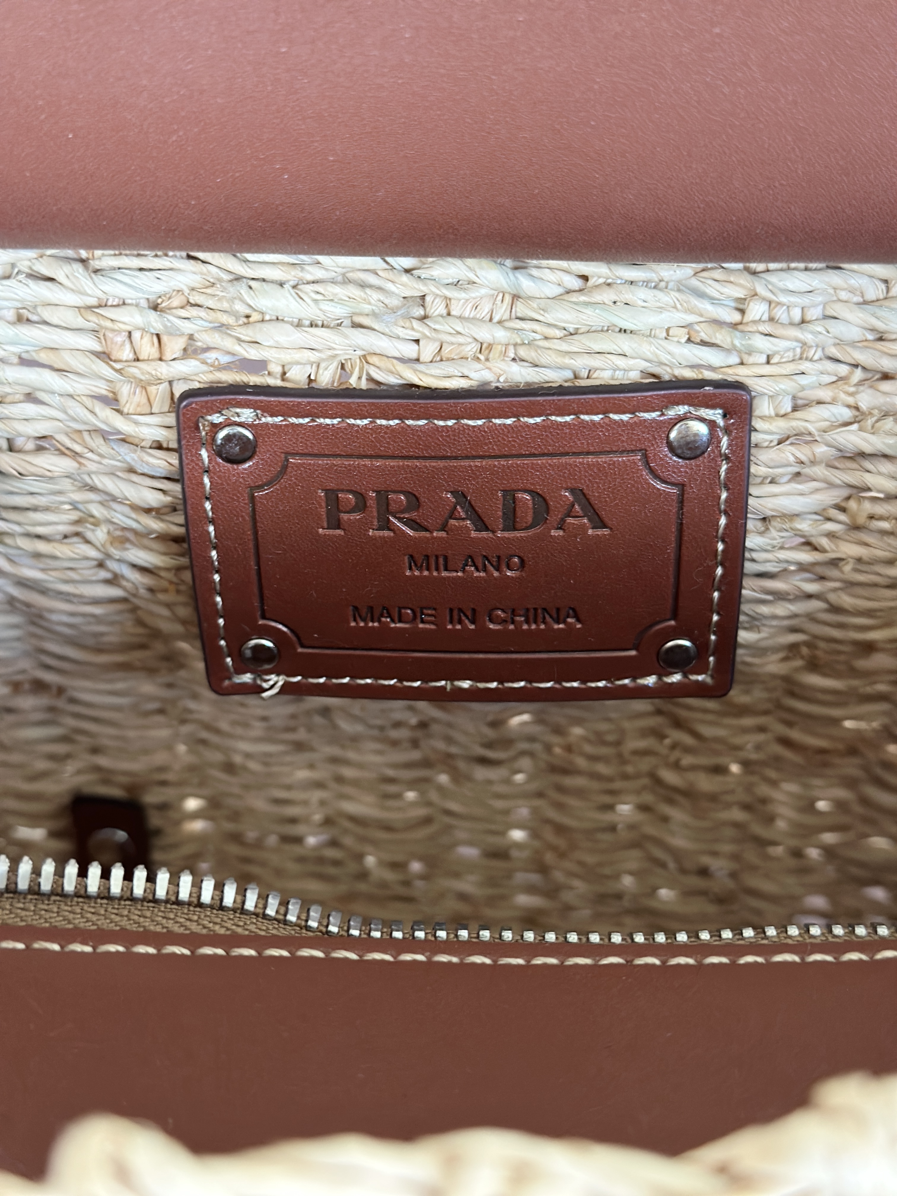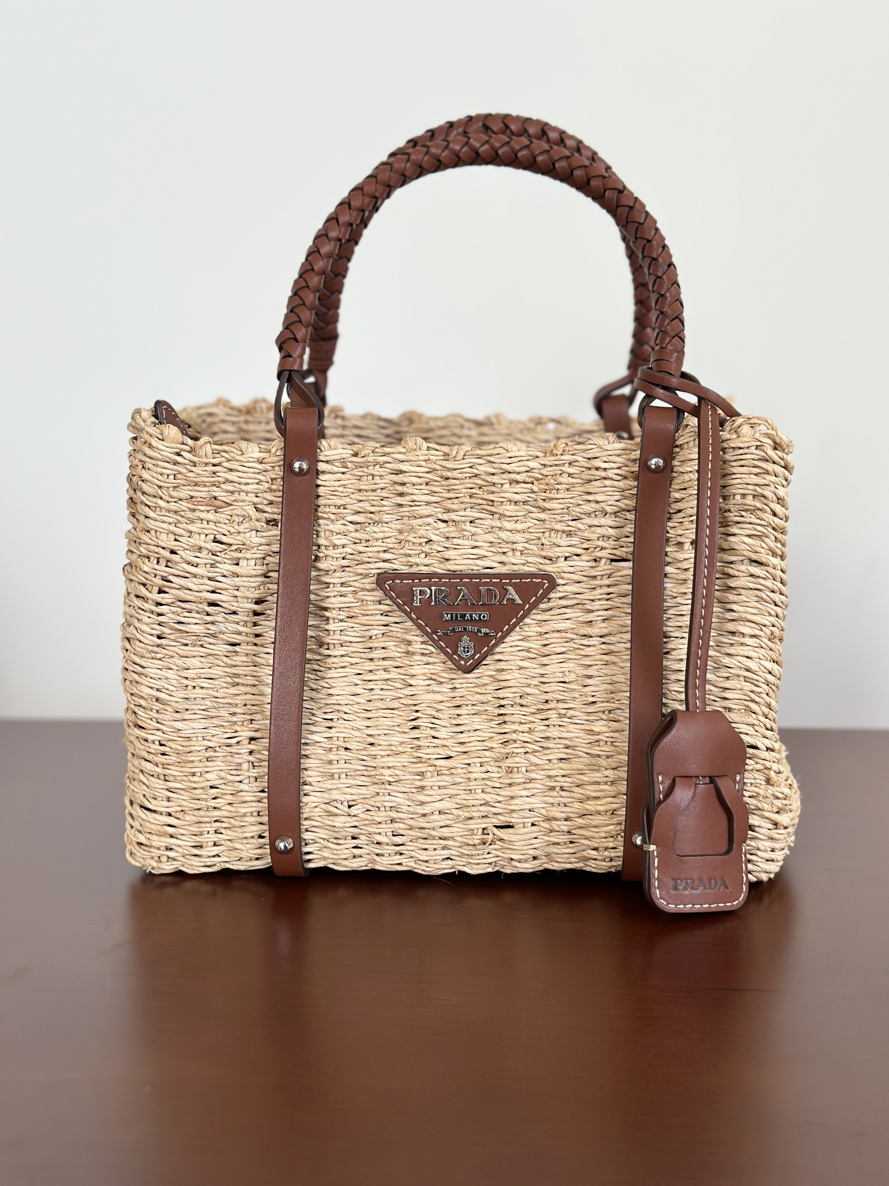 普拉达光滑牛皮和稻草 手提包 男女同款情侣款 米色