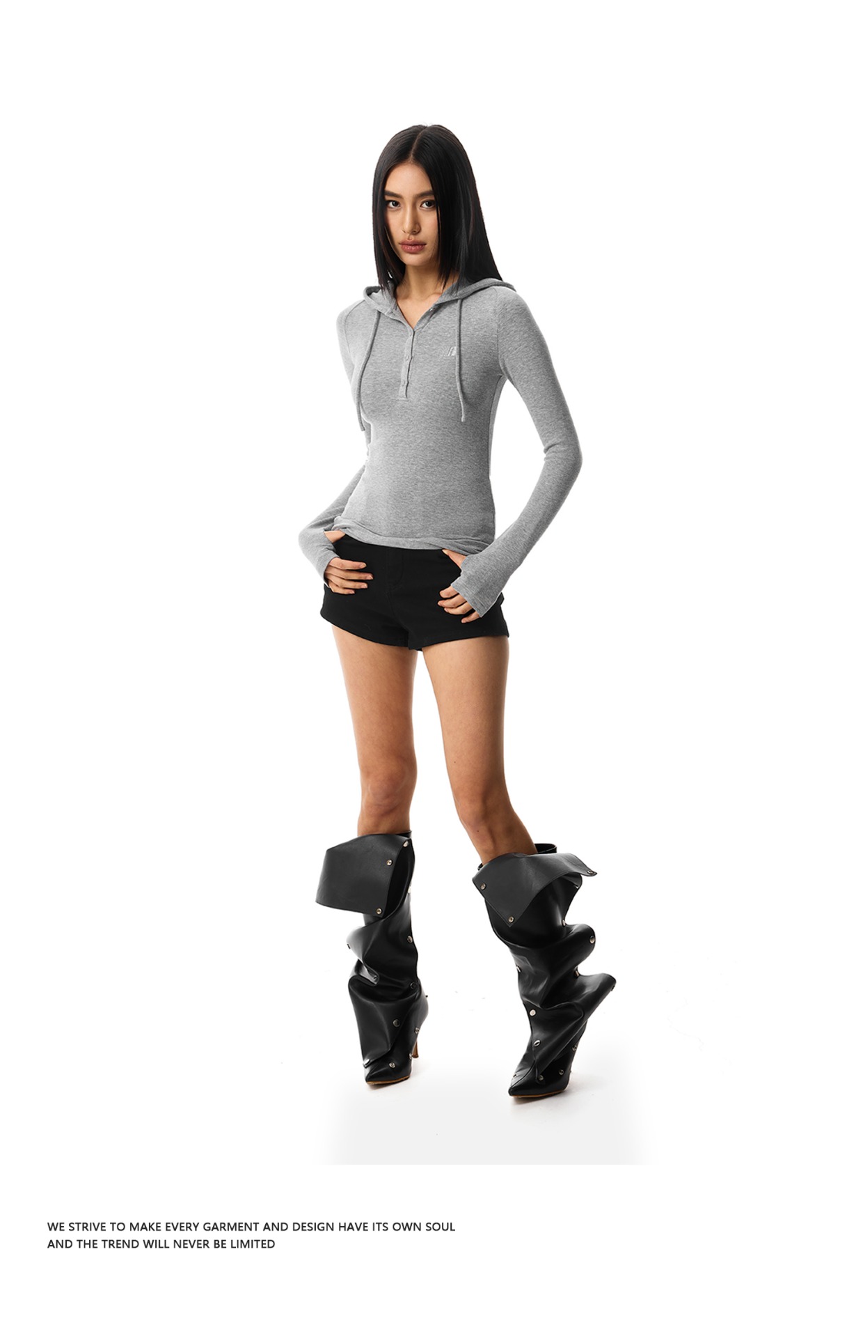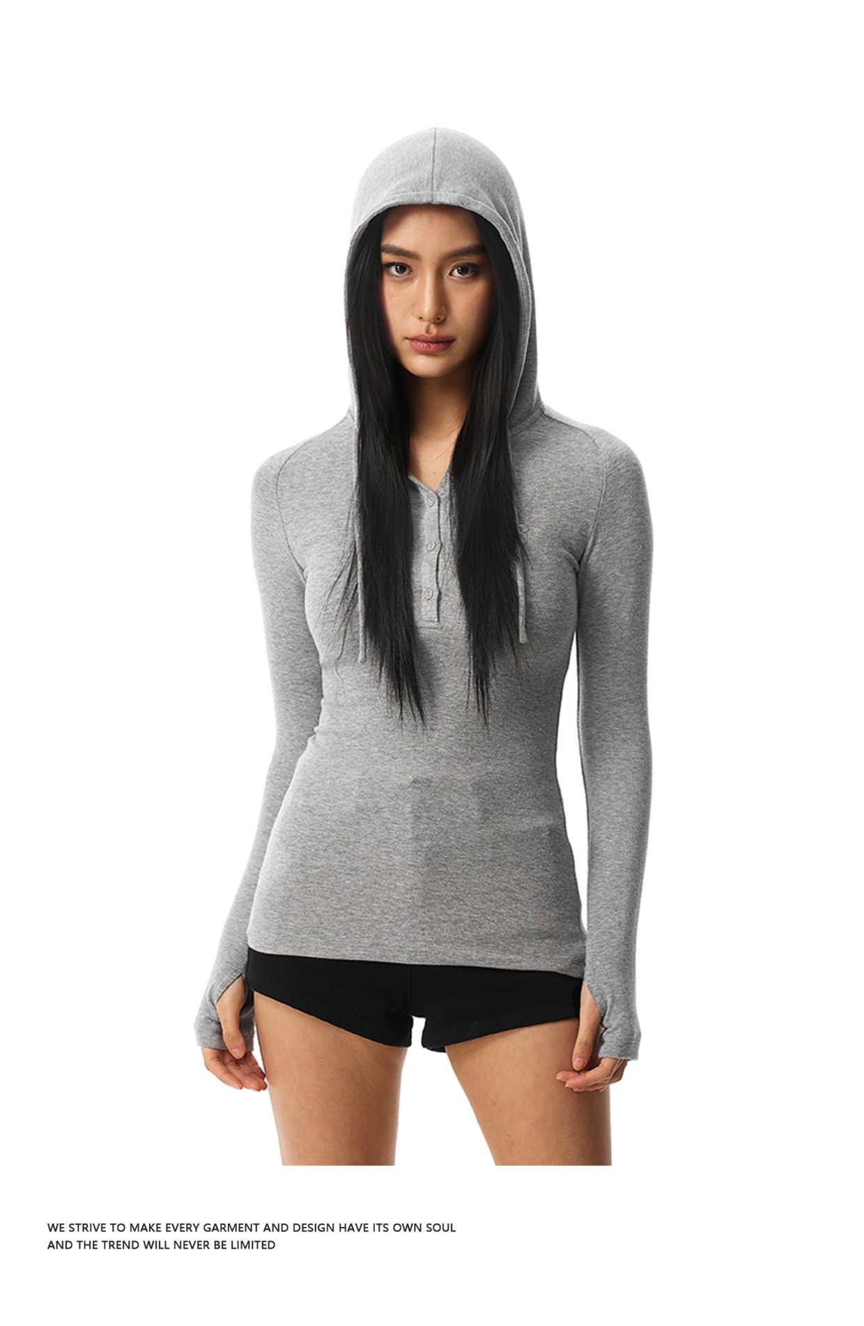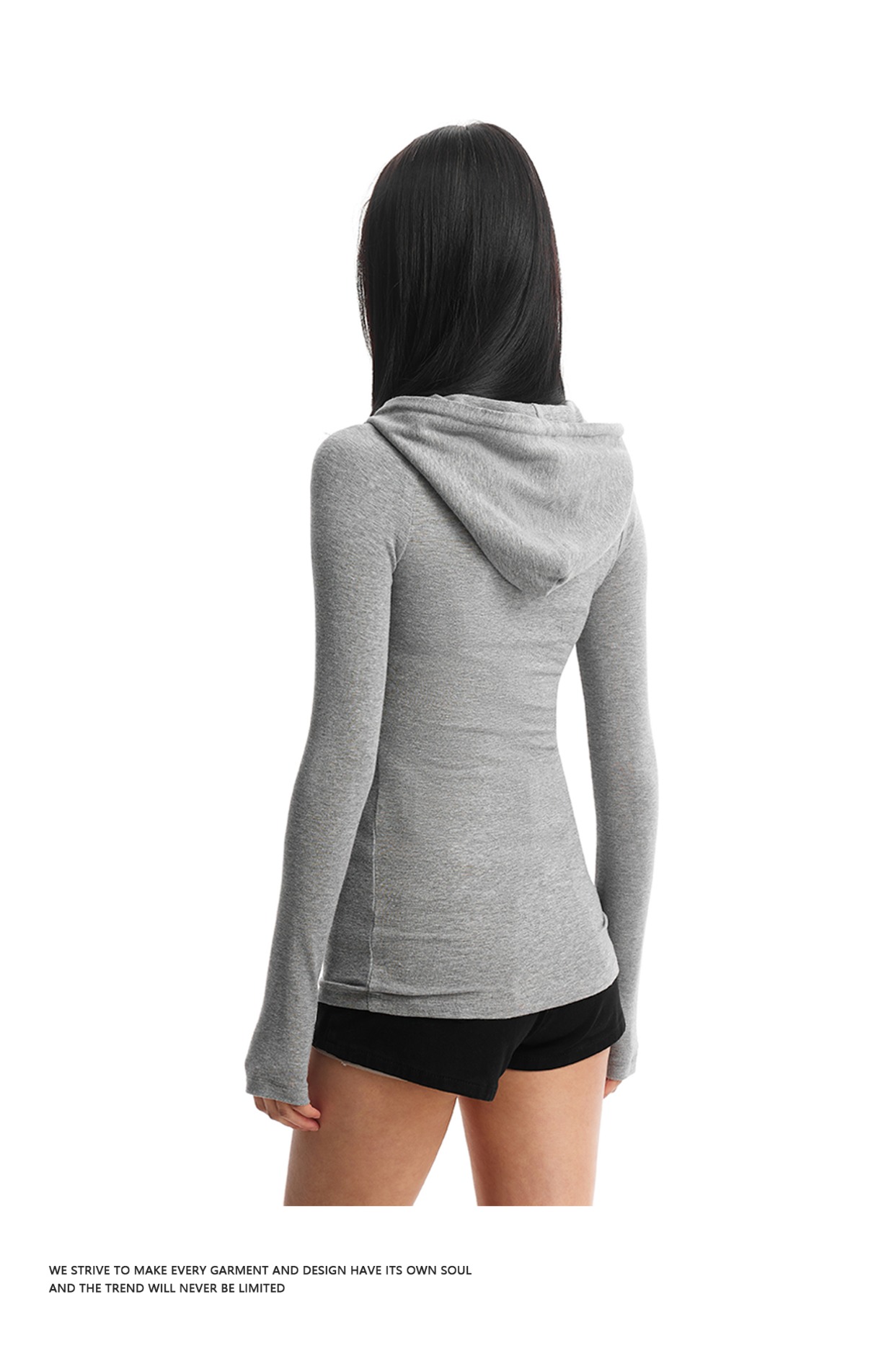 FDR官方店 辣妹V领纽扣可调节连帽长袖t恤女春季修身显瘦打底上衣