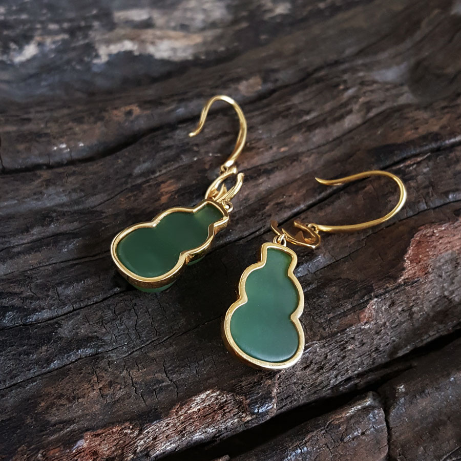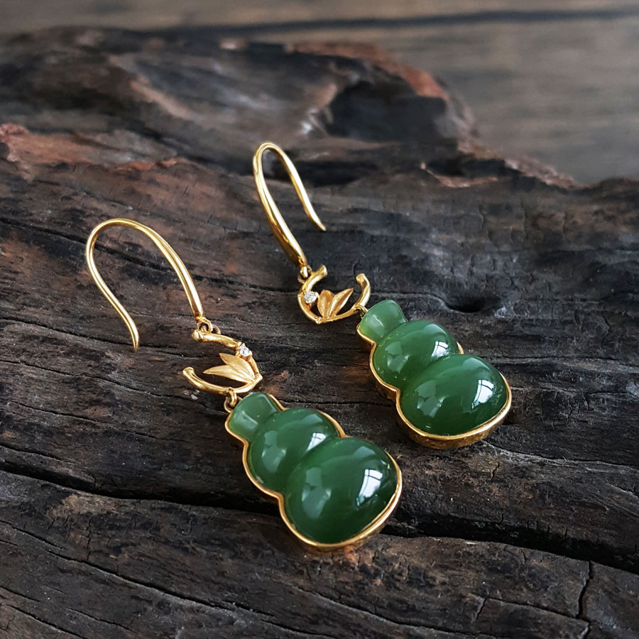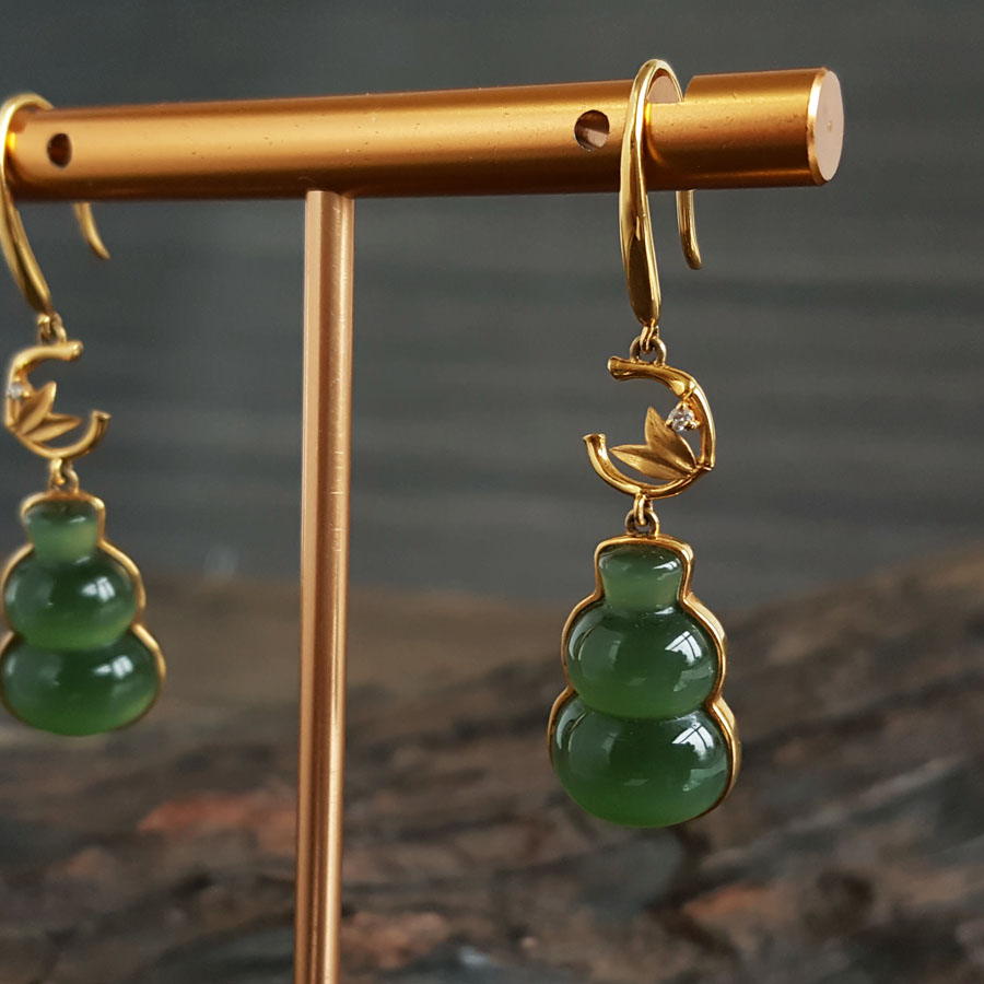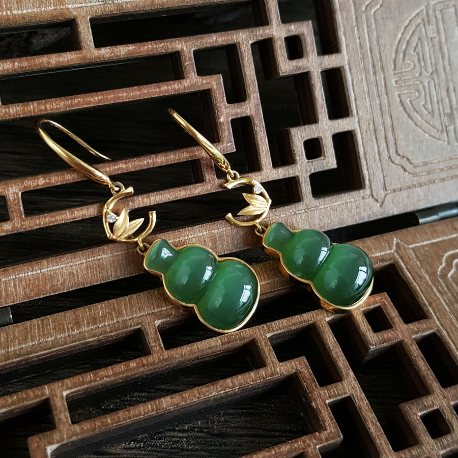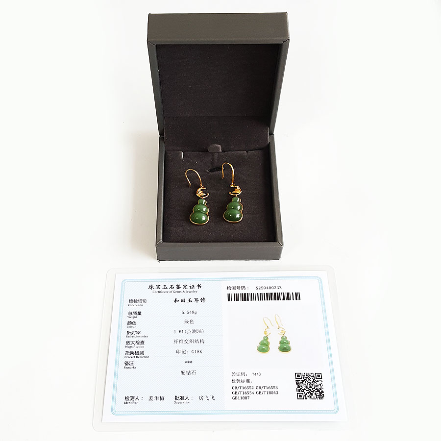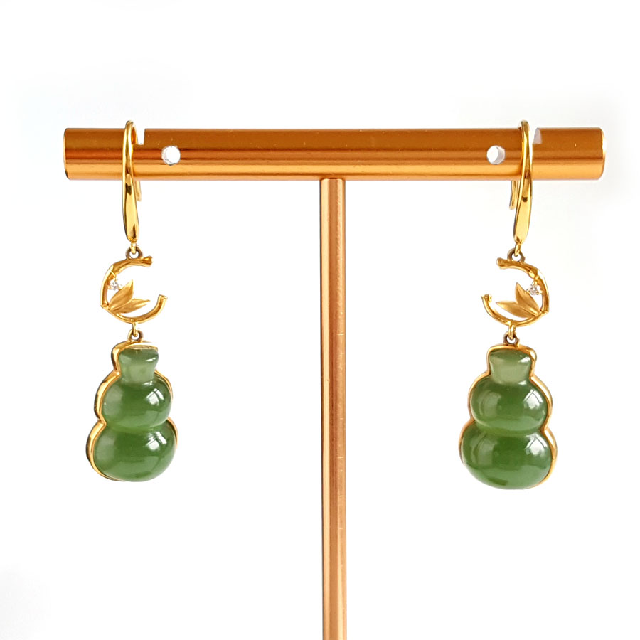 【天然正品】AU750黄金镶钻镶天然葫芦造型碧玉猫眼耳坠42.9*11.8*5.9MM(皆取最大值)女士现售价:2480!260325NJS37