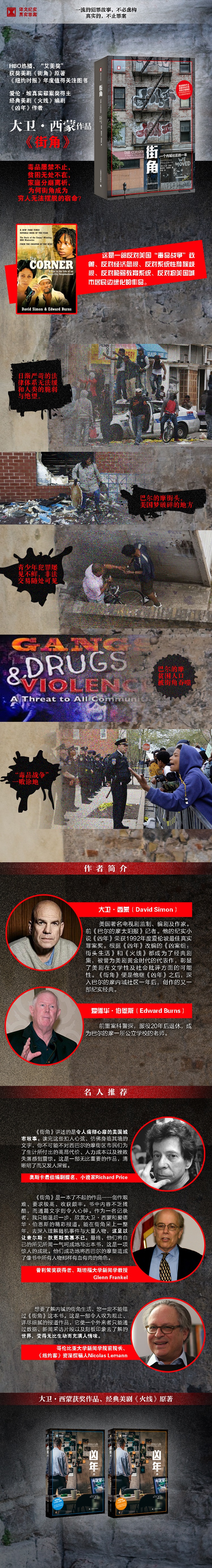 大卫•西蒙,美国著名电视剧监制、编剧及作家。前《巴尔的摩太阳报》记者。他的纪实小说《凶年》荣获1992年度爱伦坡最佳真实罪案奖。根据《凶年》改编的《凶案组:街头生活》和《火线》都成为了经典剧集,被誉为美剧黄金时代的代表作,彰显了美剧在文学性及社会批评方面的可能性。《街角》便是他继《凶年》之后,深入巴尔的摩内城社区一年后,创作的又一部纪实经典。