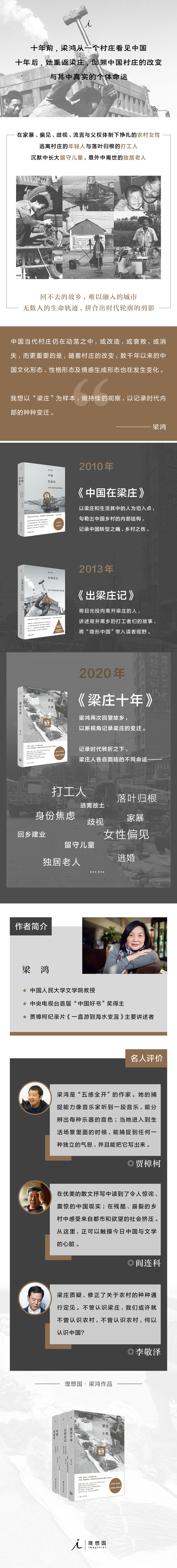 2010年,《中国在梁庄》首次出版,向我们展现了一个急速变化的时代下的中国村庄的变迁。十年之后,作者梁鸿再次回到故乡,重访当年的书中记述的人和事。十年当中,一切都在发生改变,又似乎全无变化:一些人永远离开了这里,一些在外漂泊的人重返此地,村庄的面貌、河流和土地都与从前不同。而人事变幻之中,梁庄和梁庄人所透露出的生机和活力却不减当年。此次回归,梁鸿用全新的视角重新审视了自己的家乡,以细腻的描写和敏锐的洞察,将梁庄的人们再次带回我们的视野,并借由对他们生活的追溯,描摹出一个普通村庄绵长而有力的生命线——这生命线既属于那些“生于斯、长于斯、死于斯”的人们,也属于身处同一股时代洪流的人们。