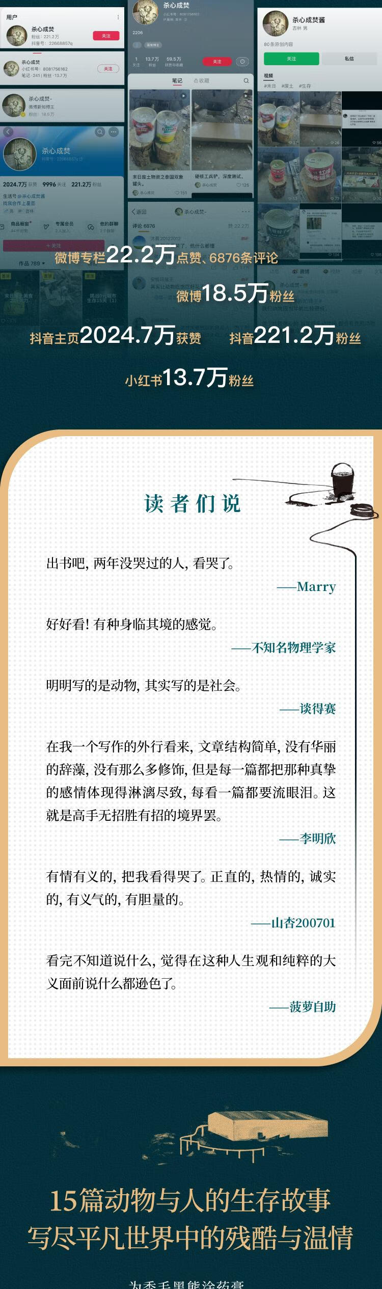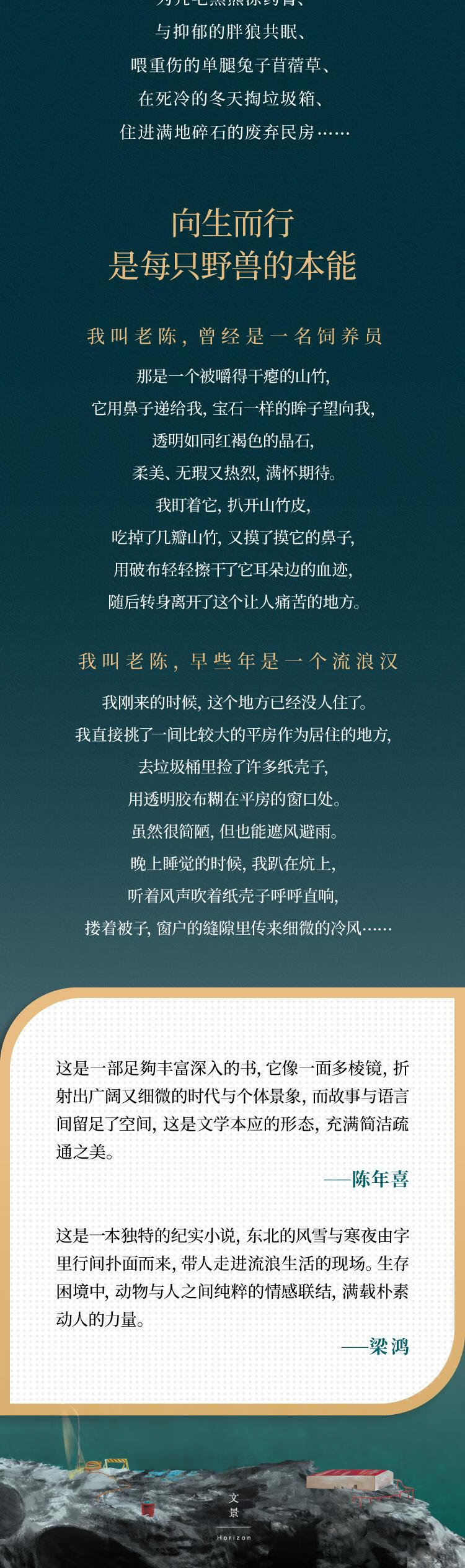 这是一部独特的纪实小说作品集。人气网络作家“杀心成焚”化身“苍海”,游走在虚实之间,以15篇动物与人的生存故事,写尽平凡世界中的残酷与温情。小说集的主角老陈曾是一名饲养员,早些年还有过一段流浪经历。他为秃毛黑熊涂药膏、与抑郁的胖狼共眠、喂重伤的单腿兔子苜蓿草、在死冷的冬天掏垃圾箱、住进满地碎石的废弃民房……这部小说集带人走近东北的大雪和寒夜、受难的动物、被欺凌的弱小人群。尽管这块土地是如此凛冽,但人与人、人与动物互相救助,依然给彼此带来温暖和救赎,用义气与活下去的勇气,书写荡气回肠的东北故事。
