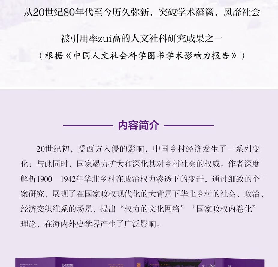 20世纪初,受西方入侵的影响,中国乡村经济发生了一系列变化;与此同时,国家竭力扩大和深化其对乡村社会的权威。作者深度解析1900—1942年华北乡村在政治权力渗透下的变迁,通过细致的个案研究,展现了在国家政权现代化的大背景下华北乡村的社会、政治、经济交织维系的场景,提出“权力的文化网络”“国家政权内卷化”理论,在海内外史学界产生了广泛影响。