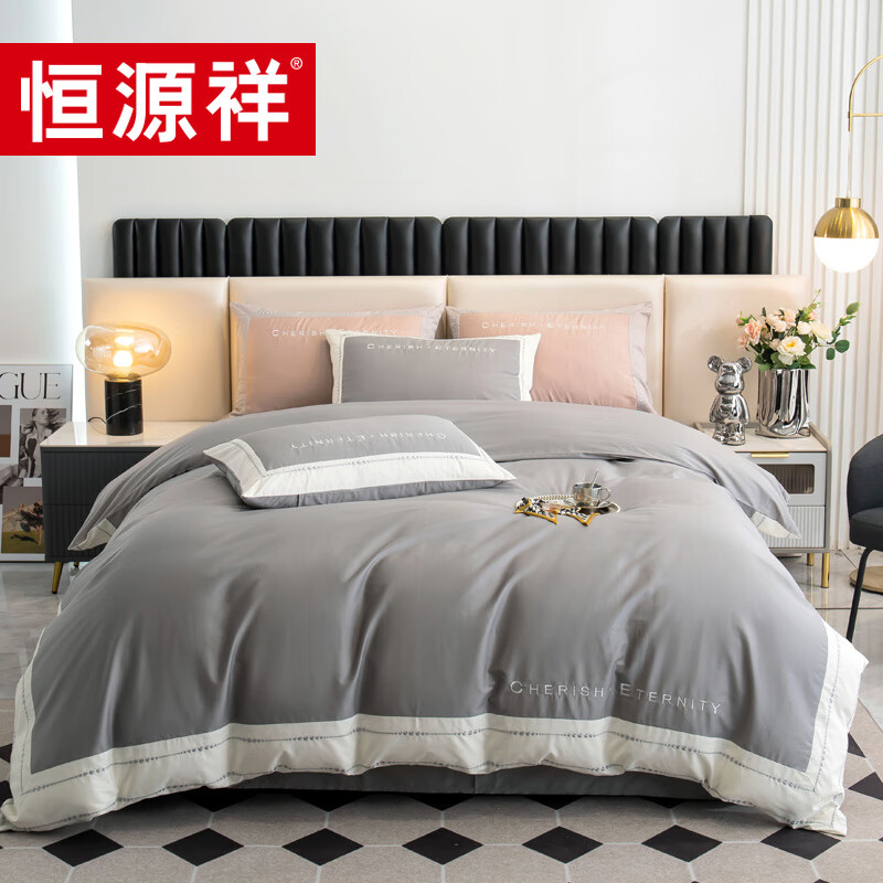 恒源祥(HYX) 恒源祥礼业TBK3016 80支长绒棉纯色绣花四件套-尼克斯(灰白) 220*240