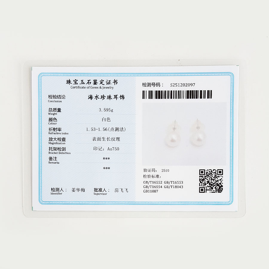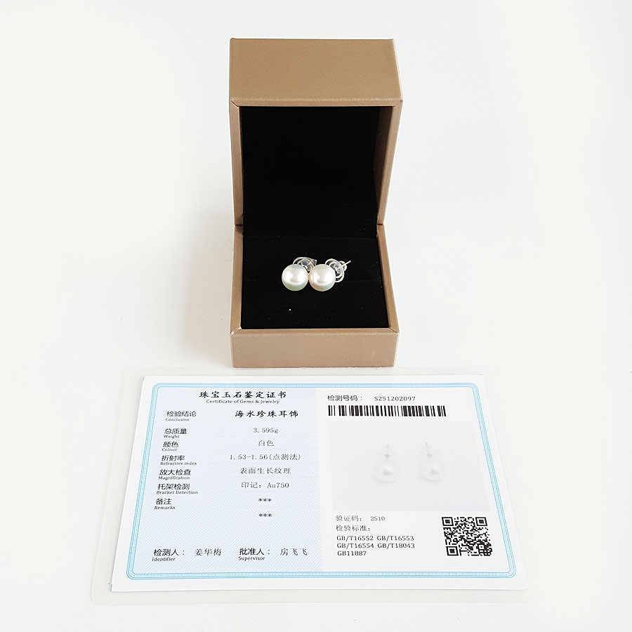 【天然正品】AU750白金镶天然约10MM近正圆无暇澳白海水珍珠耳钉21.6*10.0*10.0MM (皆取最大值)311225NJM61特价:1880