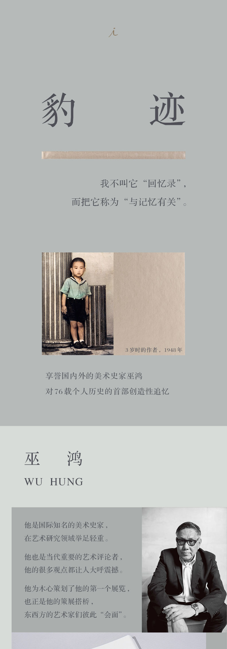本书是巫鸿先生对76载个人历史的首部追忆。他突破一般回忆录式的写作,呈现给读者的既不是真实的往昔本身,也不是小说式的全然虚构,而是一种创造性的经验重构与想象,一种更为自由和开放的“记忆写作”。