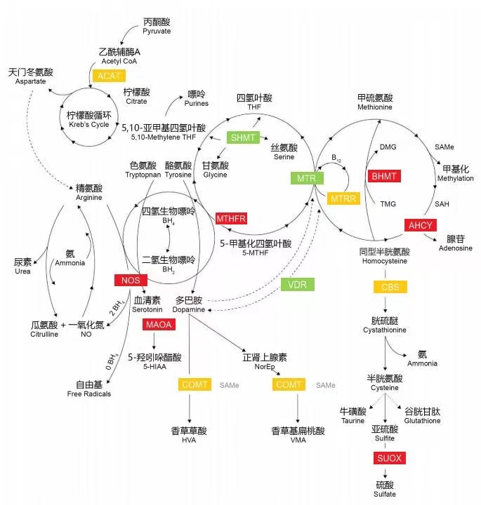 ③尿素循环:通俗的说是处理人体废水和垃圾的,存在突变会导致毒素蓄积在体内,造成肠道菌群不正常滋生、自由基攻击神经元、脑细胞,造成情绪和认知功能退化。
