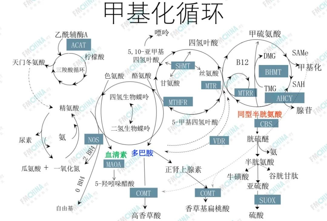④甲硫氨酸循环:为超过四百种甲基化反应提供甲基,与叶酸循环、肝脏解毒、尿素循环排毒紧密关联。