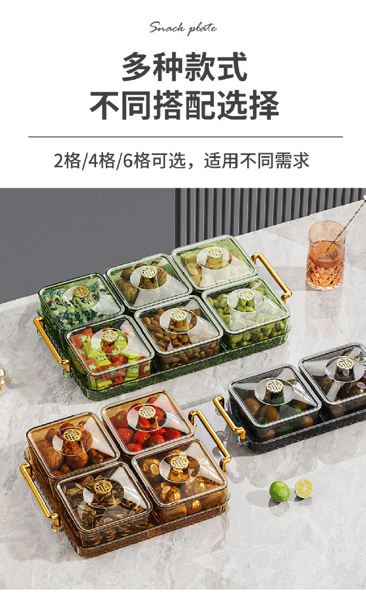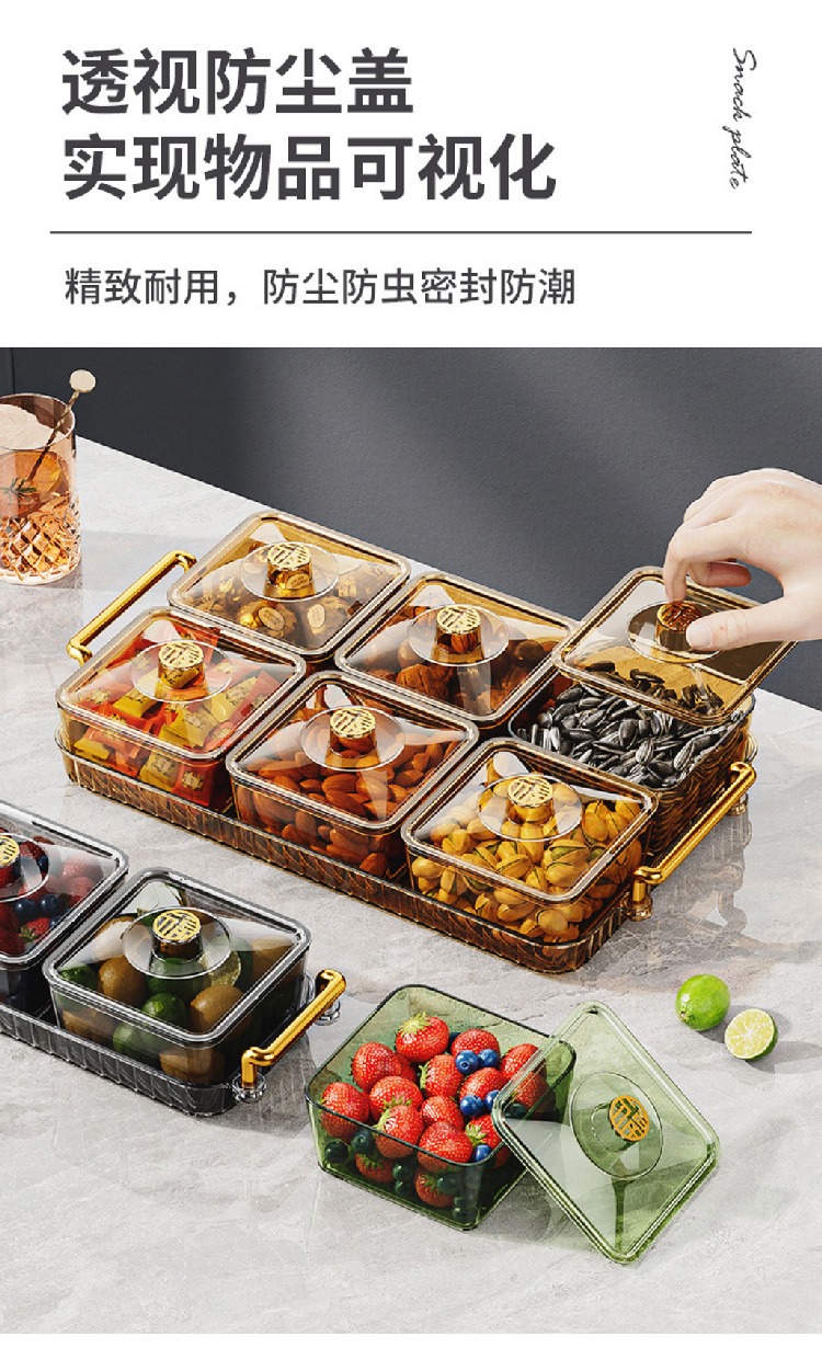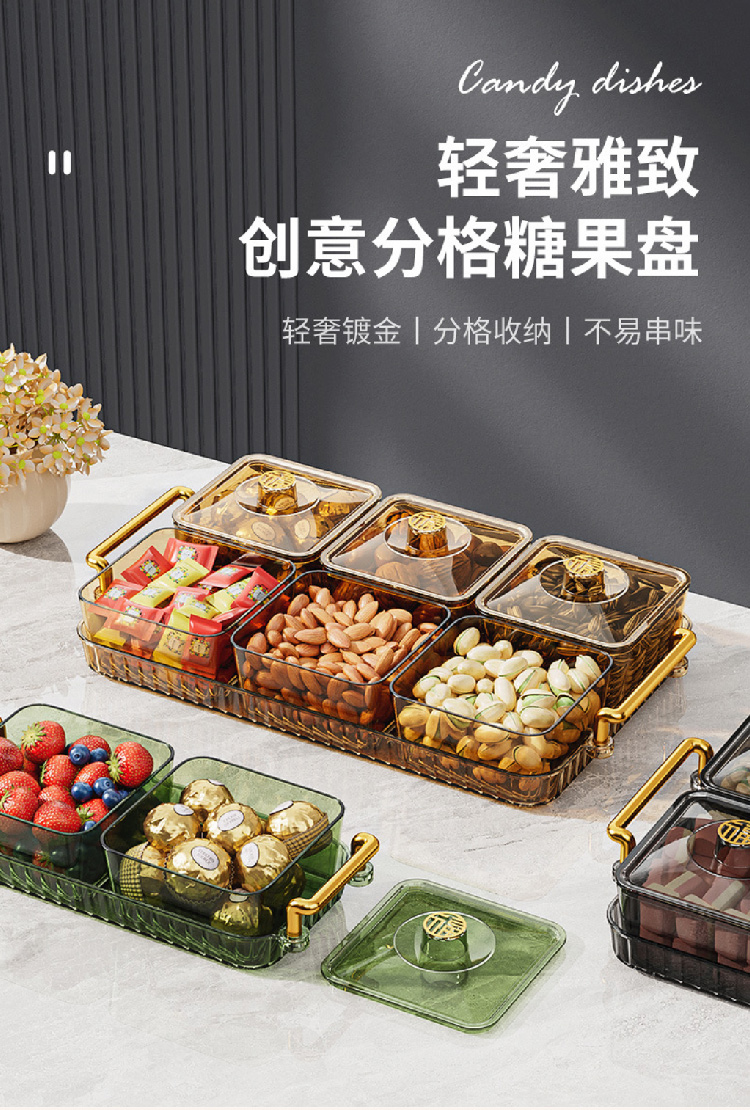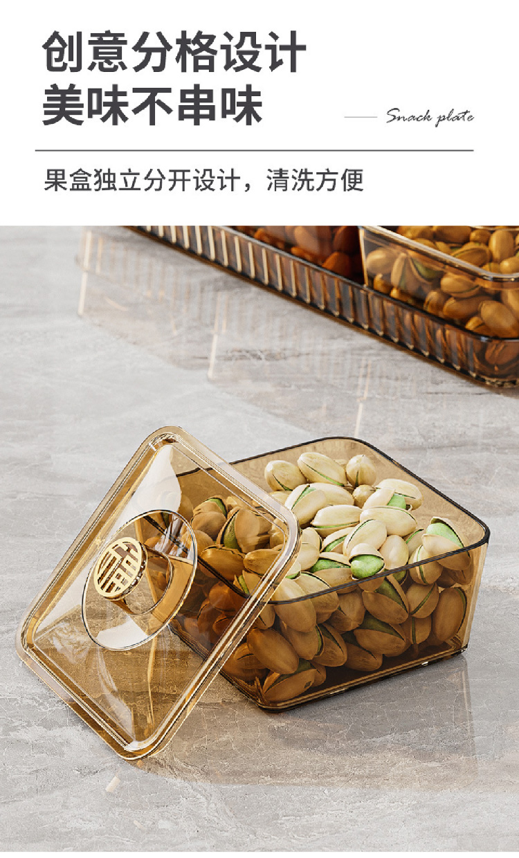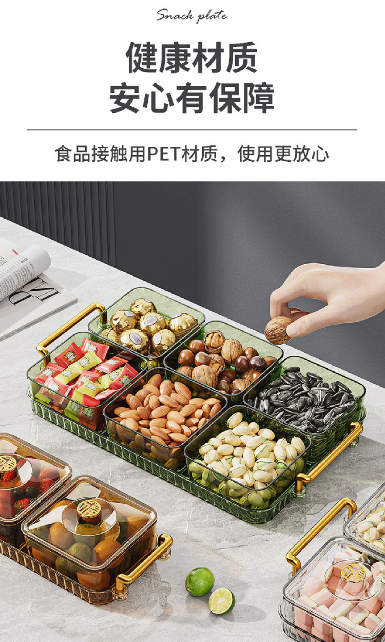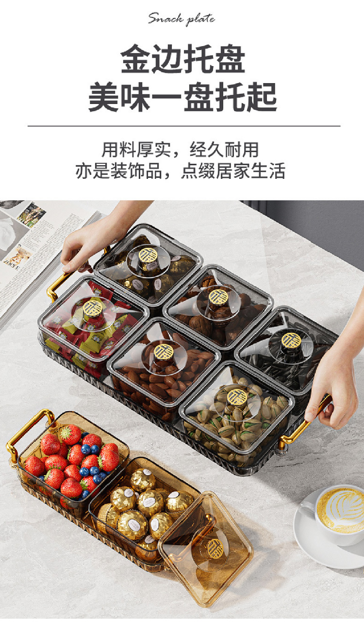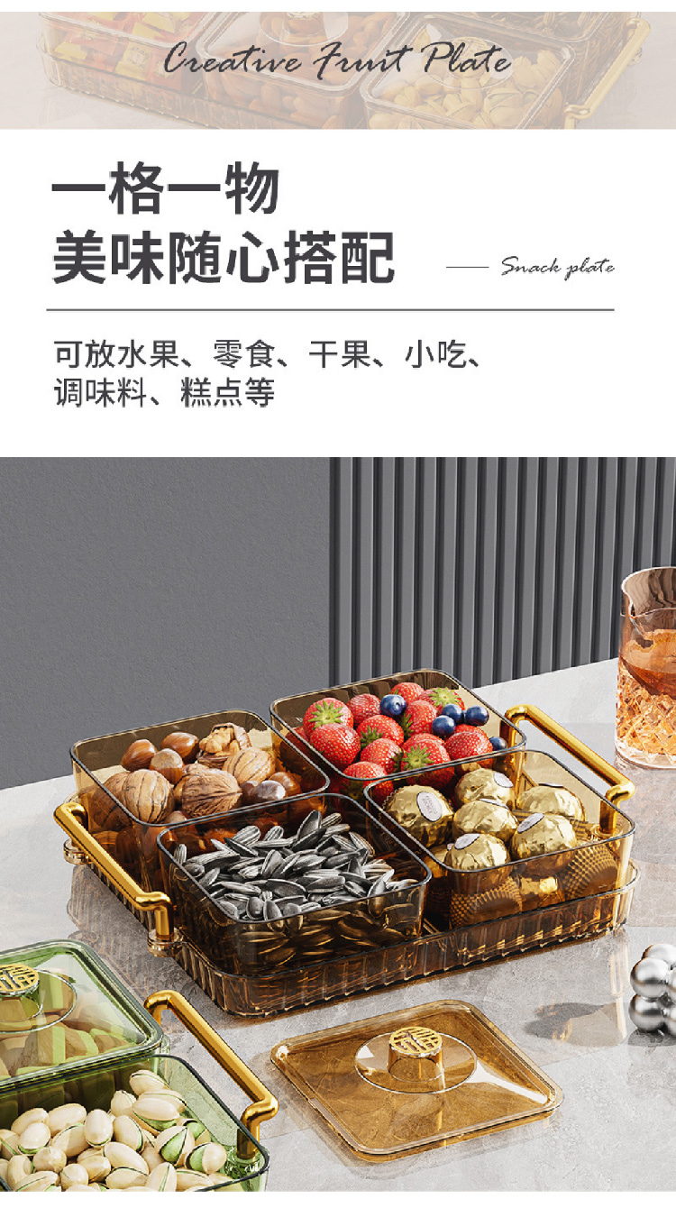 轻奢带盖分格果盘零食拼盘家用塑料托盘客厅水果拼盘零食盘子