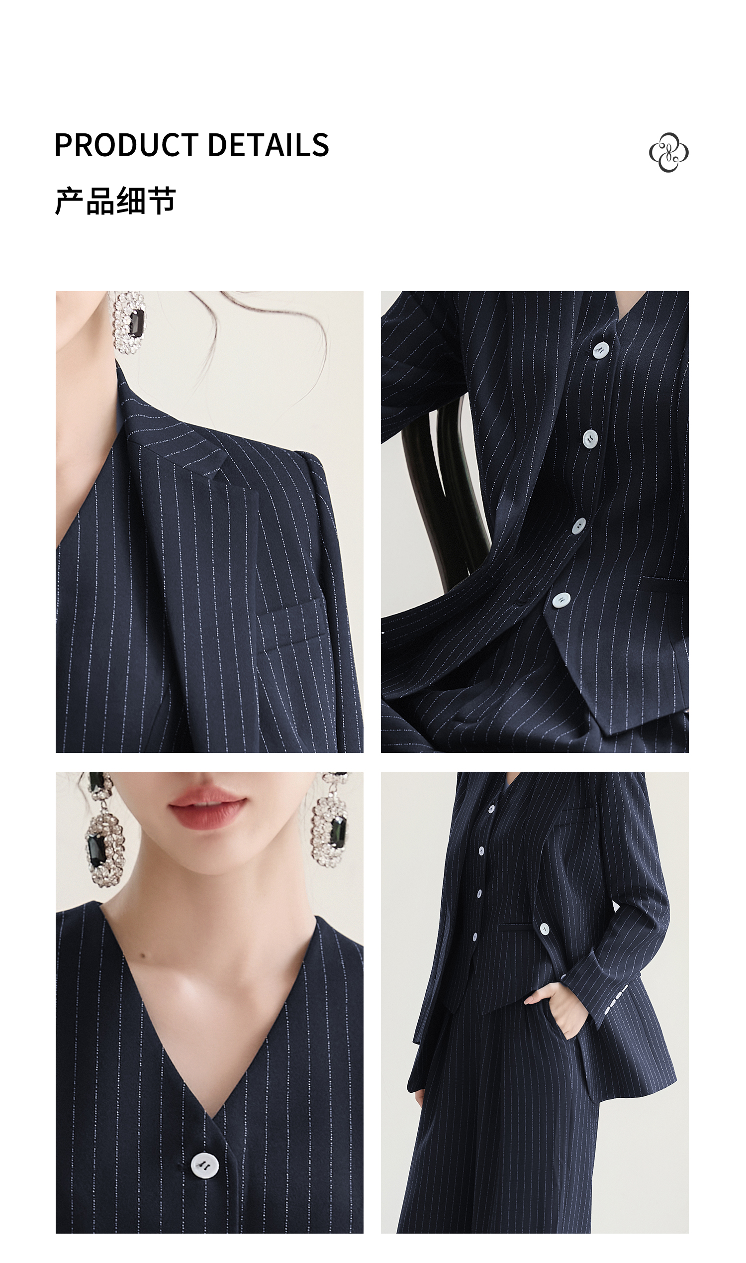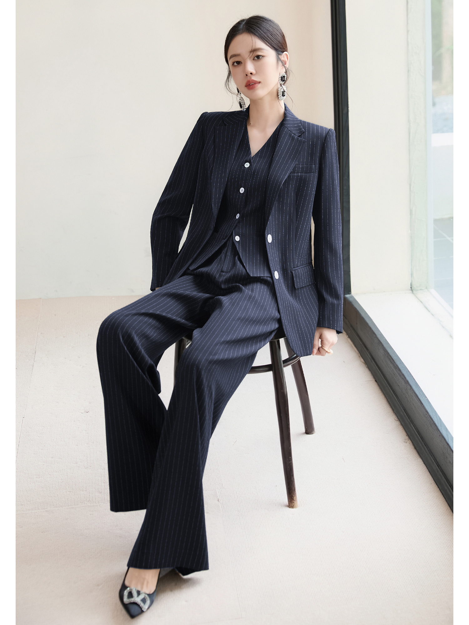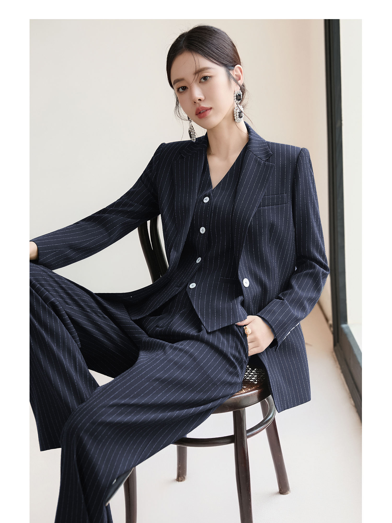 FUYAO扶摇 藏青色条纹西装套装女秋2025新款高级感西服马甲三件套