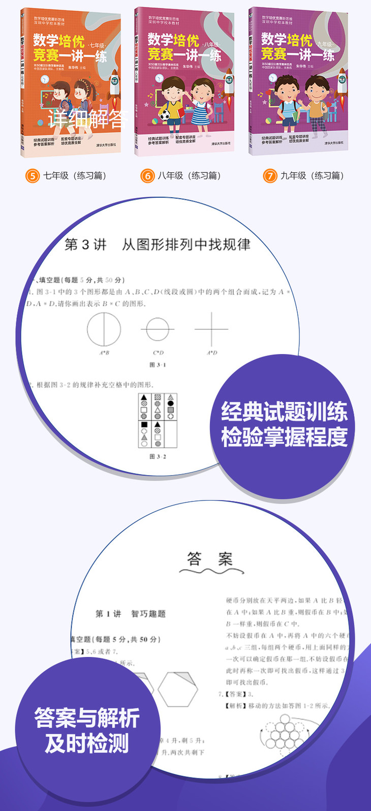 数学名言欣赏:以名人名言开宗明义,开启每讲的数学学习之旅;知识方法扫描:概括竞赛数学的相关知识、方法与技巧,突出重点、难点和赛点;典型例题解析:(以8年级“讲座”为例)含“分析”、“解”和“评注”,例题总个数控制在8道,由基础题(3道中考难度的试题)、提高题(3道全国初中数学联赛一试难度的试题)、综合题(2道全国初中数学联赛二试难度的试题)组成;很多例题的解答之后有评注,评注的作用是对某些问题或解答过程中意犹未尽之处进行阐述分析,起到画龙点睛之效;对可进一步深入研究的问题予以拓展引申,意在引导学生去创造;对一题多解的问题提出相关的解法,沟通特技与通法之间的联系.总之,评注的目的在于,一方面揭示问题的背景和来源,另一方面启迪学生发现解决问题的思路及通过合理猜测提出新问题的方法,使学生不仅知其然,更知其所以然,以期达到授之以渔的目的. 同步训练:含选择题、填空题、解答题,为方便自学,在书后每题均给出详细解答过程. |