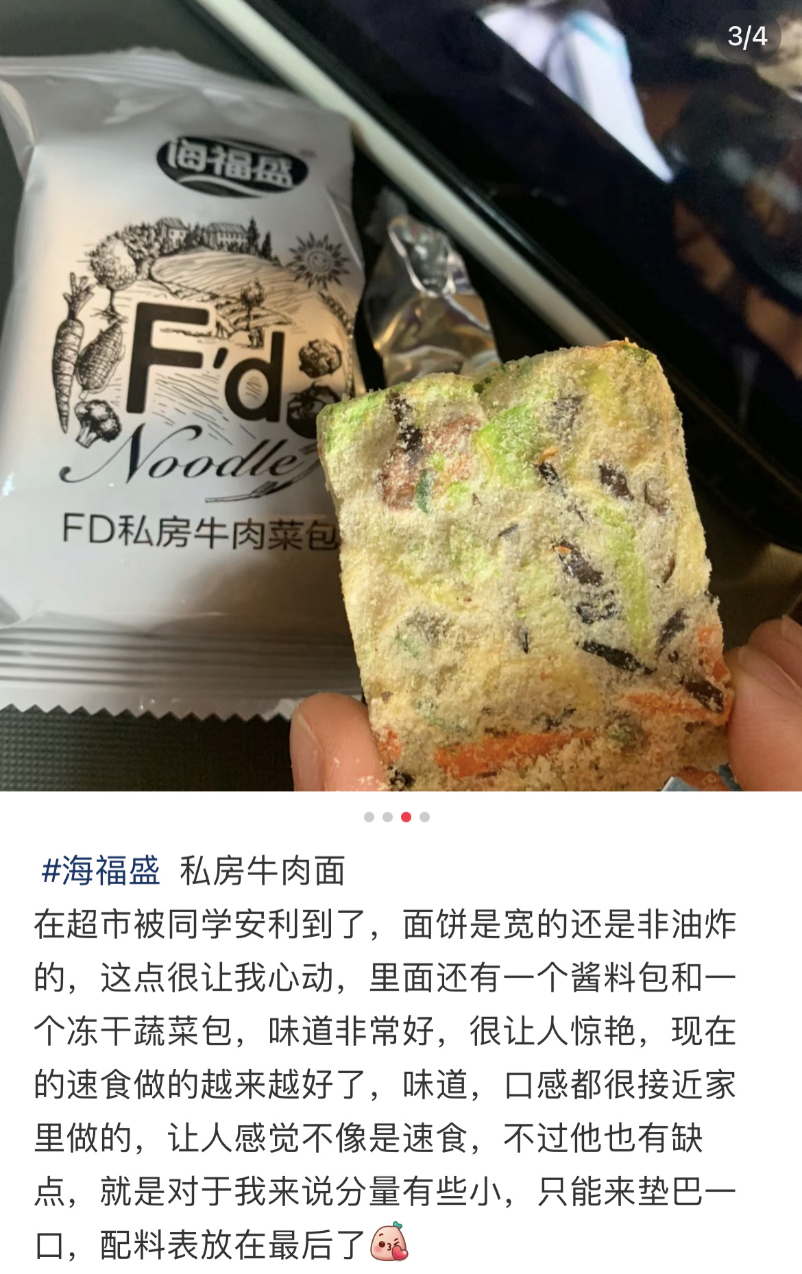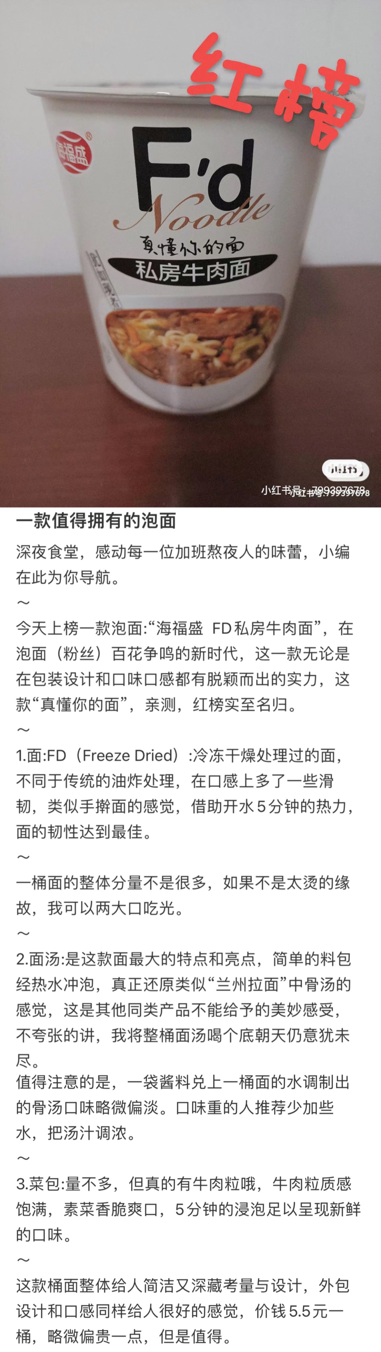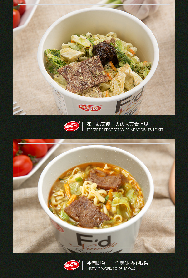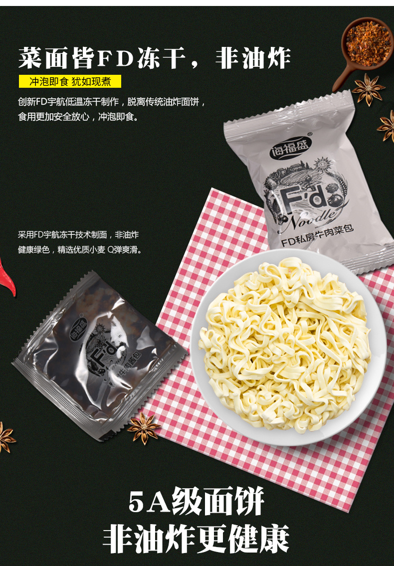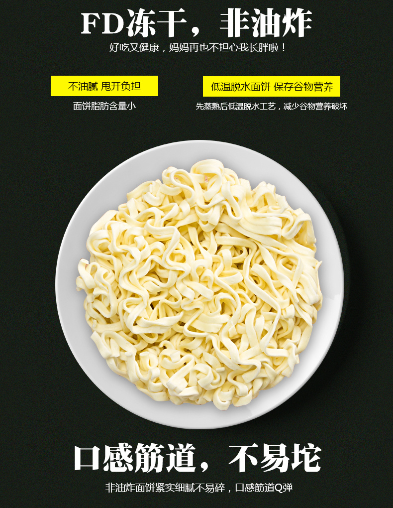 海福盛作为冻干速食品牌,主要就是做高端速食冻干粥、冻干面、冻干粉丝 、冻干汤和冻干水果等,在一些商超也能见到。冻干面跟一般泡面是完全不同的,可以说是第三代速食。FD冻干技术,以前大多用在宇航食品上,现在也被越来越多的食品公司用在民用食品的生产中。这种冷冻真空干燥技术,让方便面摒弃了传统的调味料粉包和脱水蔬菜,大大降低了泡面工业香精味,用开水泡5分钟就能还原一碗真的有丰富配菜的面条!