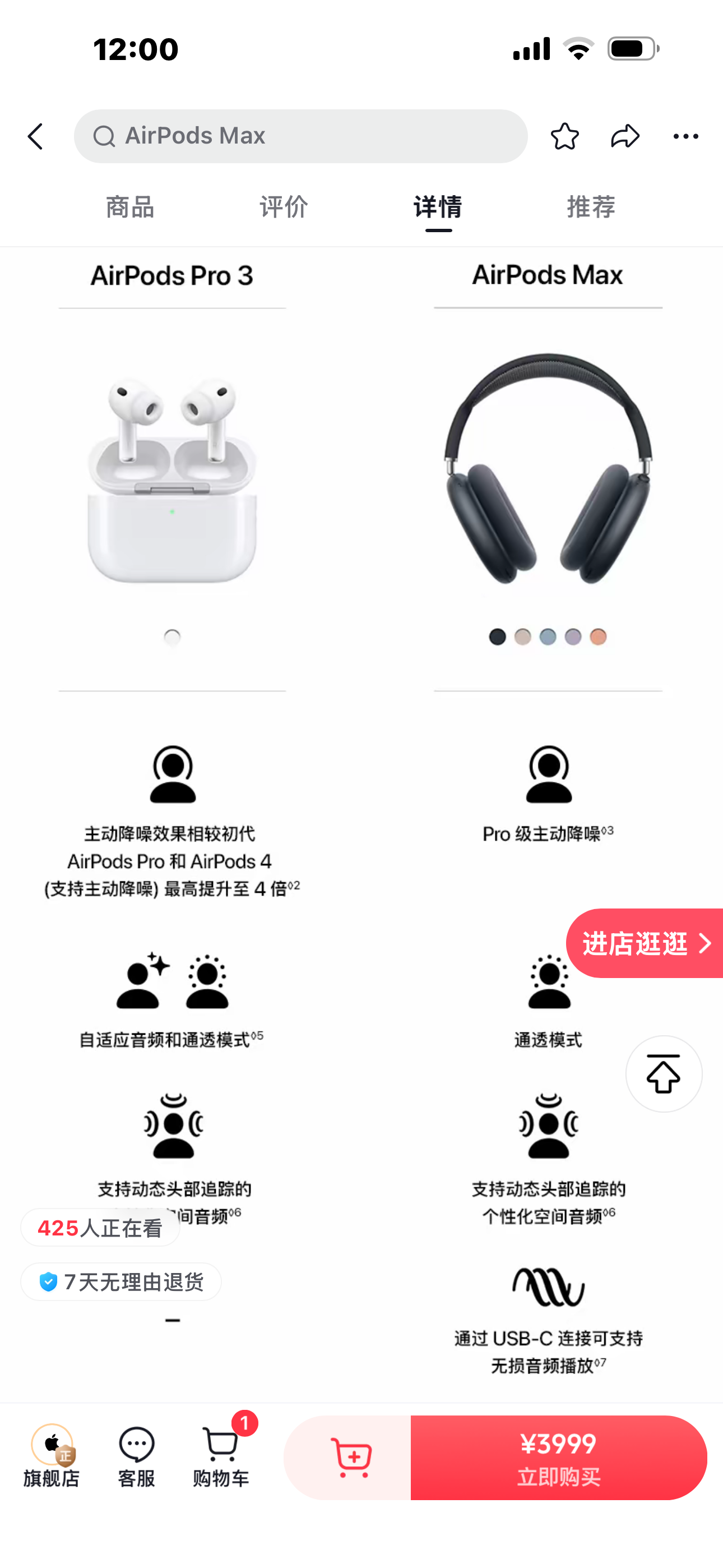 4色!三个月换新,保修一年。苹果airpods max pro主动降噪无线蓝牙头戴式耳机
