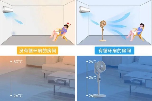 循环扇可以帮助空调将空气搅动到房间每个地方
