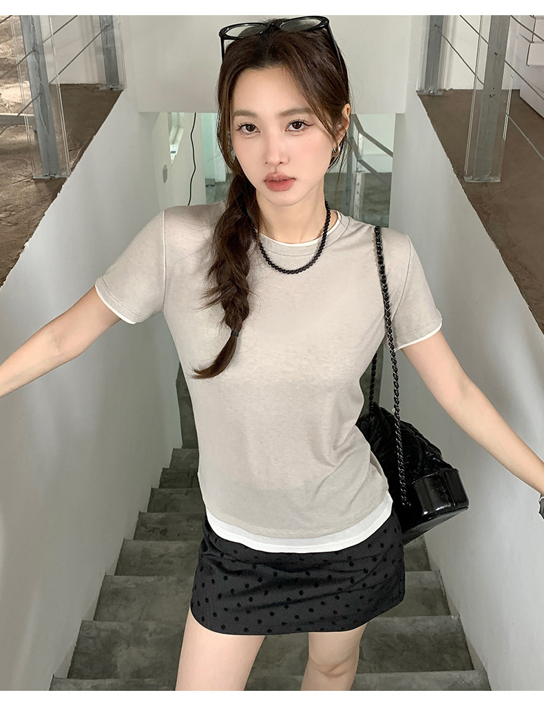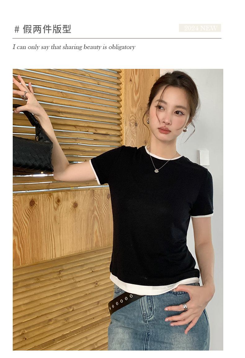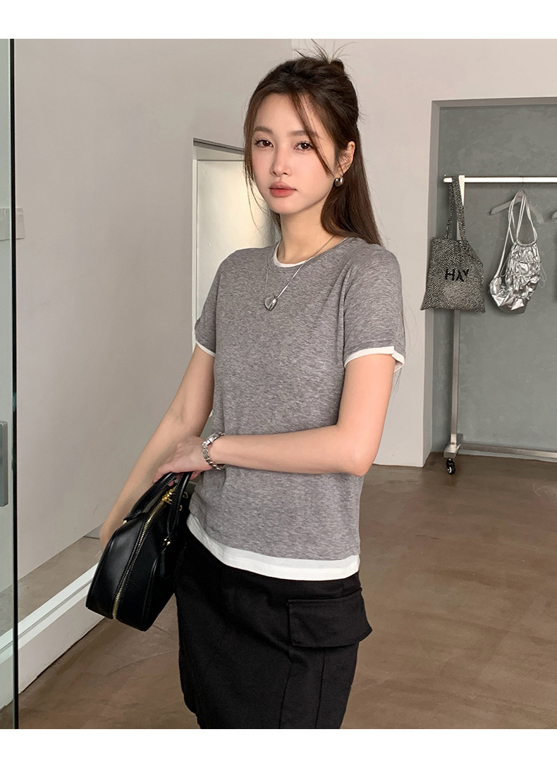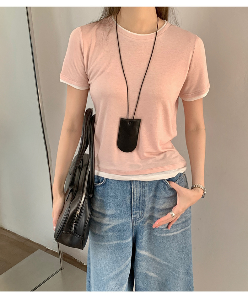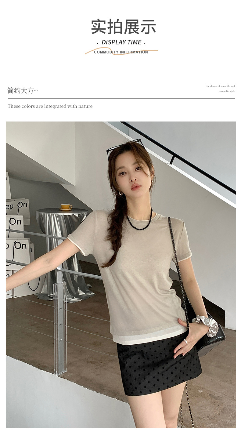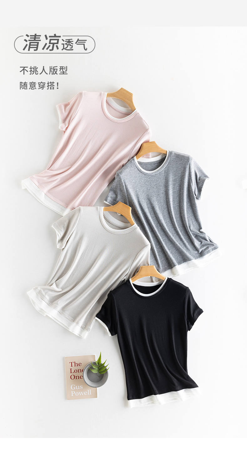 新款兰精天丝打底衫女假两件圆领短袖上衣夏季修身百搭显瘦t恤_ym