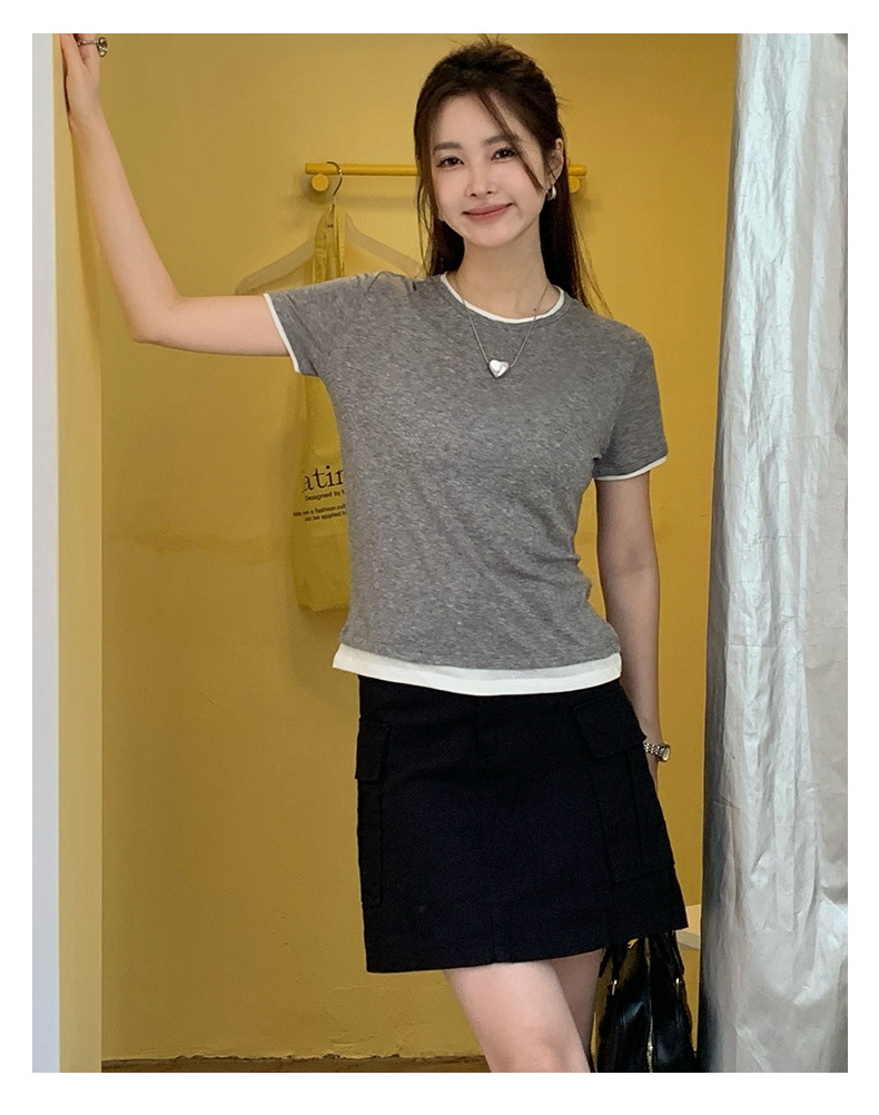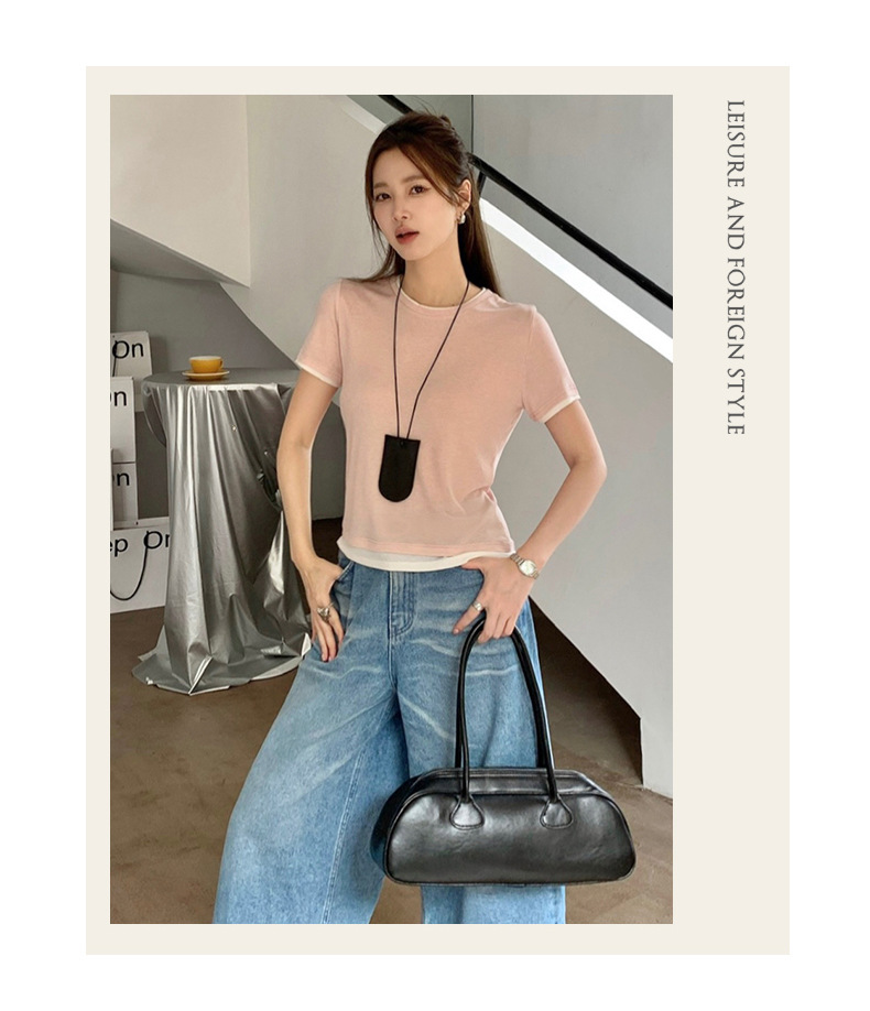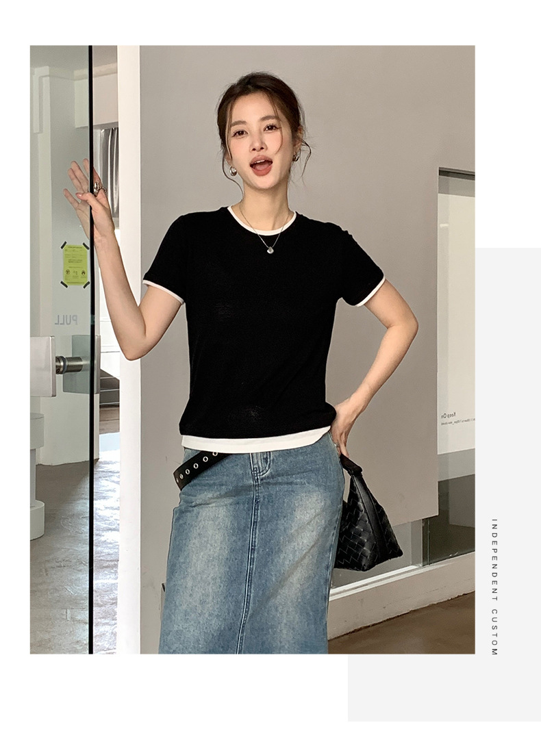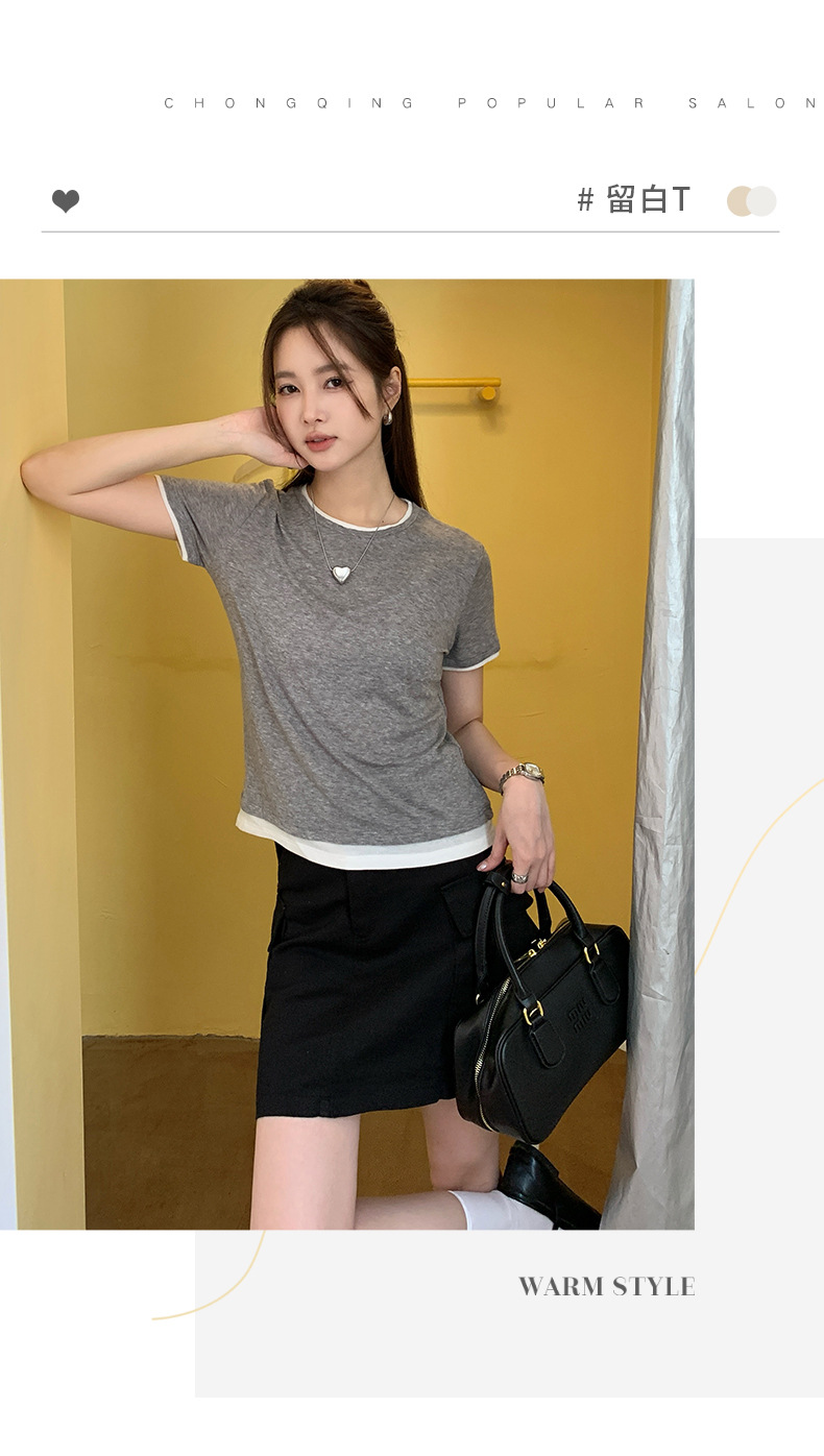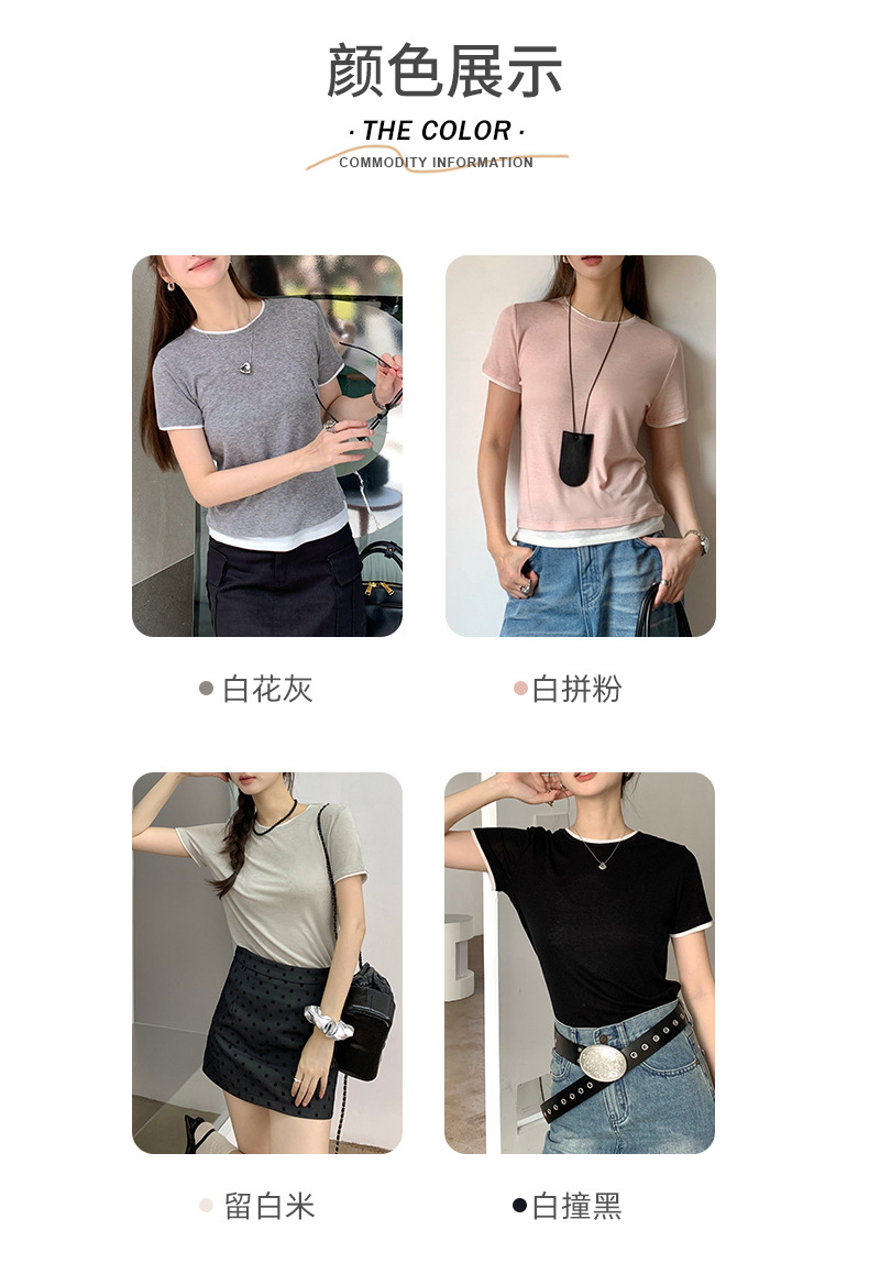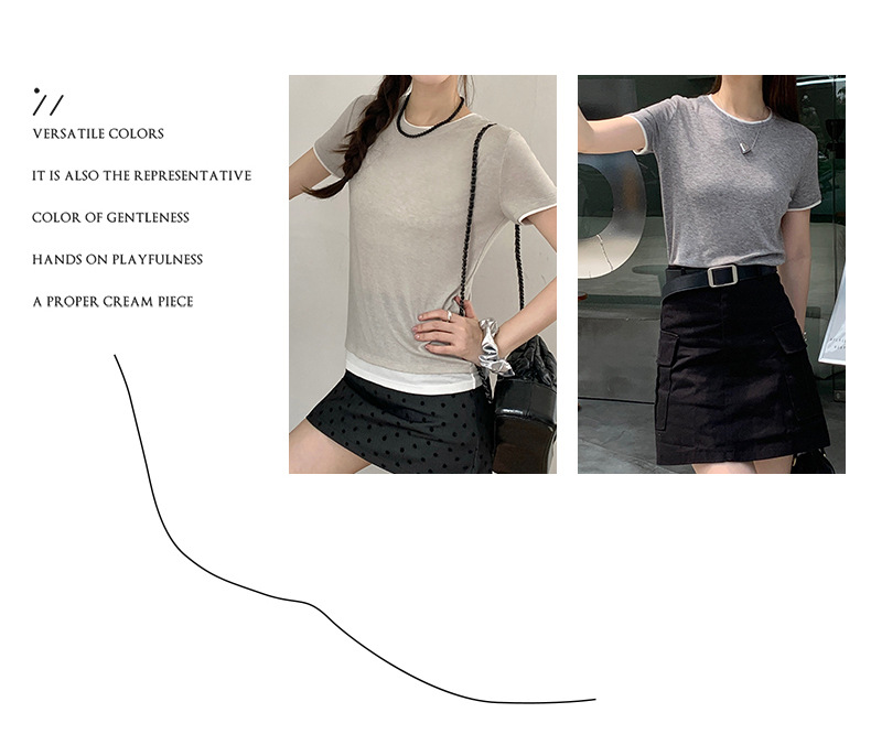 新款兰精天丝打底衫女假两件圆领短袖上衣夏季修身百搭显瘦t恤_ym