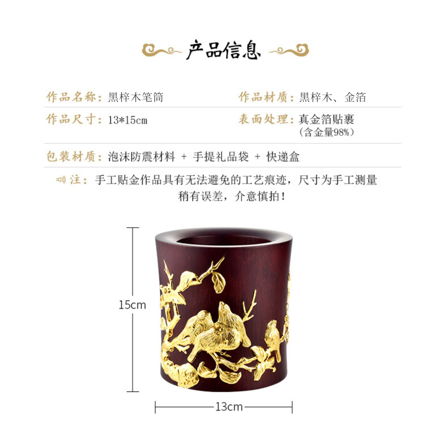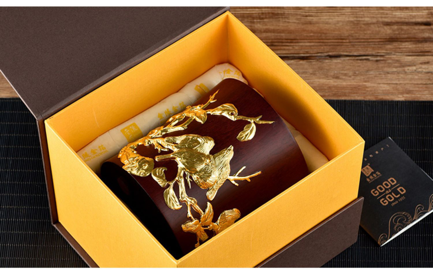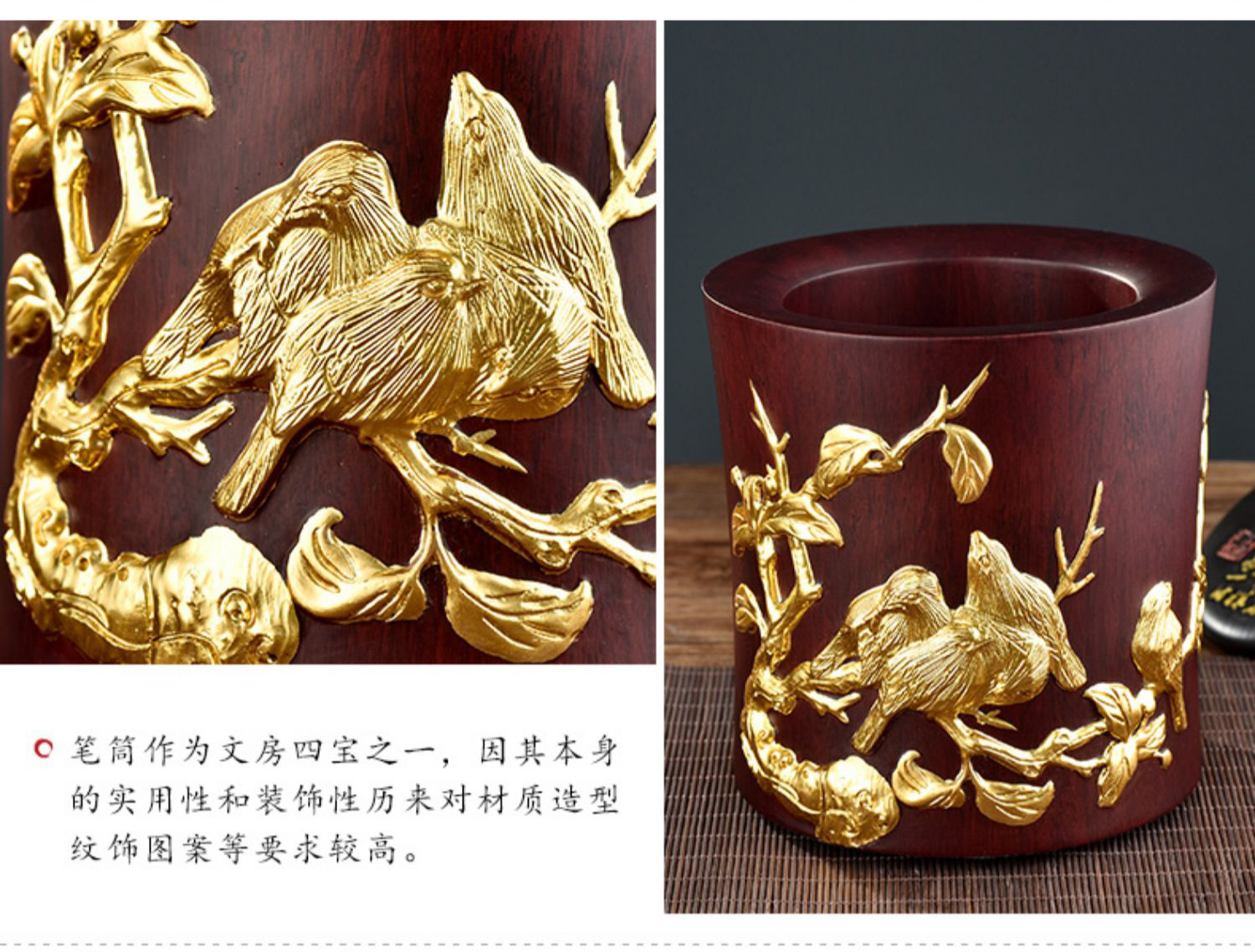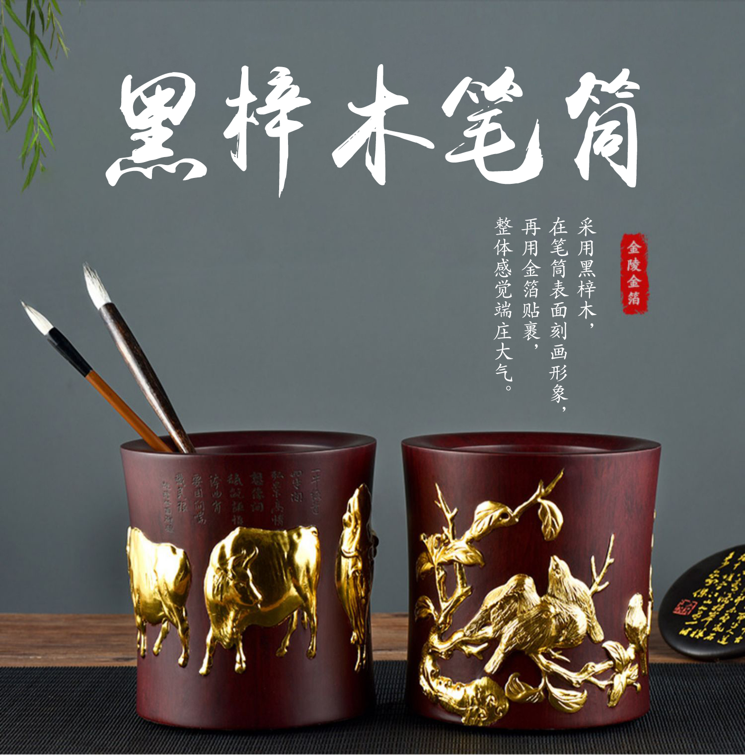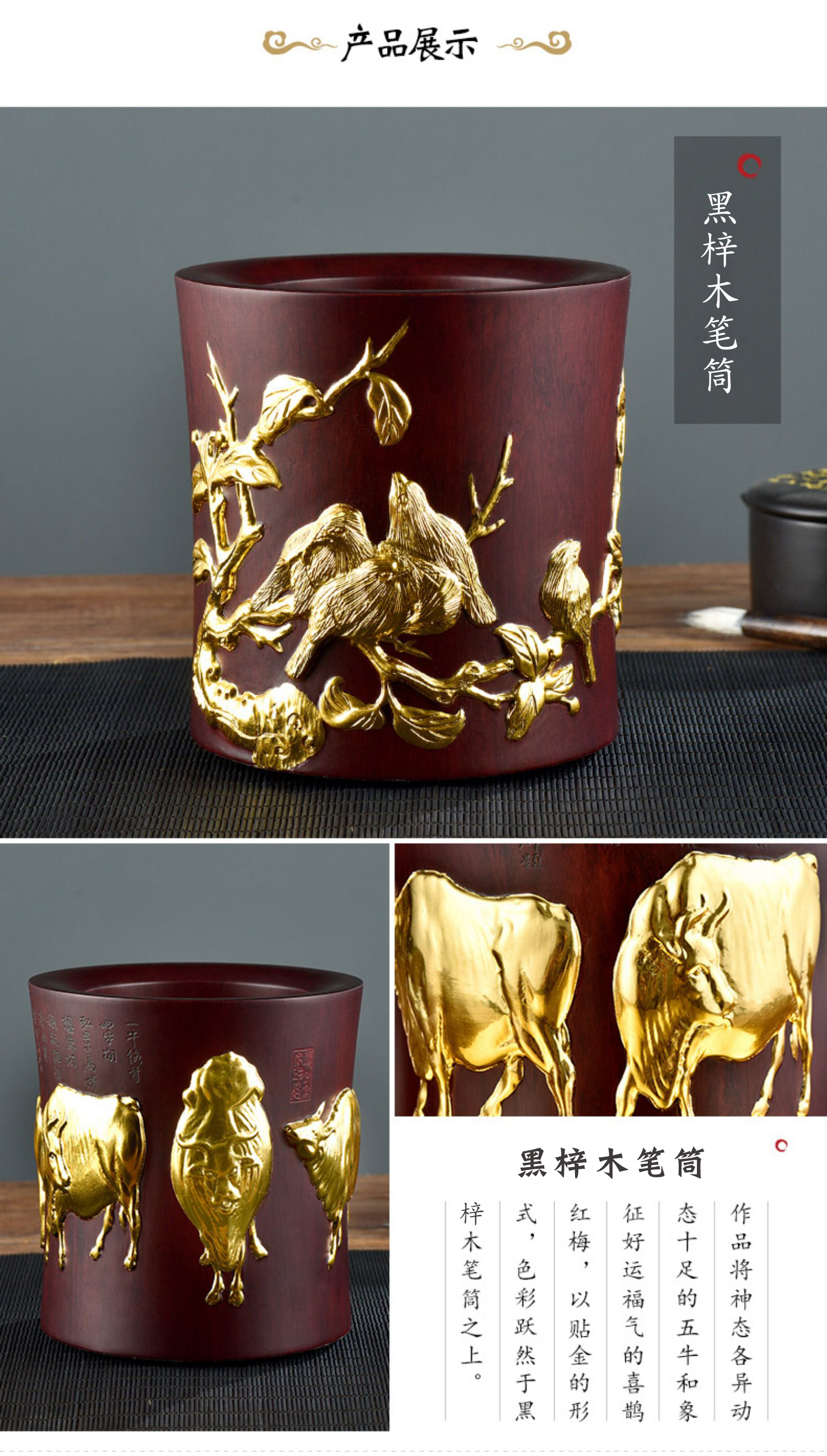 金陵金箔黑梓木五牛图笔筒摆件