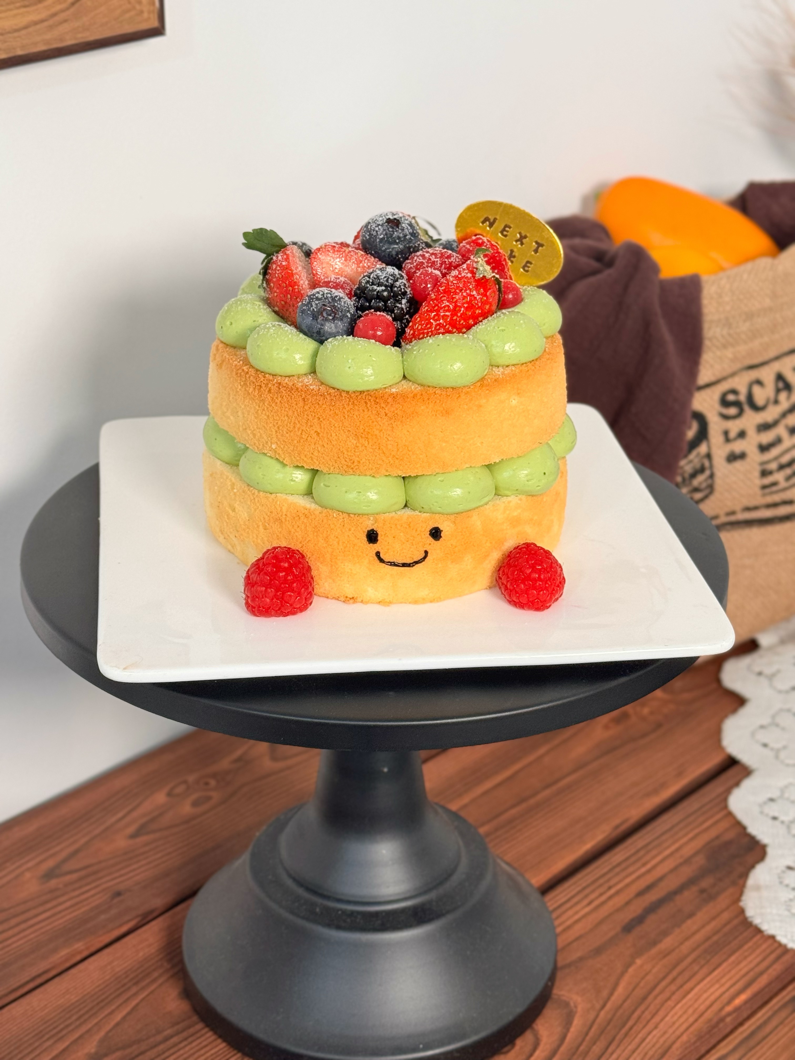 特制开心果奶油奶油,夹心一层芒果,头顶充满维E的新鲜莓果。(季节原因部分水果不同,详情可咨询客服)