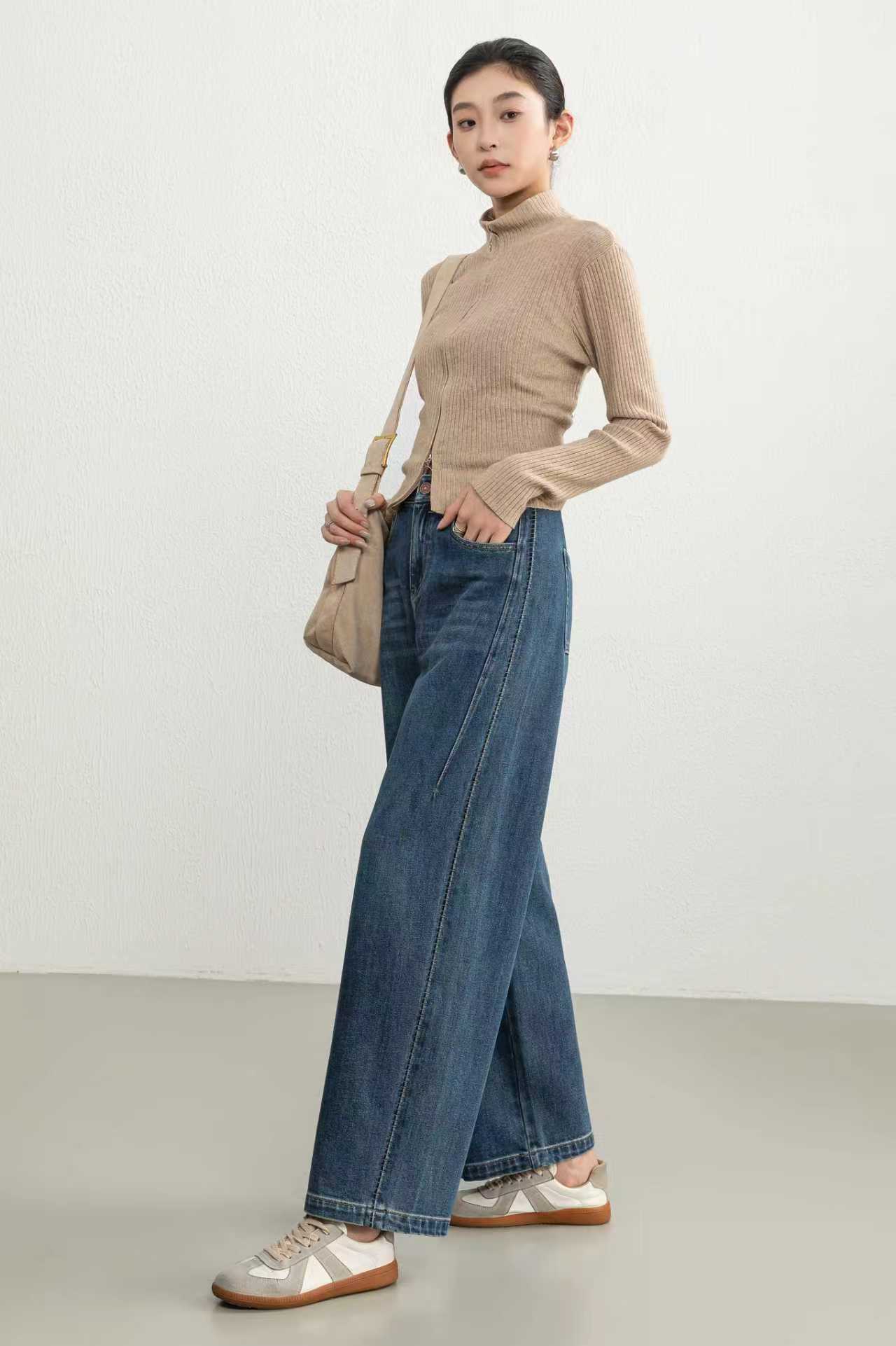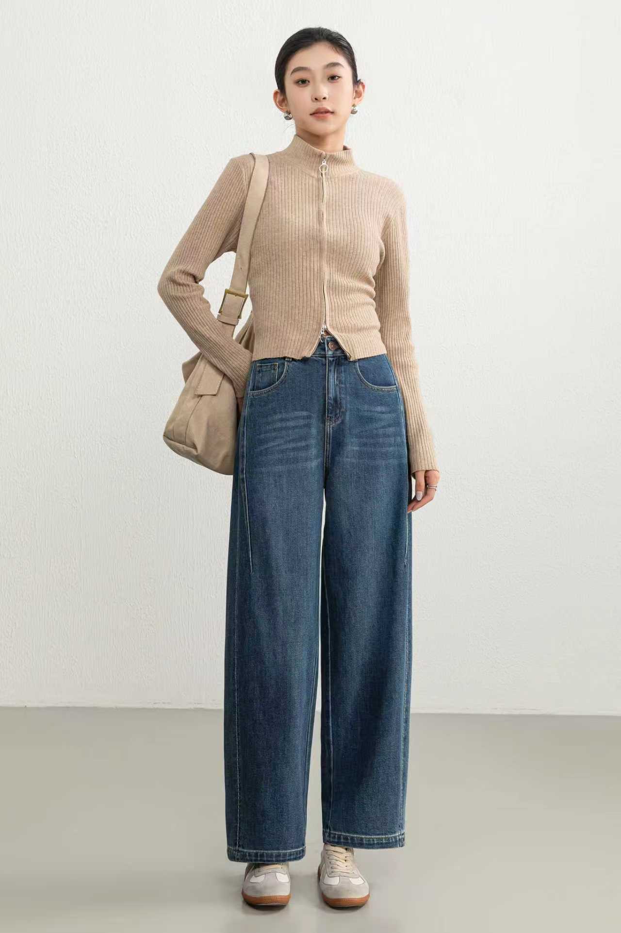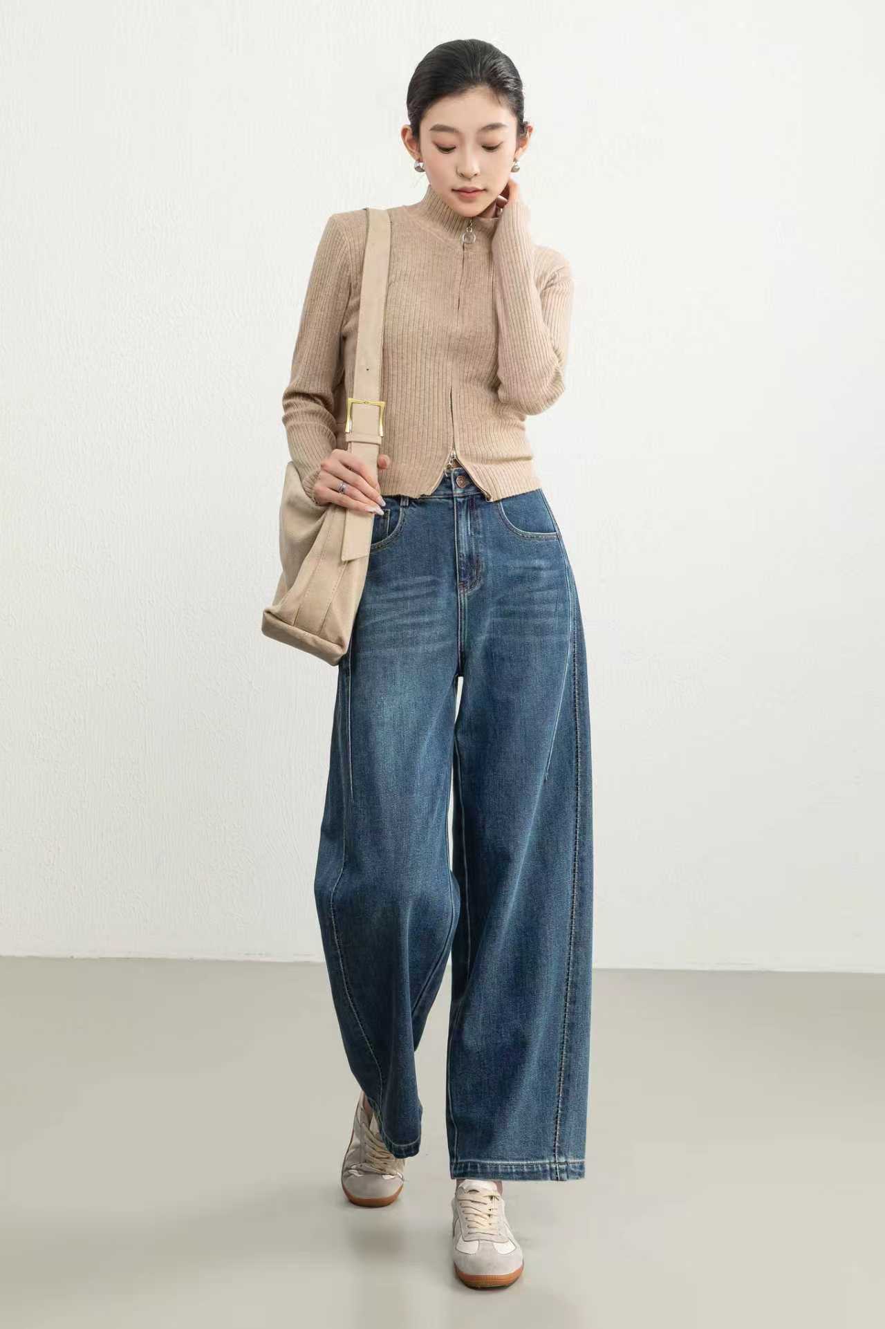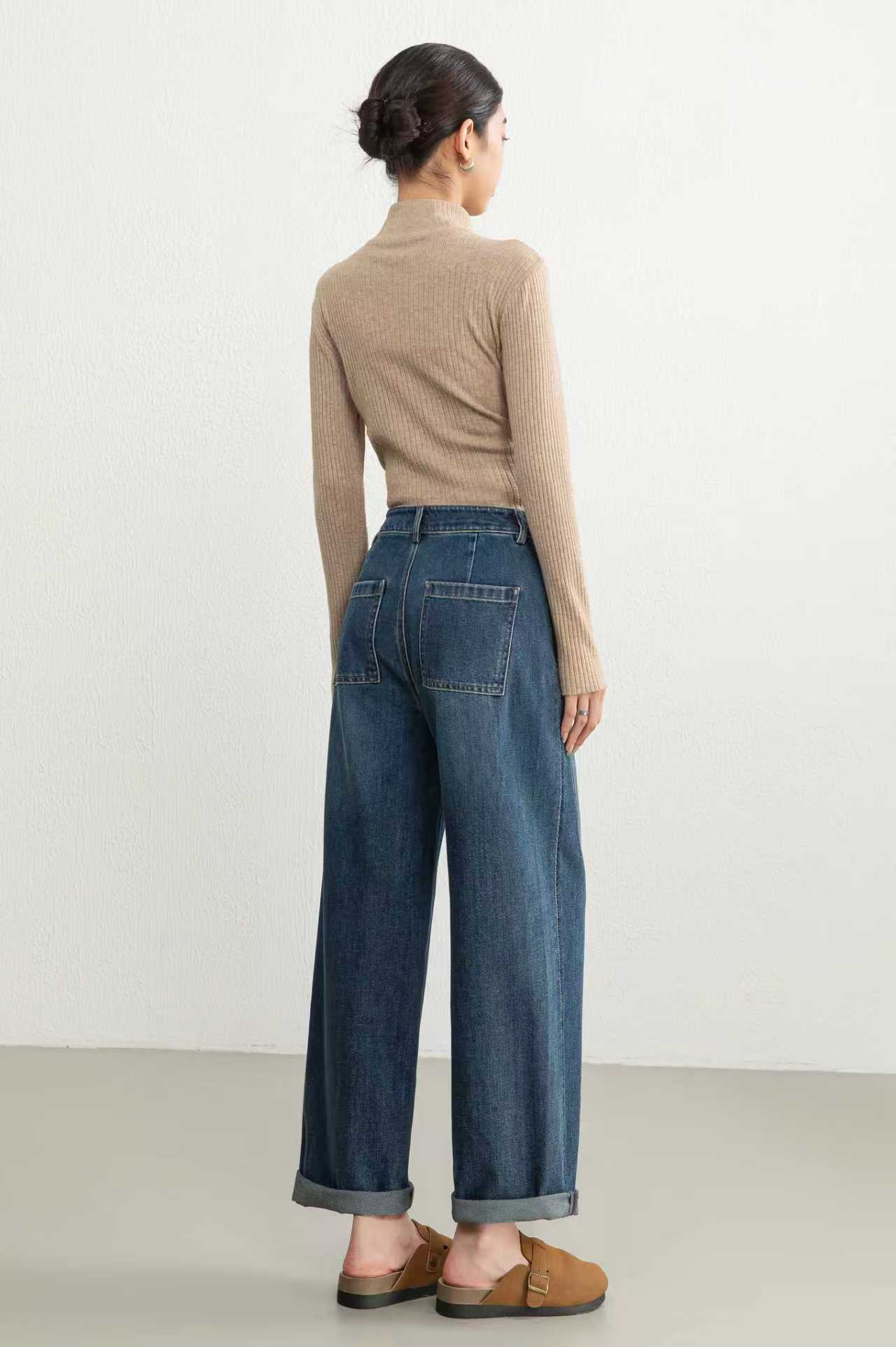 伯妮斯茵 | 复古休闲 蓝灰色羊角牛仔裤 高腰阔腿版型 日常百搭款 SZ3L06 - 蓝采和牛仔裤