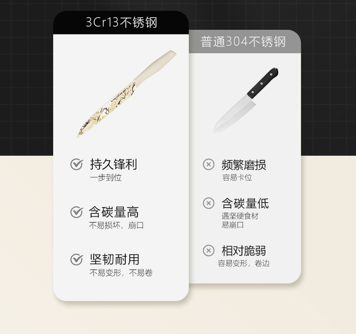 刀刃硬而不脆,无需经常磨刀,持久锋利