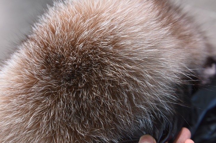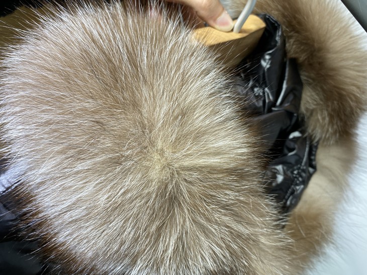 Frost Fox蓝霜狐毛皮镶边,真蓝霜狐毛领,足足一个手掌那么宽,肉眼可见的蓬松度。