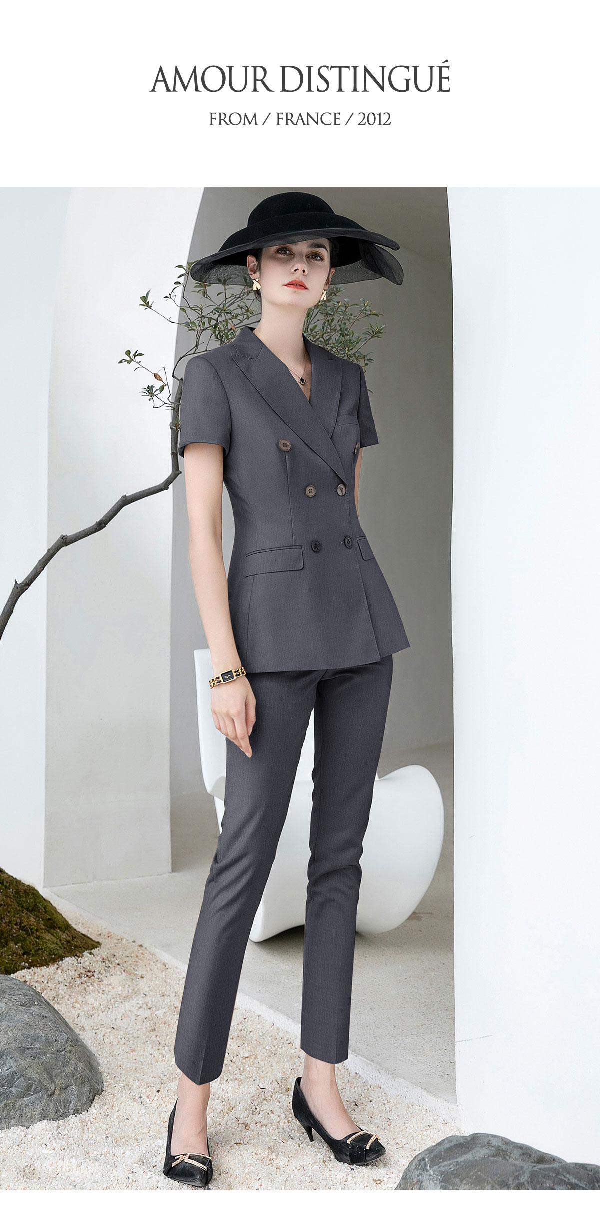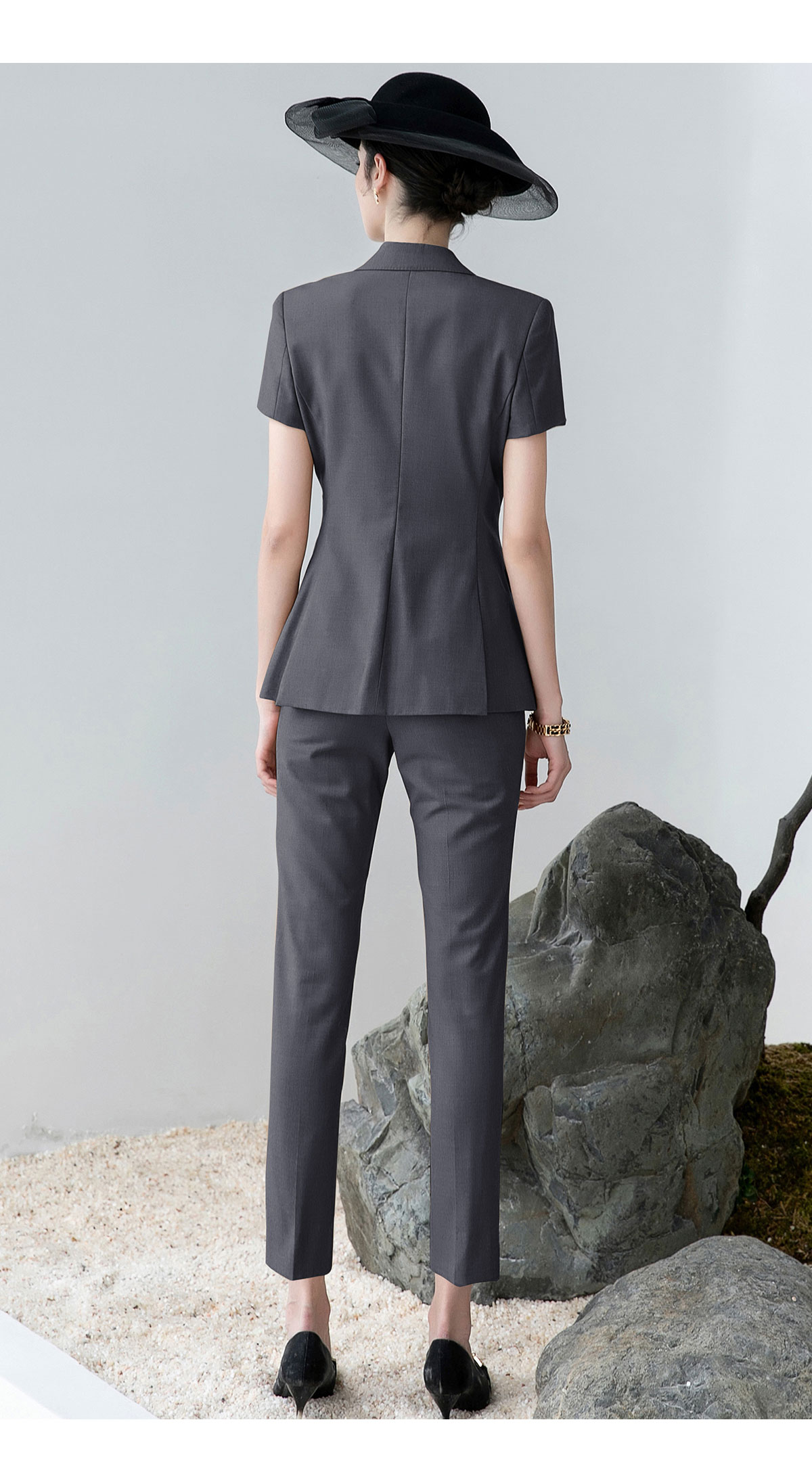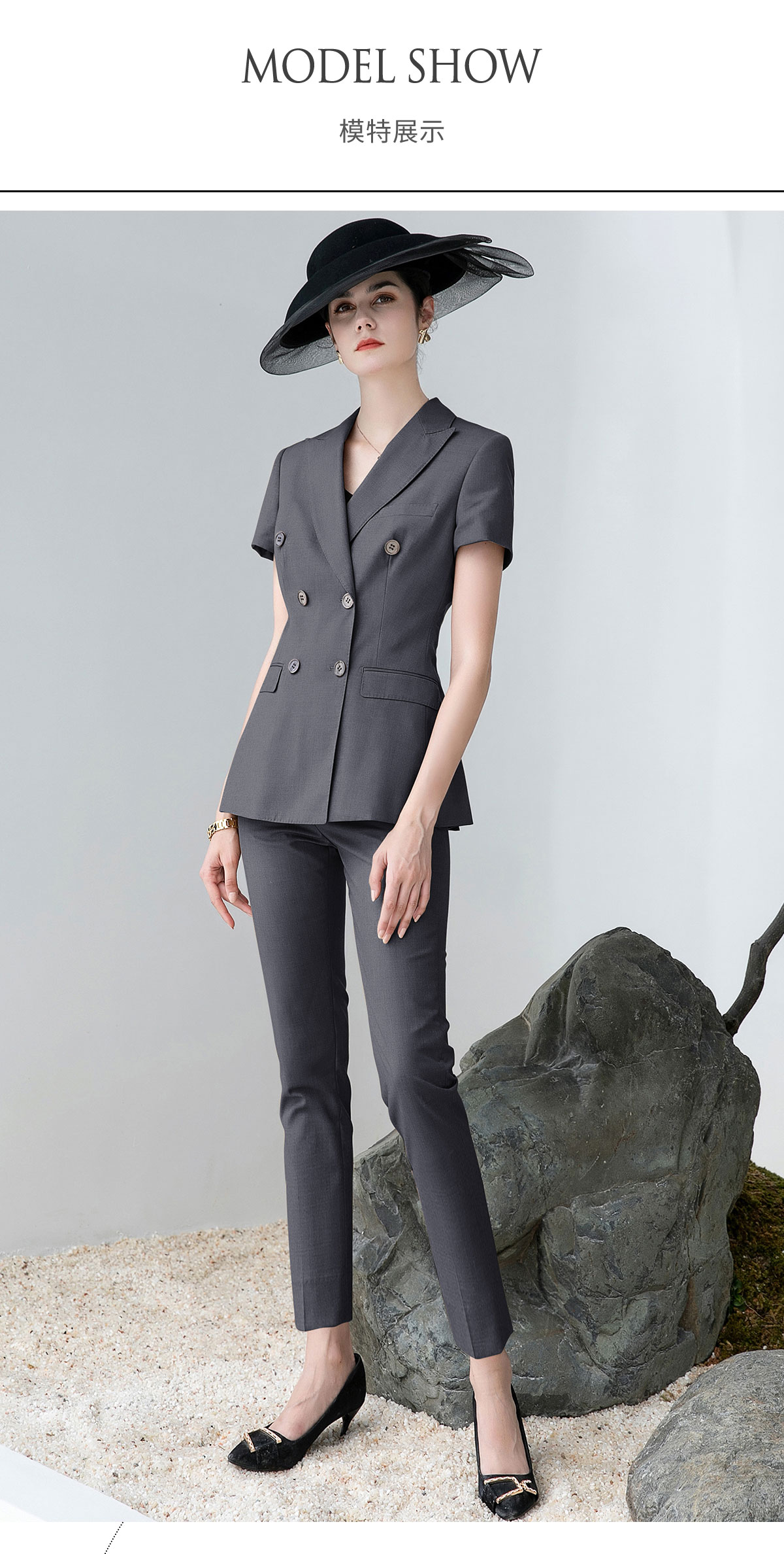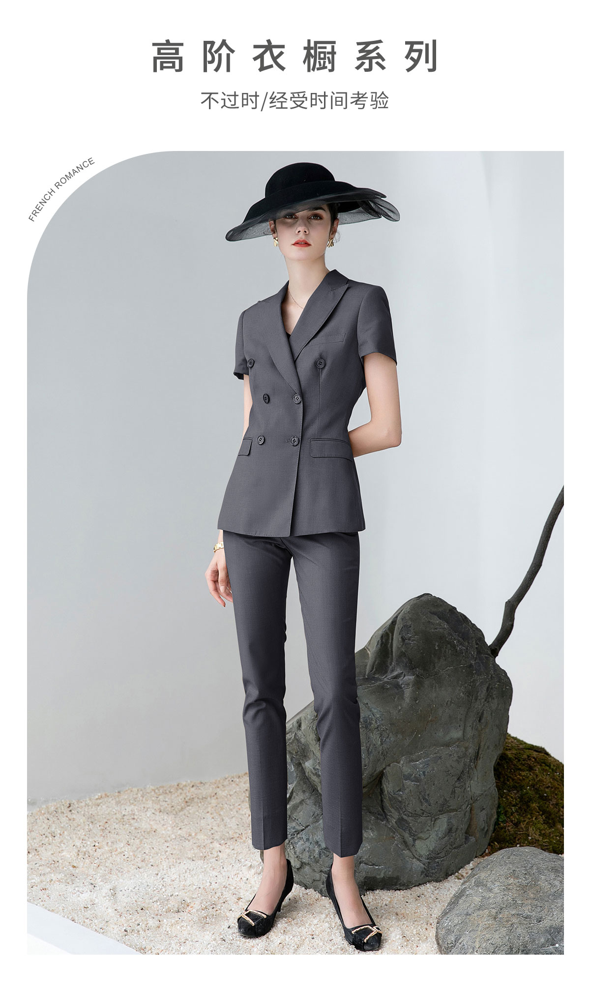 AD高端灰色职业装女西装套装2024夏季短袖双排扣西装公务员工作服