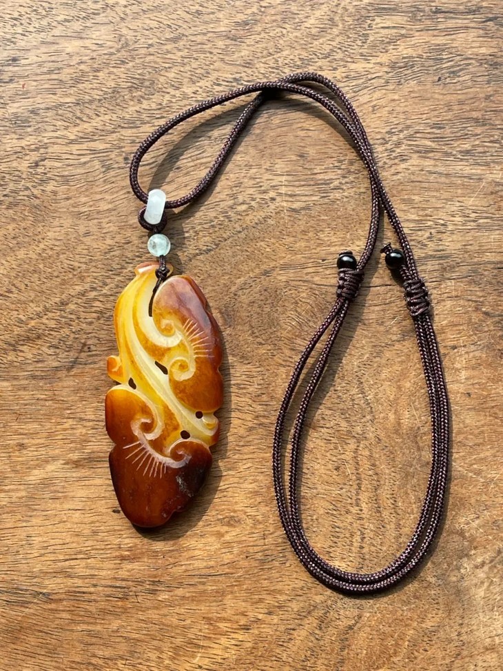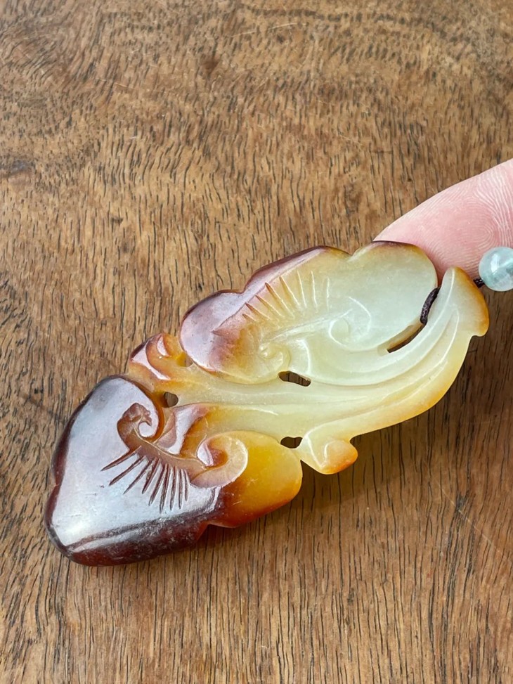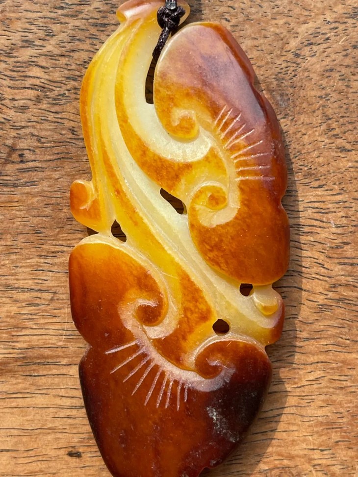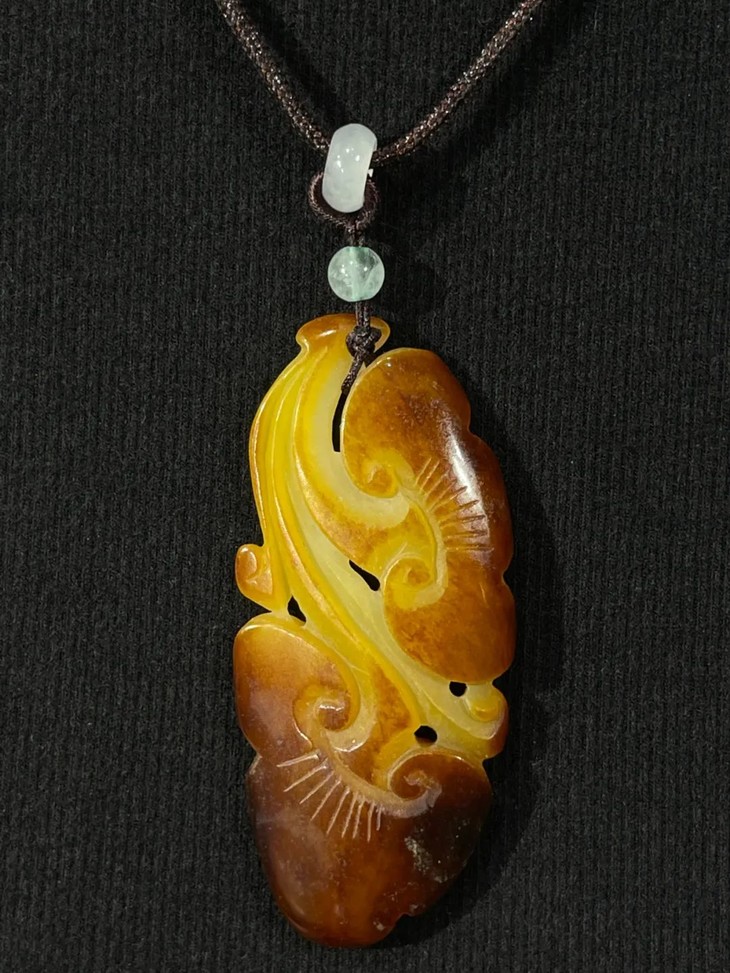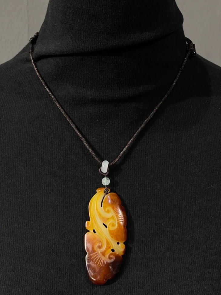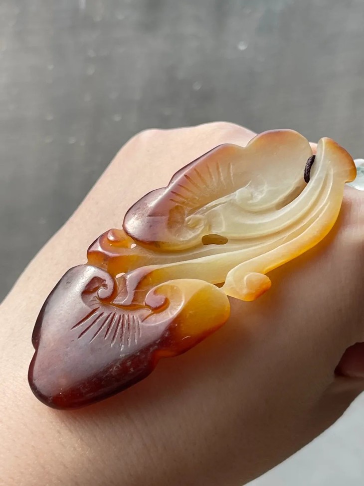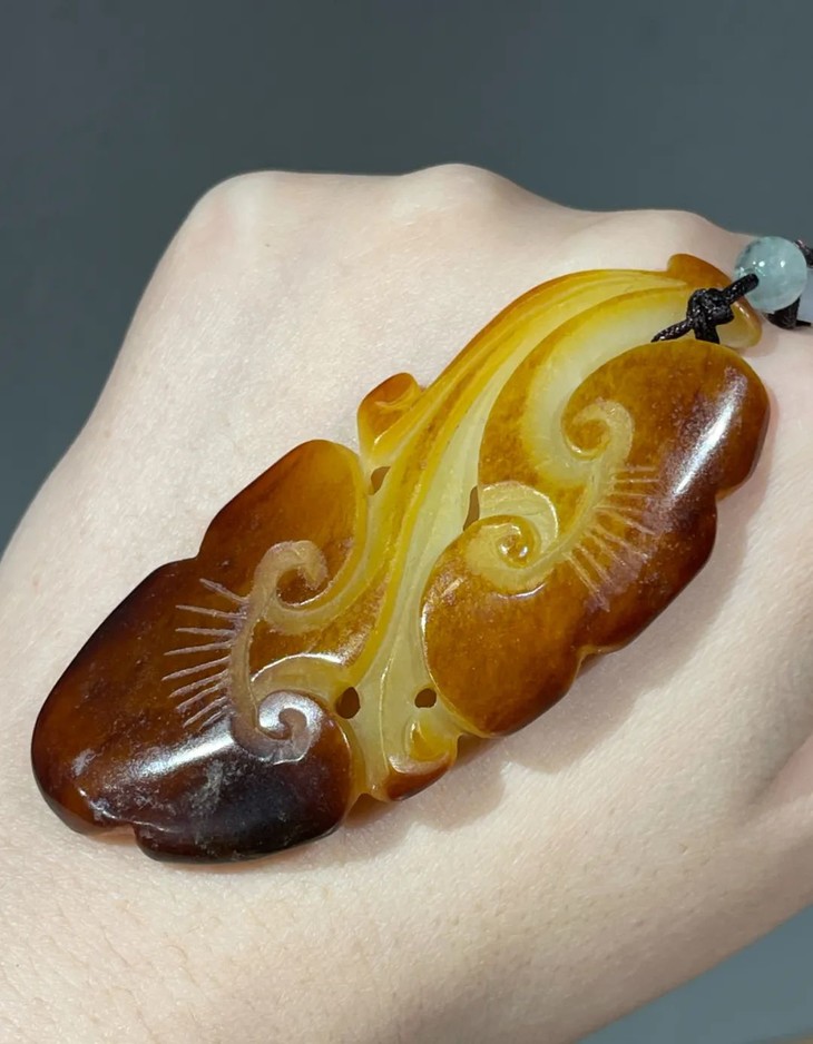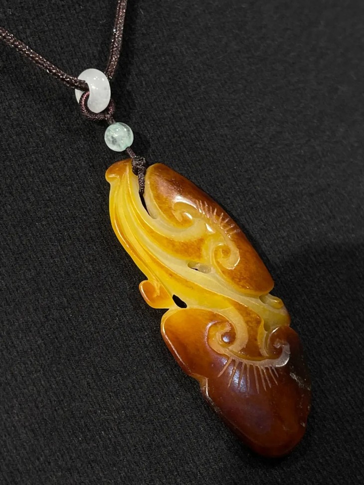 此件玉雕取材之红皮白玉籽料质地温润、油份与密度高,双面巧色雕刻精美,玉石质地细腻温润,艳红皮沁色泽独特珍稀,皮壳包浆温润细腻,搭配配绳结项链,或可镶成项链搭配时尚服饰,低调奢华、高雅大方。和田玉的行家们常说:“一红、二黄、三羊脂”,可以说明这件红皮的白玉籽儿原石的珍稀度。