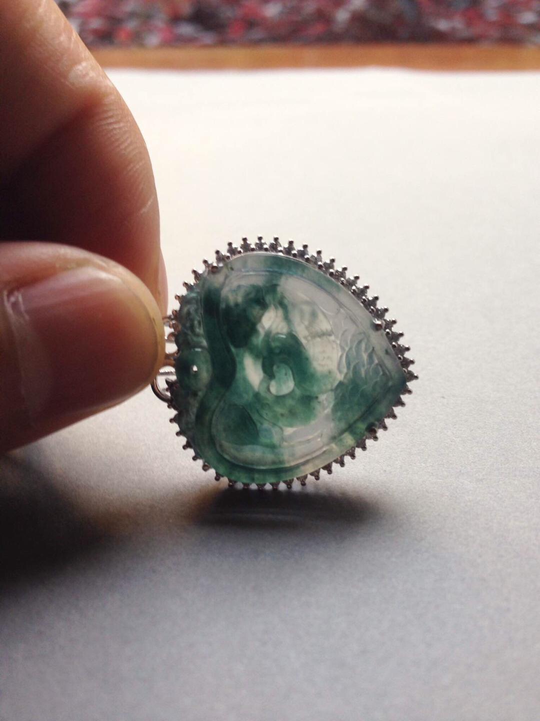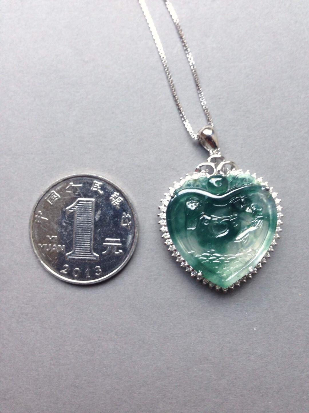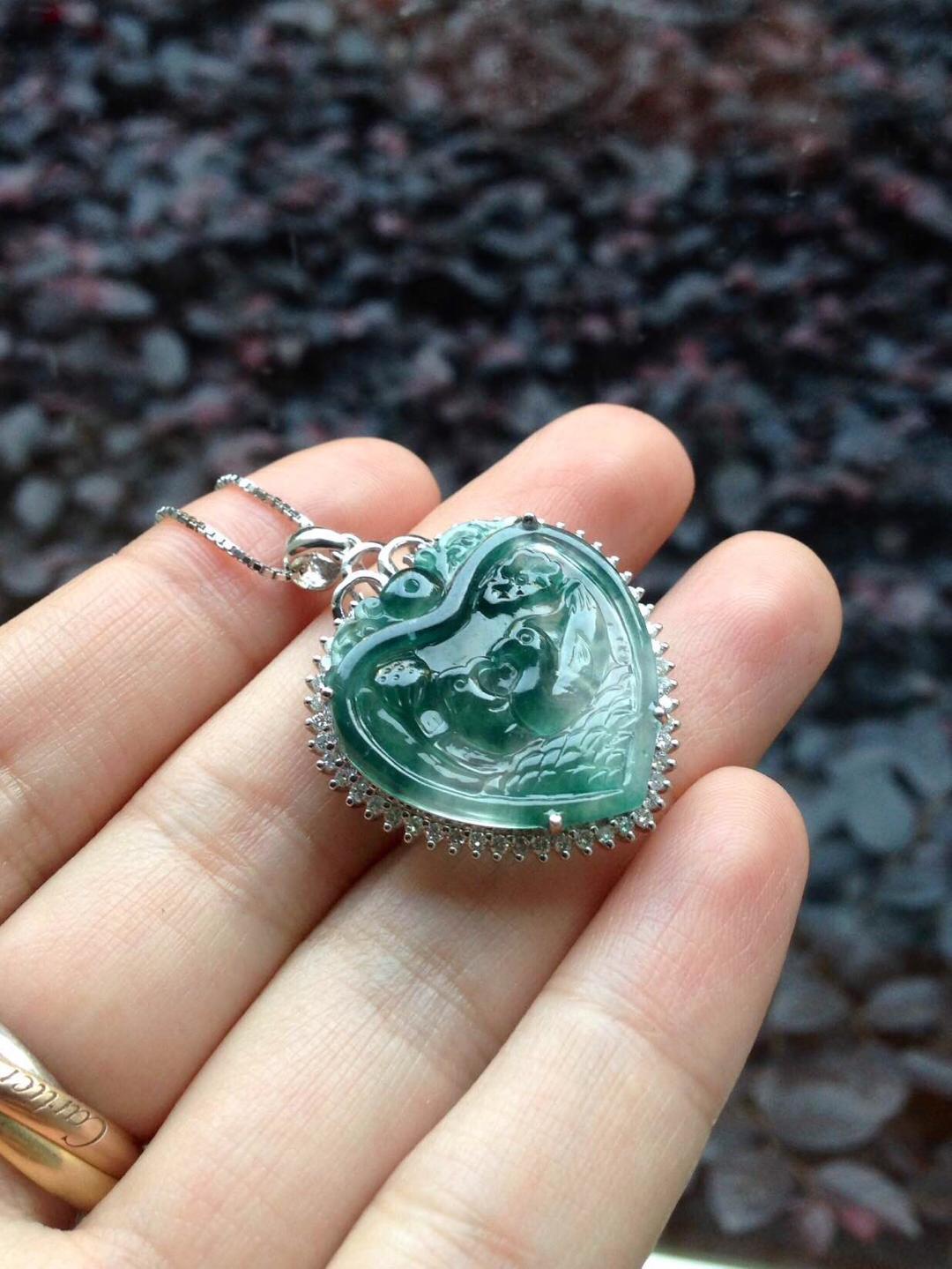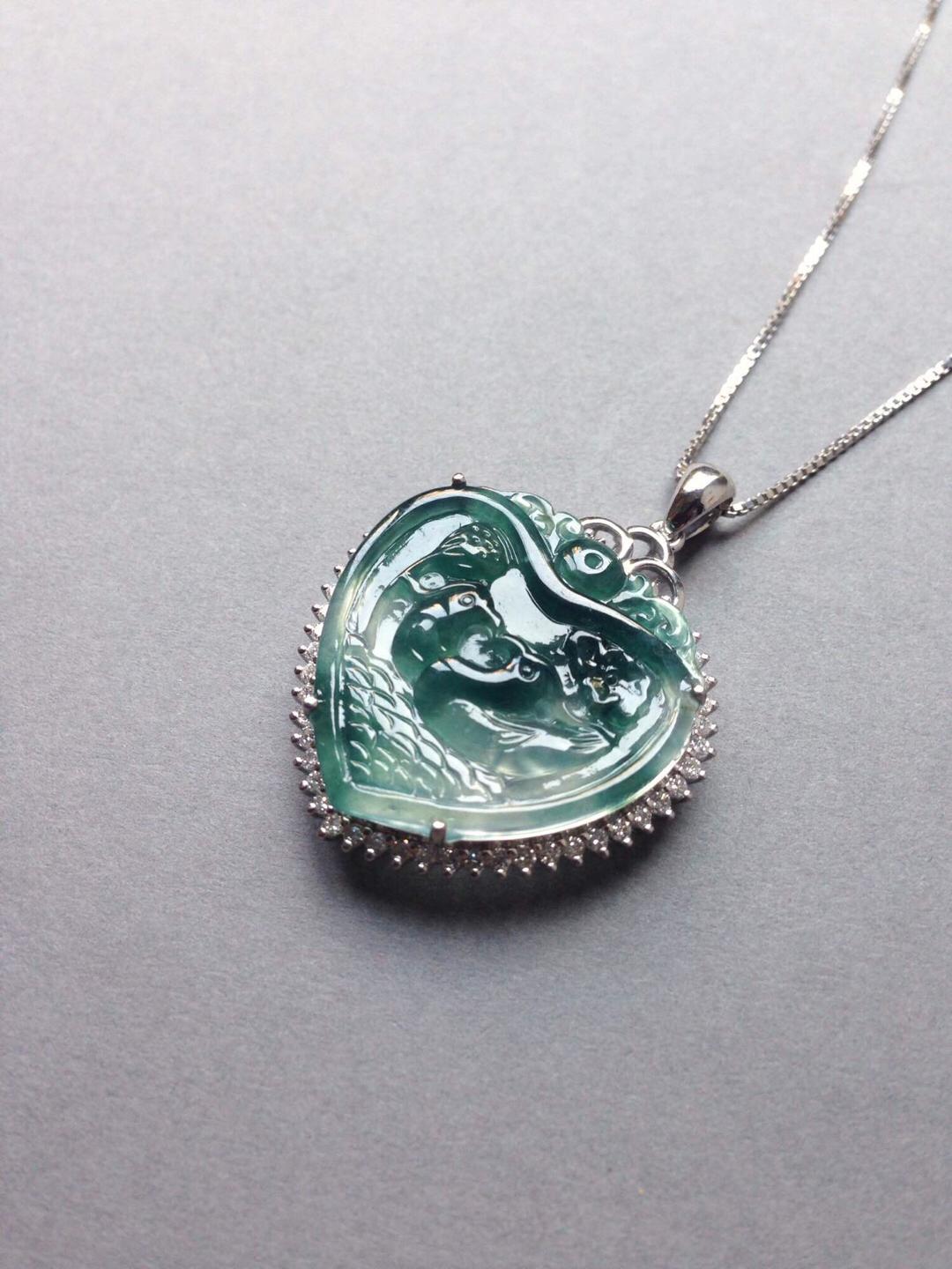 玻璃种飘花翡翠永结同心牌,只羡鸳鸯不羡仙,18k白金大钻镶嵌,简洁的设计把视觉注意力留给永结同心本身,灵动的飘花勾勒出天水的轮廓,两只鸳鸯嬉戏其间,让人艳羡,真正美好的感情就是这样吧,眼力只有对方。牌子细节刻画精美,俏色巧雕莲蓬于鸳鸯旁边,让画面充满生气。富于浓浓人文情感的一件作品,送给爱人的选择。心牌种水好,晶莹剔透,24*23.7*4mm,镶嵌后连扣头37.2*27.5*8.8mm。全用大钻,豪华镶嵌,光成本就过4000了。推荐