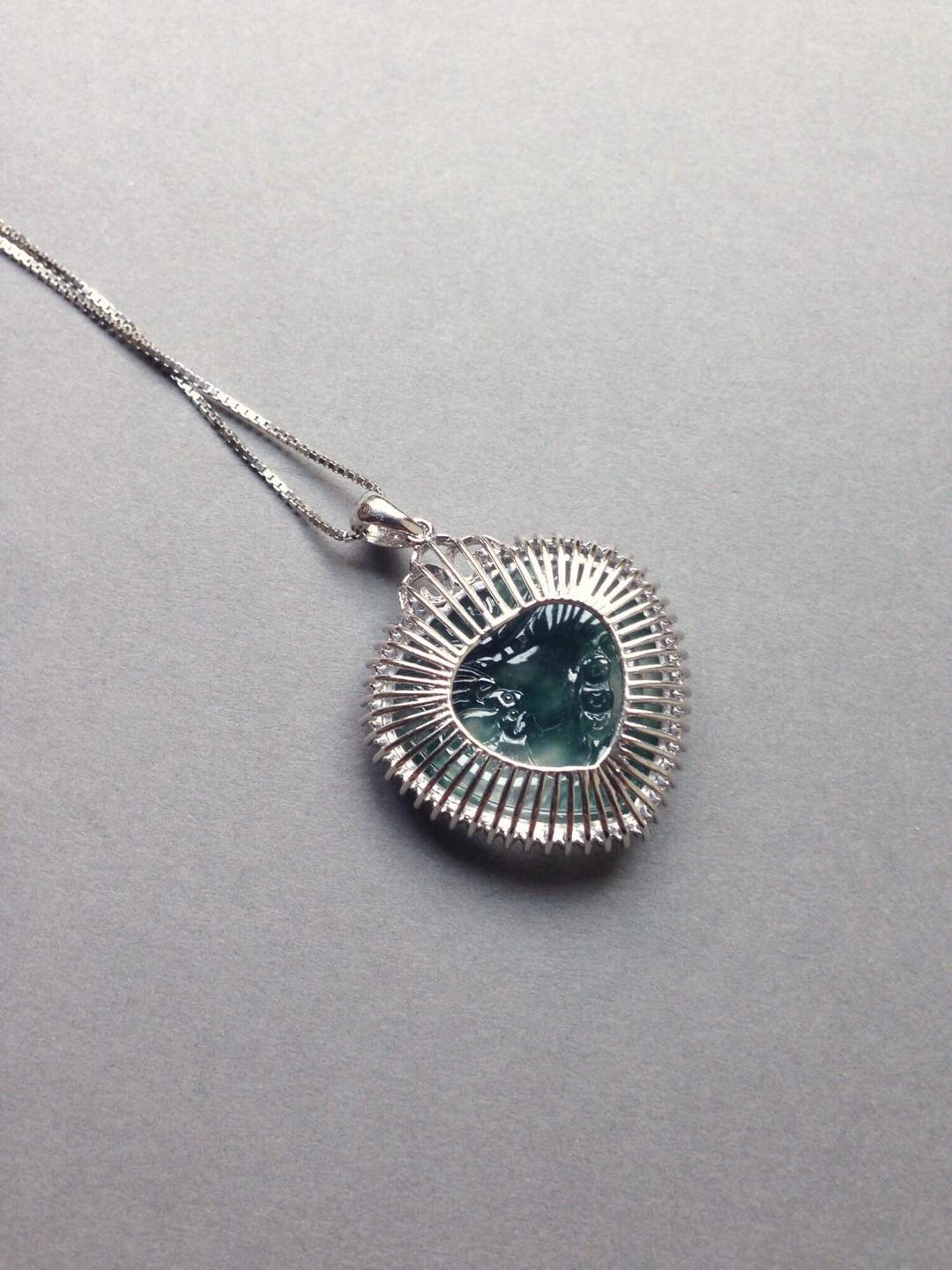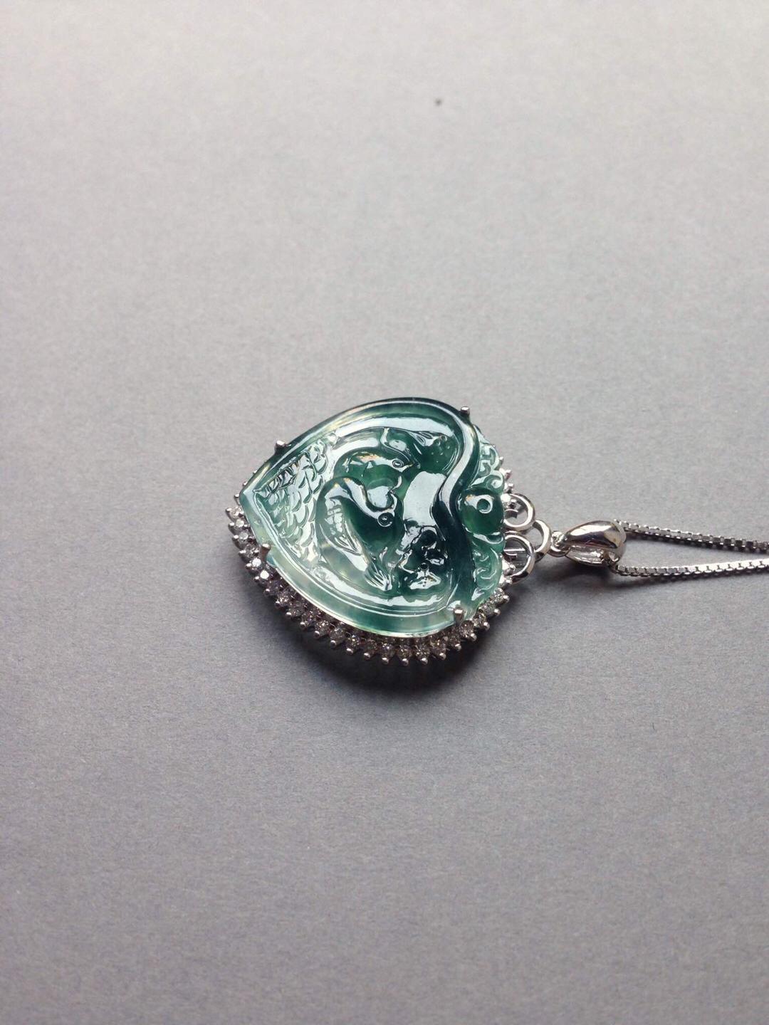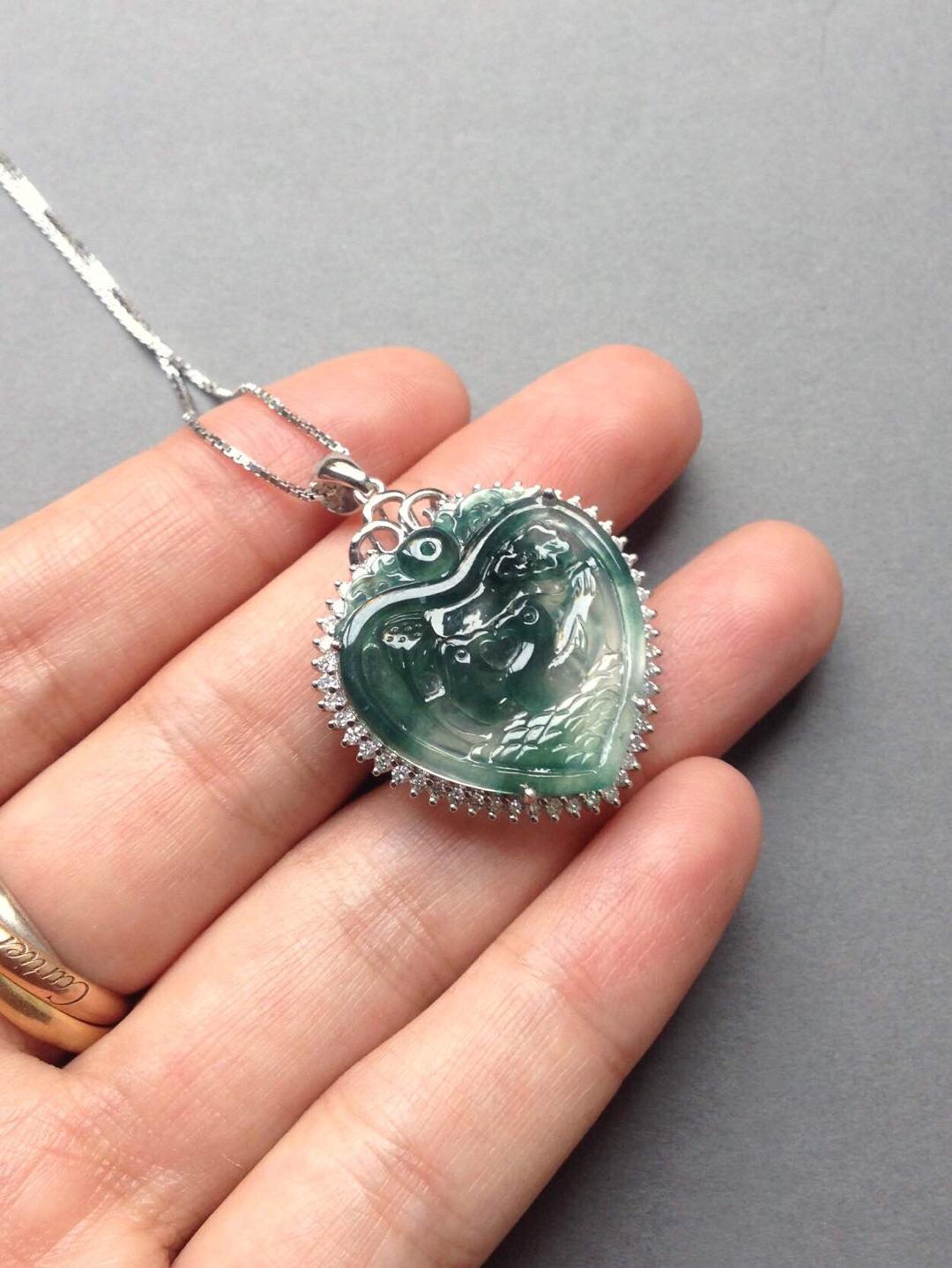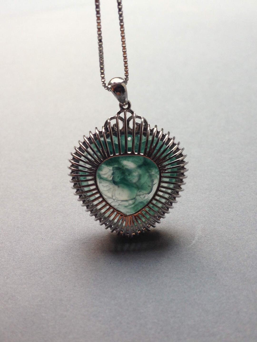 玻璃种飘花翡翠永结同心牌,只羡鸳鸯不羡仙,18k白金大钻镶嵌,简洁的设计把视觉注意力留给永结同心本身,灵动的飘花勾勒出天水的轮廓,两只鸳鸯嬉戏其间,让人艳羡,真正美好的感情就是这样吧,眼力只有对方。牌子细节刻画精美,俏色巧雕莲蓬于鸳鸯旁边,让画面充满生气。富于浓浓人文情感的一件作品,送给爱人的选择。心牌种水好,晶莹剔透,24*23.7*4mm,镶嵌后连扣头37.2*27.5*8.8mm。全用大钻,豪华镶嵌,光成本就过4000了。推荐