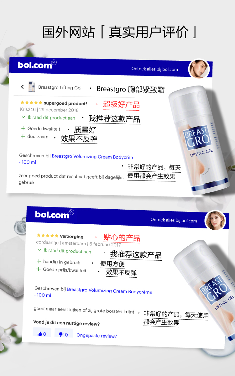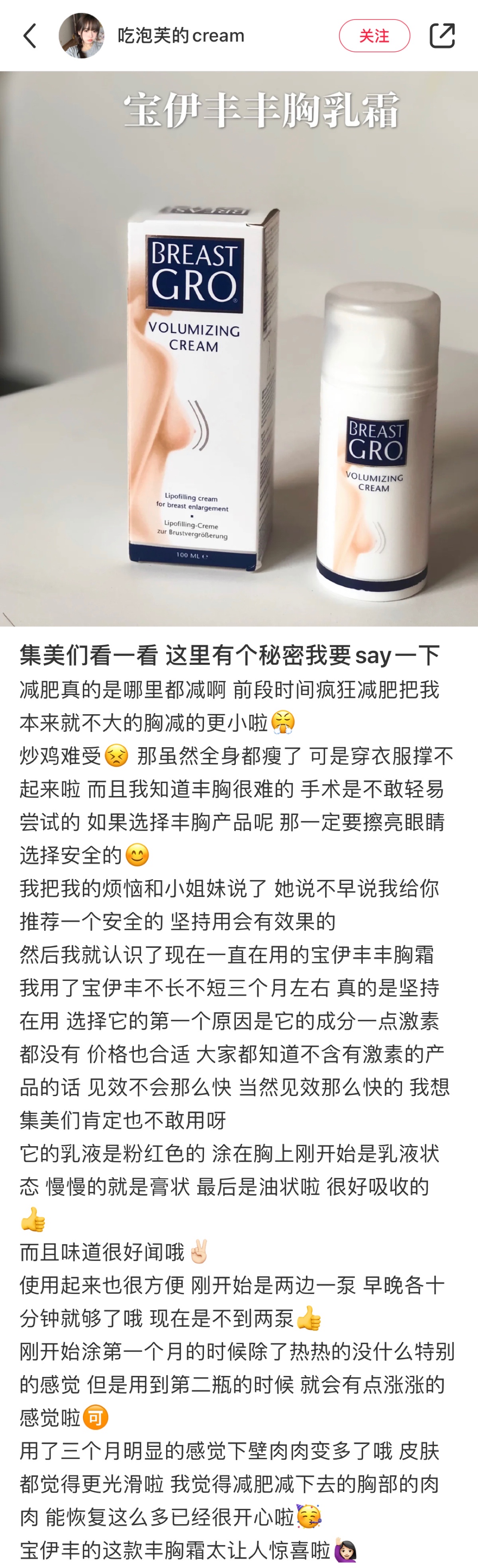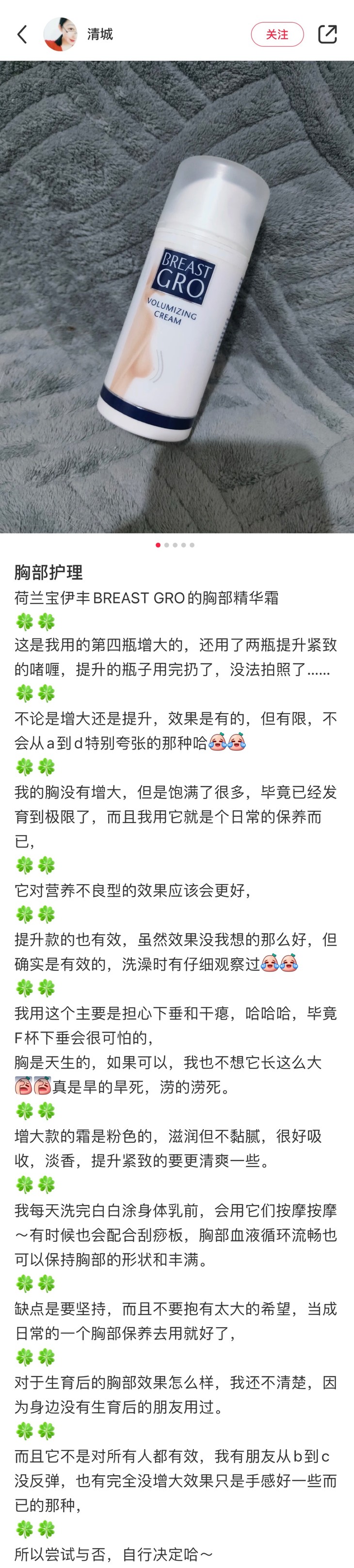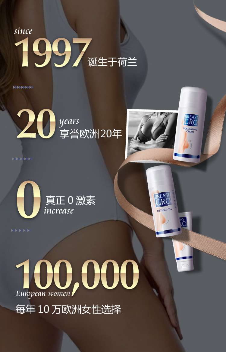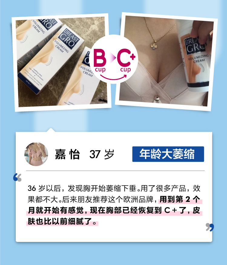 终于又有大胸胸乳了!之前上过的几款都因为没有批文,没法进来了,这次上的是更为安全的荷兰品牌BreastGro,所有都齐,作用于脂肪,孕妈哺乳期都可以放心用!除了是帮小A们谋福利,我个人的原因是,我真的也好怕下垂呀!我是属于水滴型,有点外扩,很软,不够饱满,为保持挺拔,美胸霜是不可少的。这次的真的也是口碑炸裂,想要UPUP的姐妹们看过来!