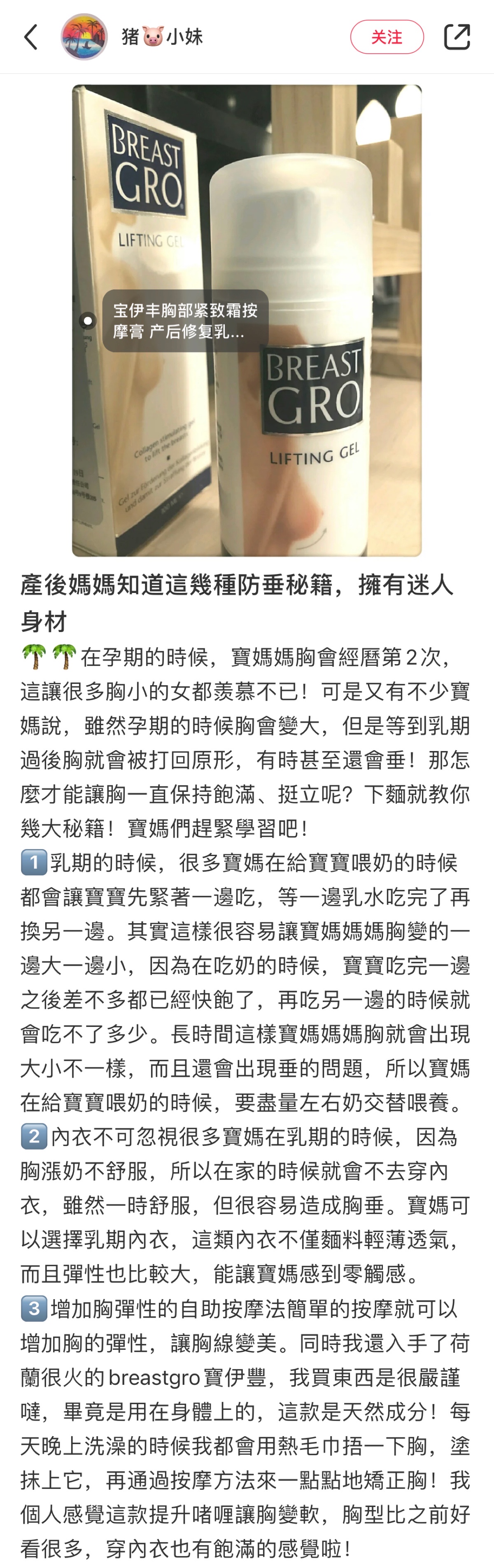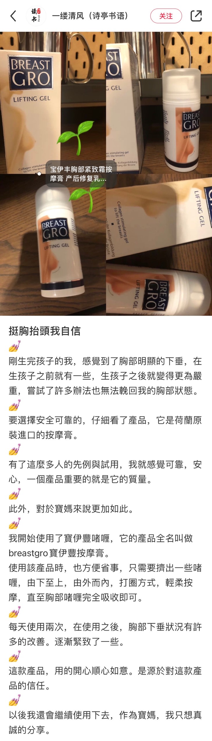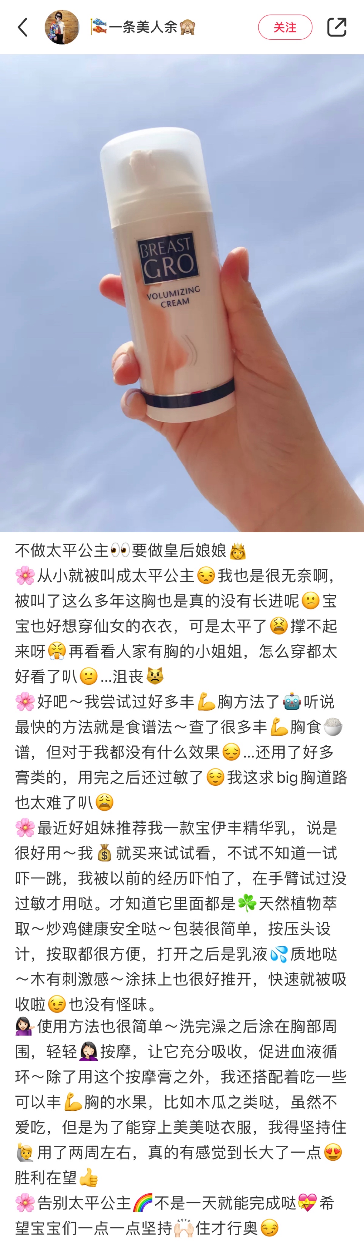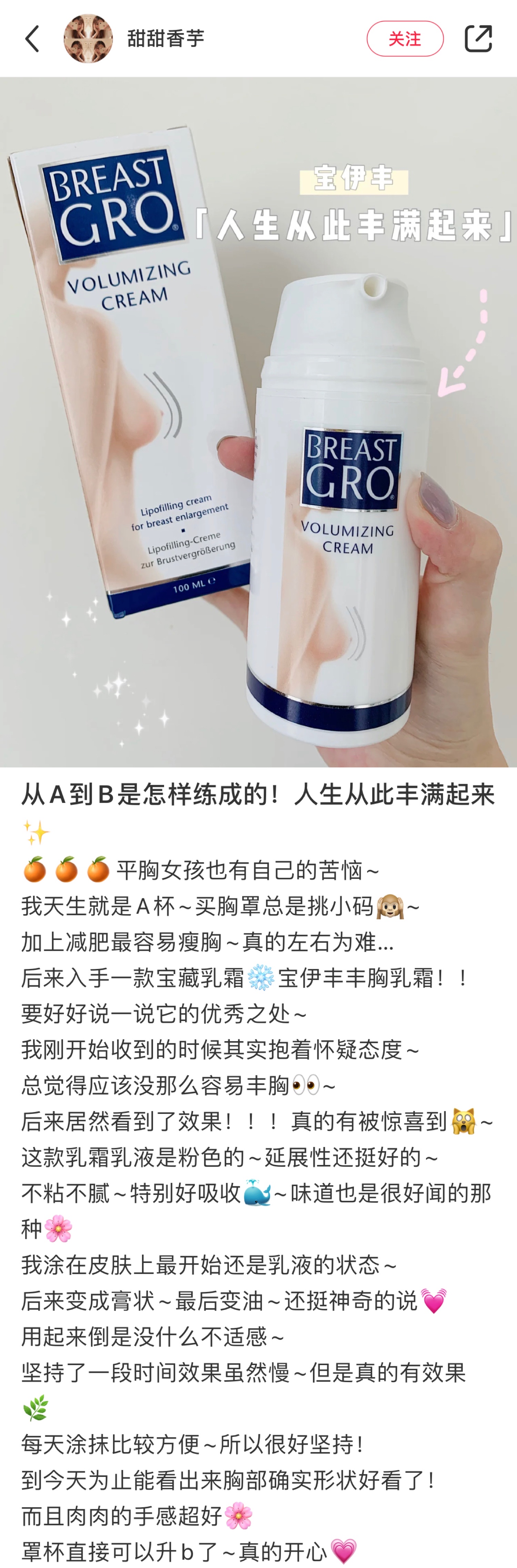 终于又有大胸胸乳了!之前上过的几款都因为没有批文,没法进来了,这次上的是更为安全的荷兰品牌BreastGro,所有都齐,作用于脂肪,孕妈哺乳期都可以放心用!除了是帮小A们谋福利,我个人的原因是,我真的也好怕下垂呀!我是属于水滴型,有点外扩,很软,不够饱满,为保持挺拔,美胸霜是不可少的。这次的真的也是口碑炸裂,想要UPUP的姐妹们看过来!