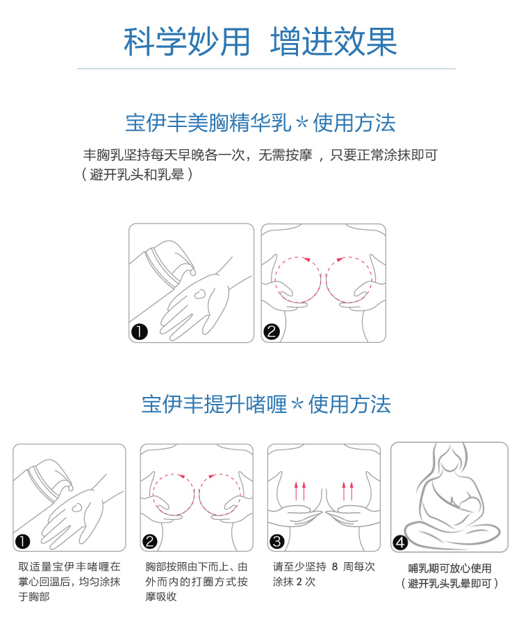 宝伊丰美胸精华乳,是针对小胸胸的,适合天生胸小或减肥导致的胸缩、胸部大小不一,以及产后胸部干瘪或年龄增长导致的胸部缩小等人群。它采用了VOLUFILINE这一植物提取美胸成分,靶向作用于胸部的脂肪细胞,不作用于乳腺。它的主要成分是知母根提取物和非洲吊灯树果的提取物KIGELINE,能够深入到肌肤底层,来改善肌肤的柔韧性,助力胸部自然产生脂肪,从而UP胸胸。修Fu啫喱是跟精华乳配套的产品,主要针对的是胸胸下垂的人群。通过巨藻提取物、拉恩氏菌、水解小麦蛋白合成宝伊丰的Bio-Bustyltm+ST核心科技成分,来刺激胸胸胶原蛋白的合成,让肌肤更加紧实。两款产品都不含雌激素、孕激素和糖皮质激素,并且获得了我国特殊化妆品用途的进口批准文号,是经过实验室和真人试用后真正有效的美胸产品。