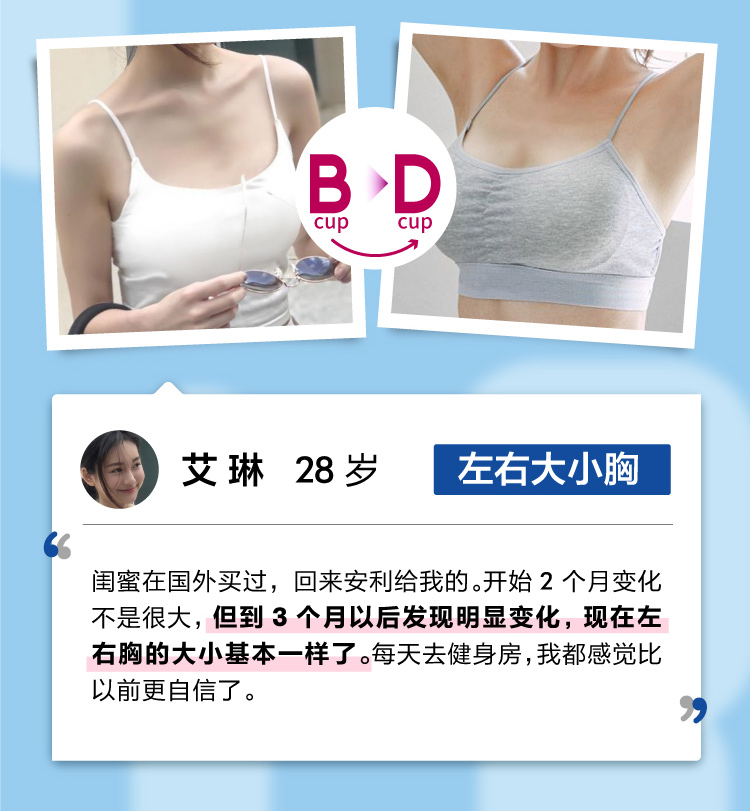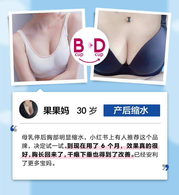 适用人群:适合天生胸小或减肥导致的胸缩、胸部大小不一,产后胸部干瘪或年龄增长导致的胸部缩小等人群