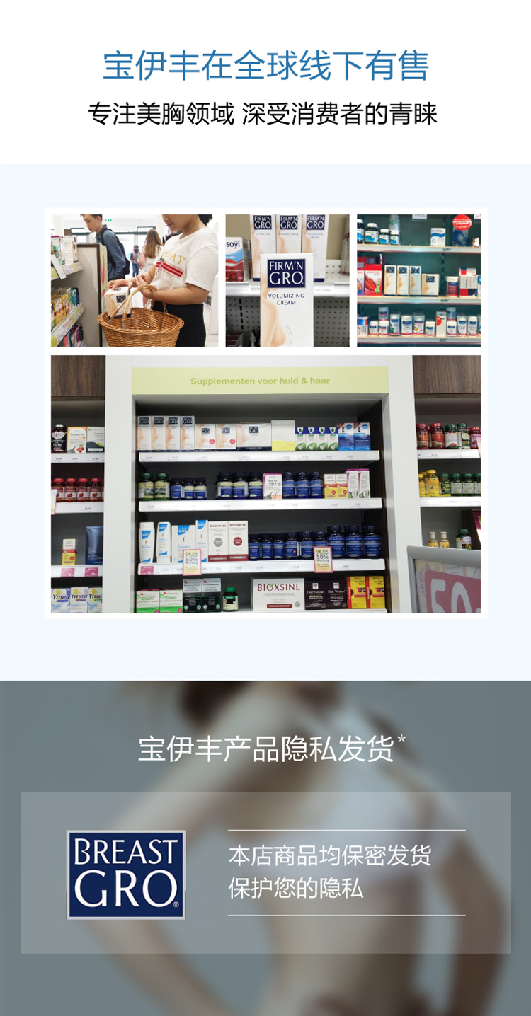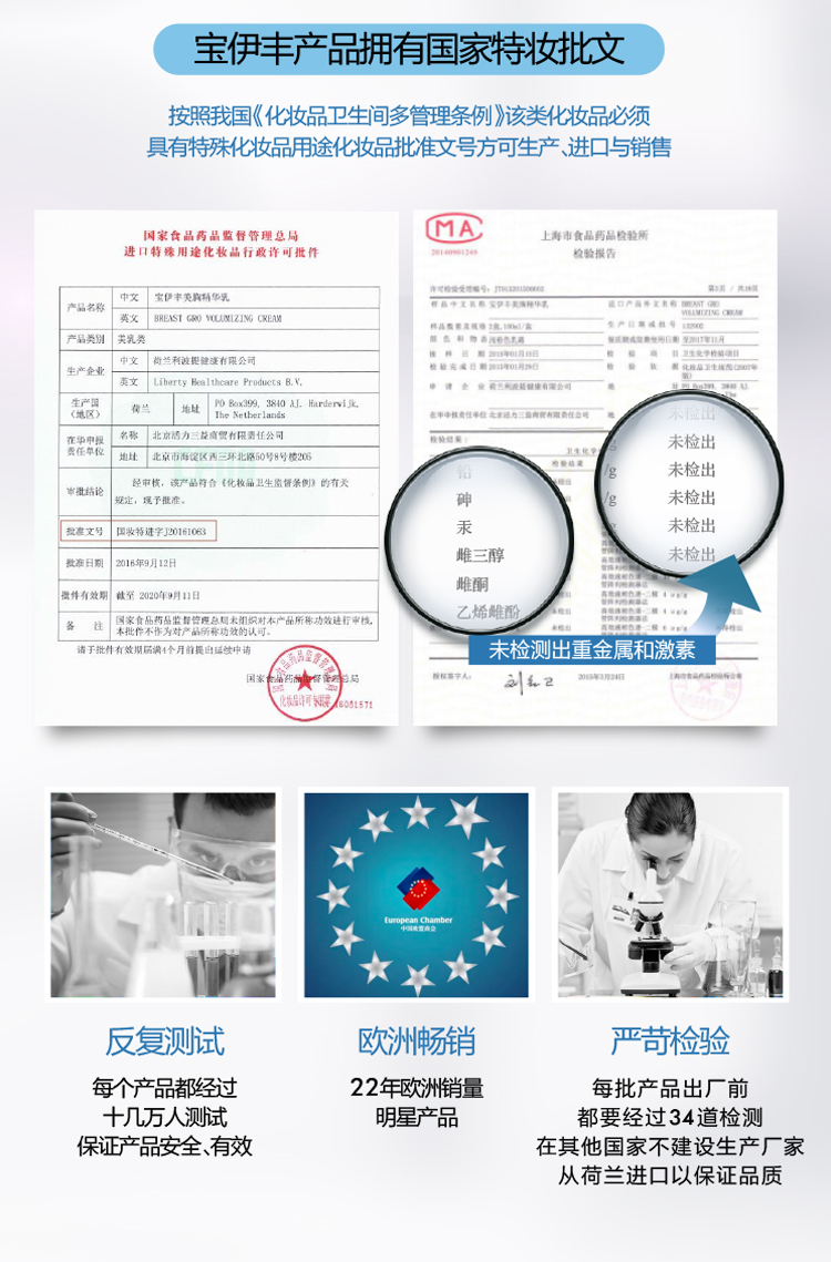 BreastGro宝伊丰,始于1997年荷兰立波公司,是旗下的女性胸部护理高端品牌。宝伊丰一直致力于以自然之力呵护女性健康,绽放女性胸部魅力,产品通过了欧盟食品级安全认证、欧盟自由销售认证和美国FDA准入批文、中国CFDA。自14年引进中国后,虽然没有做什么营销推广,光是凭着使用者的口碑,也在丰胸产品界获得了满满的好评。