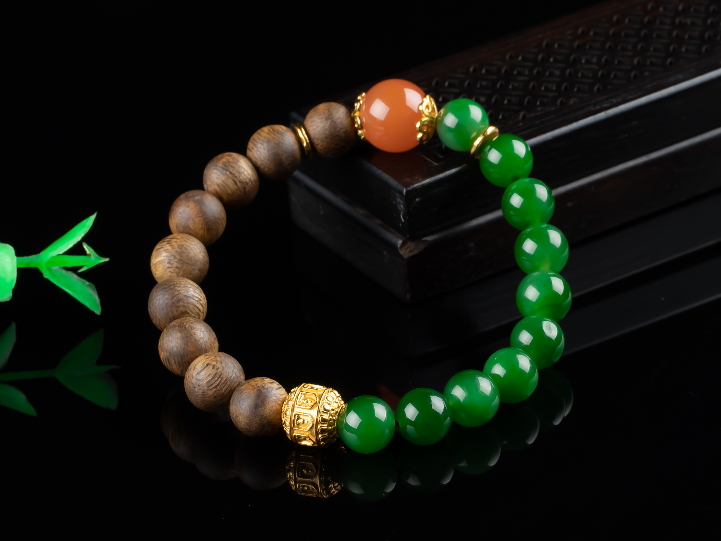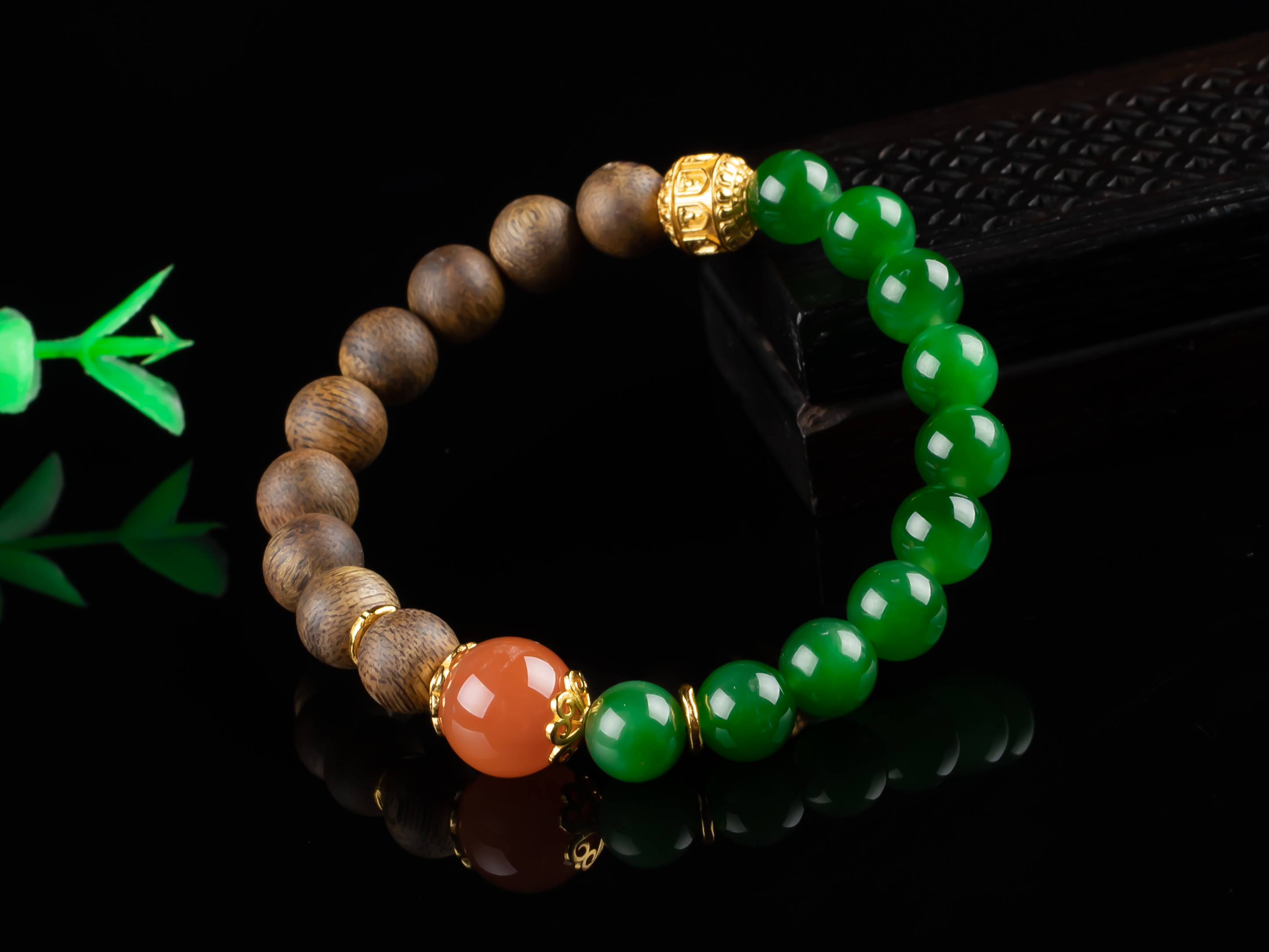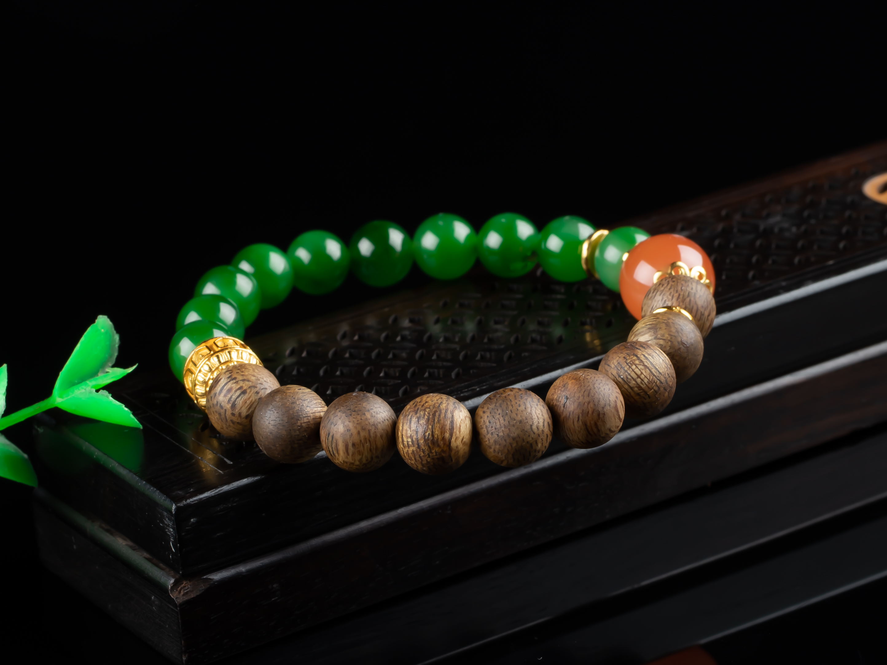 XY0114沉香+南红碧玉925银手串,天然沉香圆珠8.3mm,原色原味,香味自然清甜,一半沉香,香韵古朴,安神舒压,一半碧玉,细腻温润,碧绿、无瑕,一颗满色肉的南红,鸿运当头,以925银装饰穿搭,半山半水,阴阳调和,养神、养身。