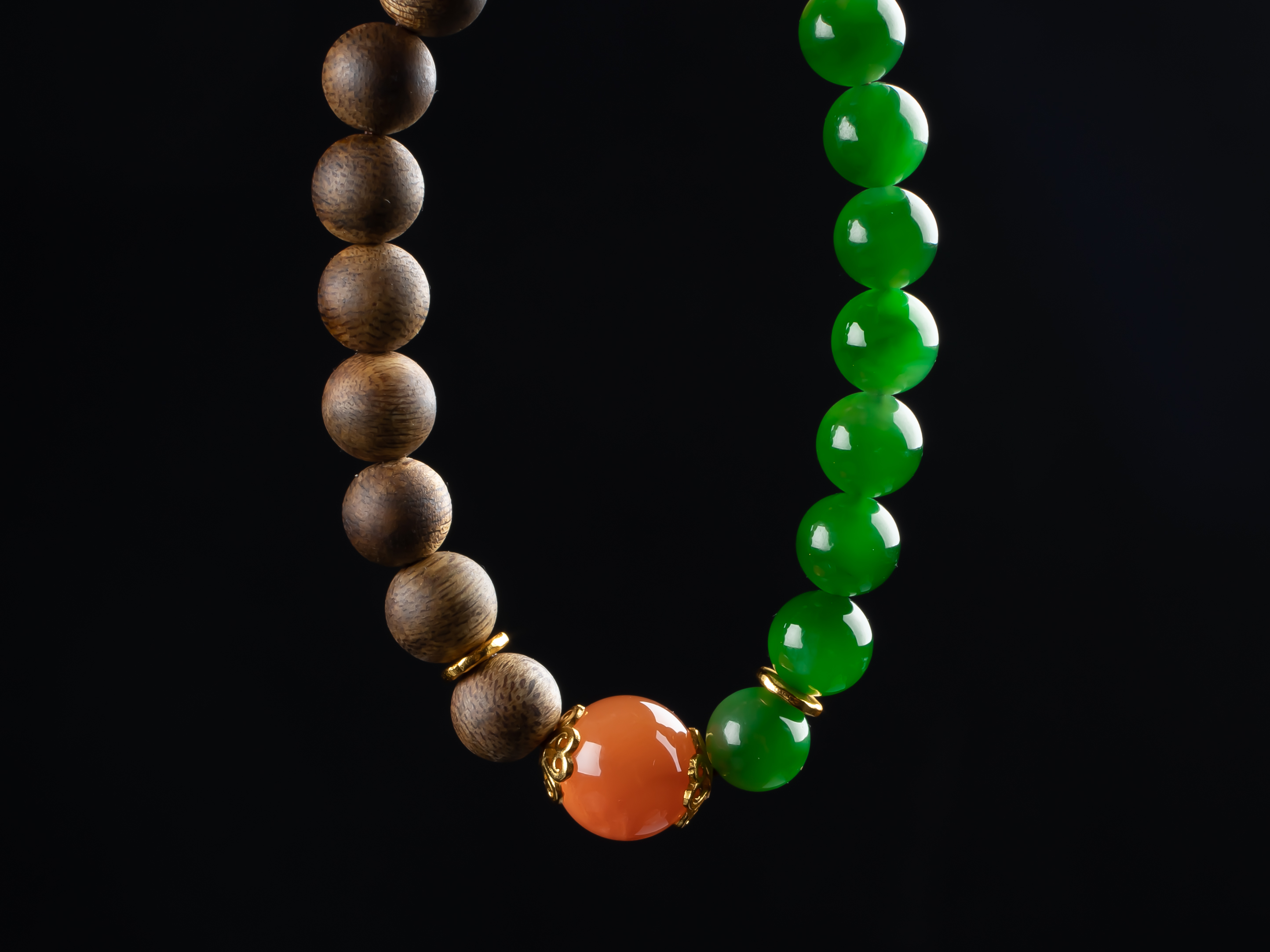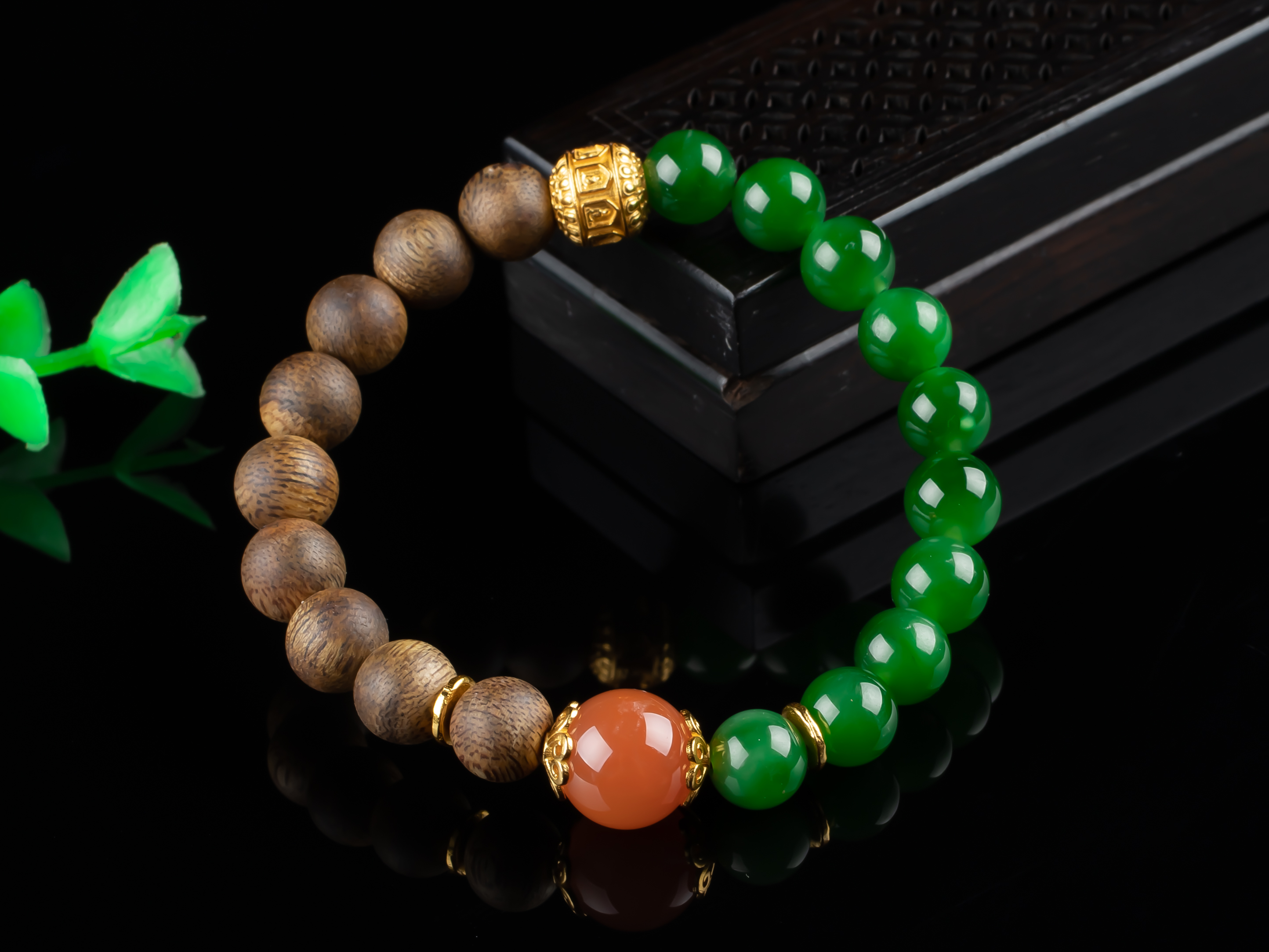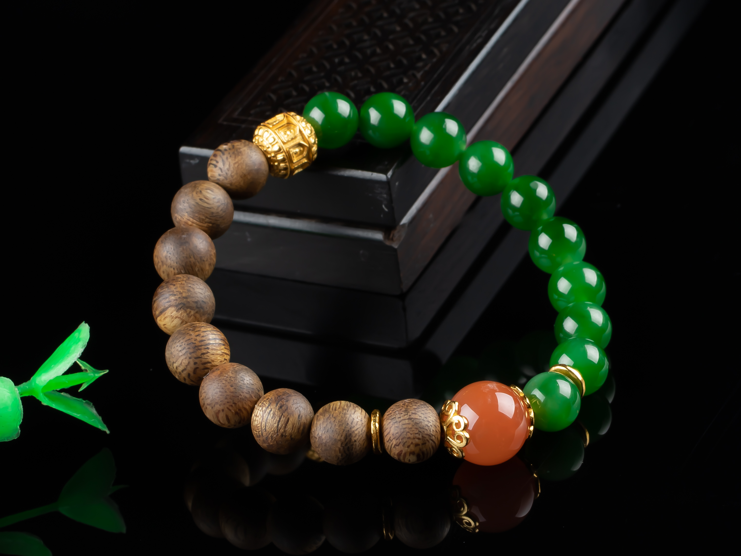 XY0114沉香+南红碧玉925银手串,天然沉香圆珠8.3mm,原色原味,香味自然清甜,一半沉香,香韵古朴,安神舒压,一半碧玉,细腻温润,碧绿、无瑕,一颗满色肉的南红,鸿运当头,以925银装饰穿搭,半山半水,阴阳调和,养神、养身。