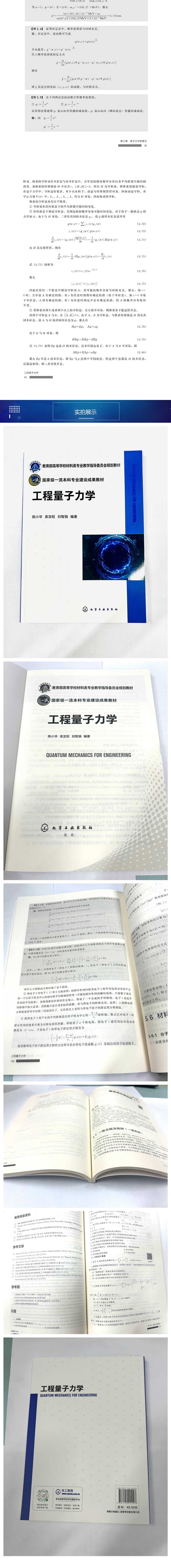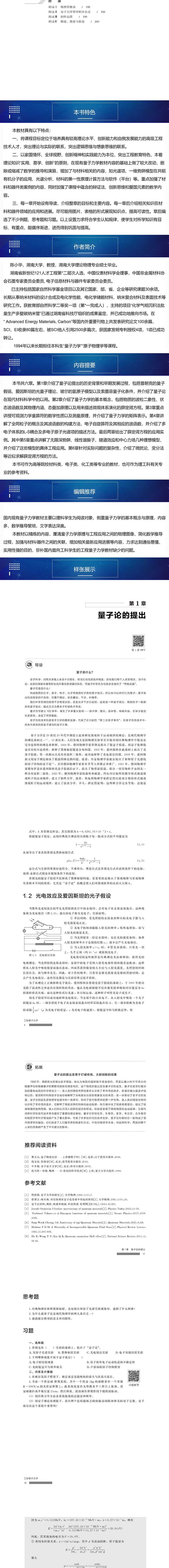 【前言】量子力学在应用科学、工程学中的作用越来越重要,是物理、微电子、材料等专业开设的一门基础课程。国内现有量子力学教材主要以理科学生为阅读对象,侧重量子力学的基本概念与原理,内容多,数学推导繁琐,文字表达深奥。已有教材对量子力学基本原理的物理意义阐述缺乏与实际工程/科学问题之间的关联,具体应用实例少。针对当前学时紧张、工科类学生的物理和数学知识相对比较薄弱的实际情况,如何快速地让学生掌握抽象的量子力学理论的基本要素并提高解决问题的能力是极具挑战性的。为了满足工科学生的学习需求,英国A.F.J.Levi编著了《Applied Quantum Mechanics》(Cambridge University Press,2003)教材,重点讨论量子力学在半导体材料中的应用,但仍比较理论化,适合工程物理专业。同时,国内仍缺乏专门面向工科,特别是材料学科的量子力学教材。教材问题已成为学生对这门课程畏惧的突出问题。随着一流本科专业建设的深入推进,教材的开发已成为高等学校课程改革焦点。开发和编写出适应新工科实际和学生适用的《工程量子力学》教材日益迫切。针对以上问题,本教材以精练的内容,厘清量子力学原理与工程应用之间的物理图像,简化数学推导过程,加强与材料/器件之间的关联,增加相关最新应用进展等内容,力求达到通俗易懂、实用性强的目的,弥补国内面向工科学生的工程量子力学教材缺少的问题。本教材具有以下特点:一、将课程目标定位于培养具有较高理论水平、创新能力和自我发展能力的高级工程技术人才,突出理论与实际的联系,突出逻辑思维与想象思维的联系。二、以家国情怀、全球视野、创新精神和实践能力为本位,突出工程教育特色,本着理论知识;实用、易学、创新的原则,在现有量子力学教材内容的基础上做了较大改动,删除或缩减了数学的推导和演算,增加了与材料相关的内容,如光谱项、一维势阱模型在共轭有机分子的应用、光谱分析、材料的第一性原理计算方法与软件(平台)等。重点加强了材料和器件类案例的内容,同时加强了课程中蕴含的辩证法、创新思维和爱国元素的教学内容。三、每一章开始设有导读,介绍整章的目标和主要内容。每一章后介绍相关知识在材料和器件领域的应用和进展。尽可能用图片、表格的形式展现知识点,提高可读性。章后编选了不少例题、思考题和习题。以上设置力求符合学生认知规律,使学生对所学知识有目标、有重点,能循序渐进,进而得到巩固与提高。本书为湖南大学材料科学与工程专业国家级一流本科专业建设成果教材,由湖南大学陈小华(组织并执笔第1、4、5章)、袁定旺(执笔第2、3、6章)和刘智骁(公式的编辑、习题选编)编著,最后由陈小华负责修改和定稿工作。由于编写时间仓促,加上编著者水平有限,书中疏漏之处在所难免,敬请各位专家、同行、读者批评指正。