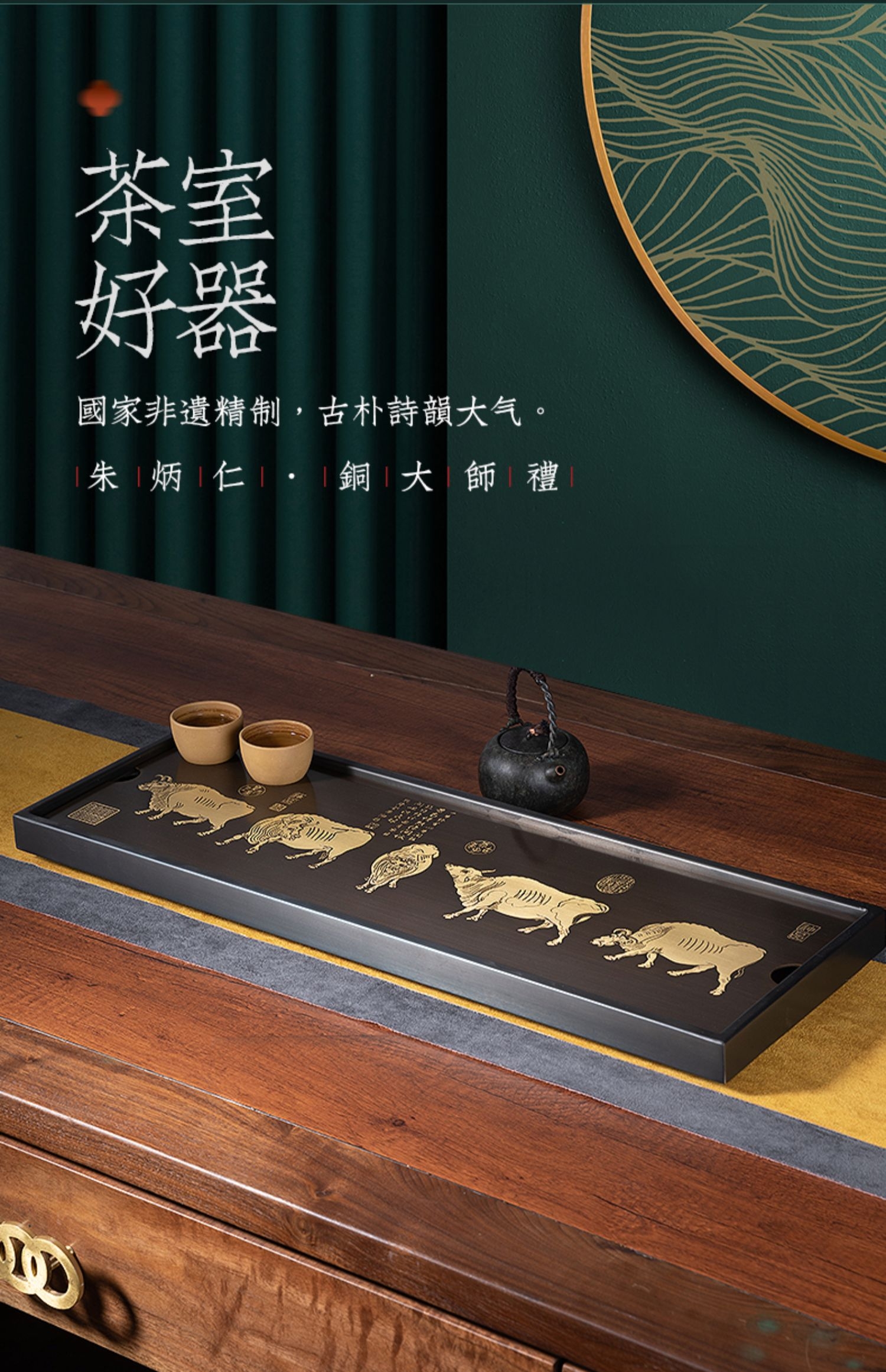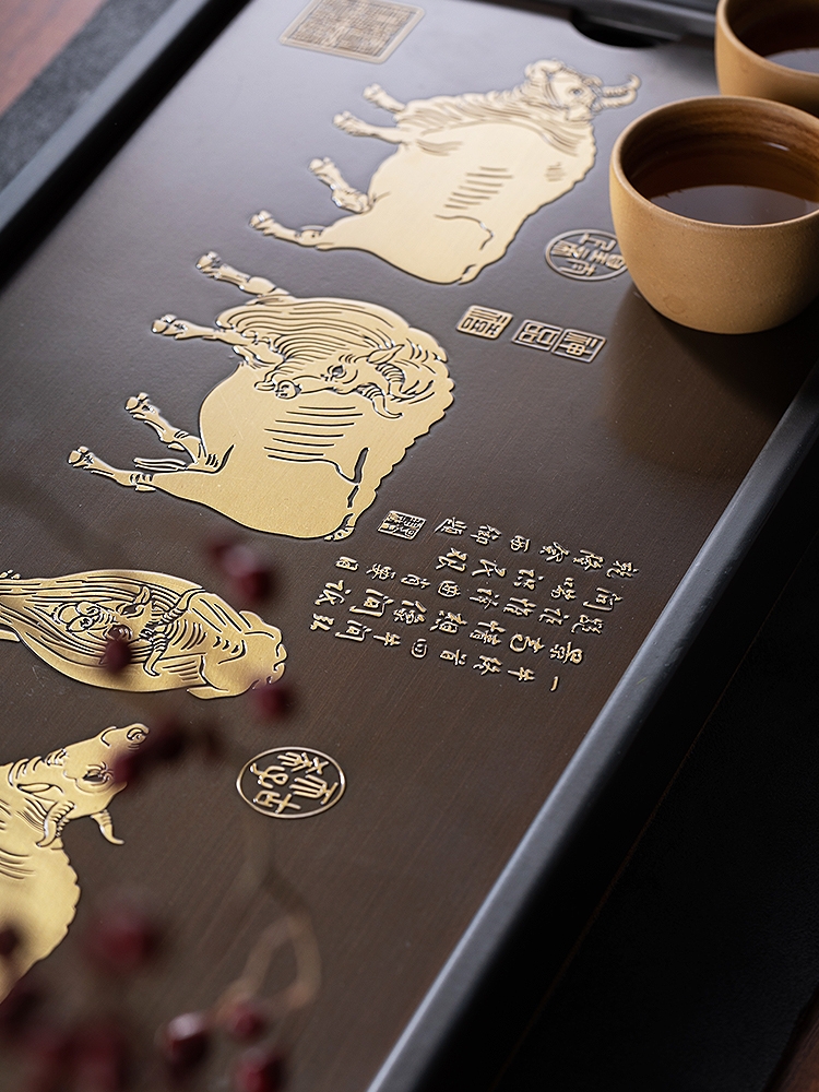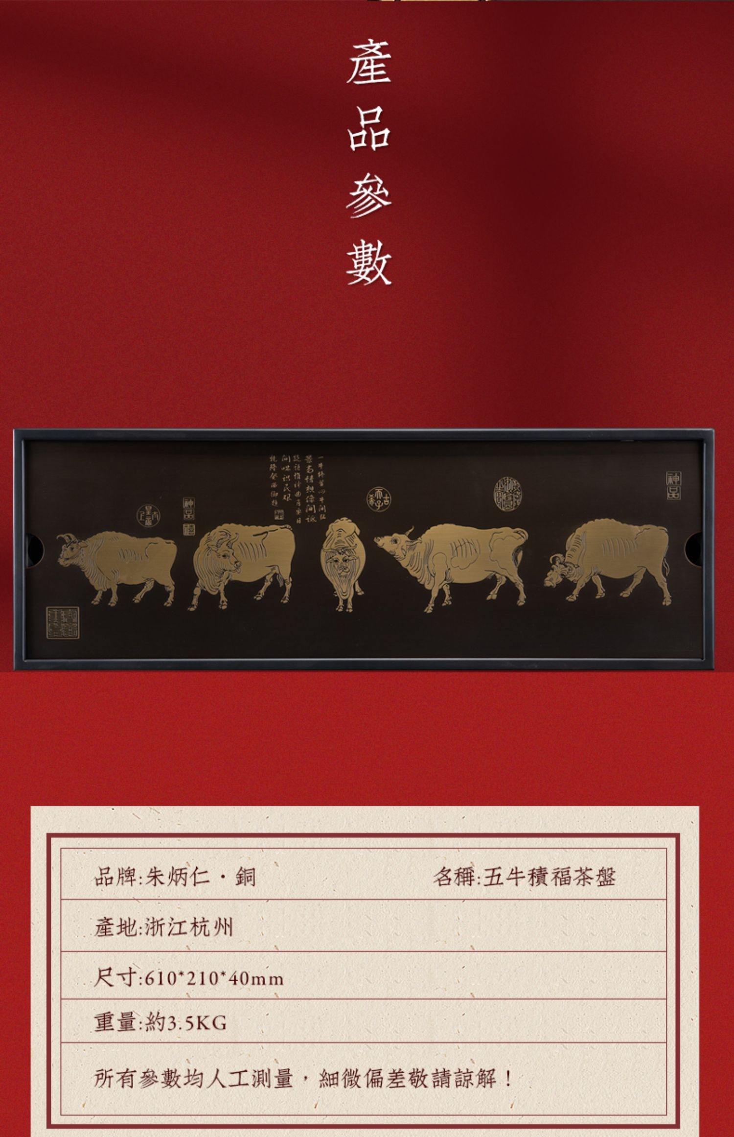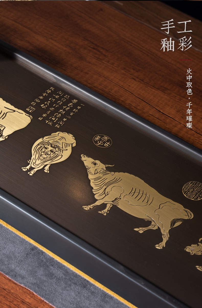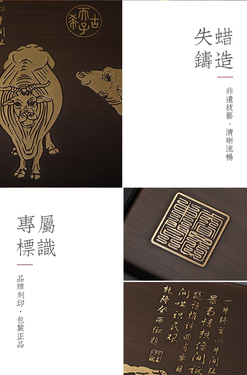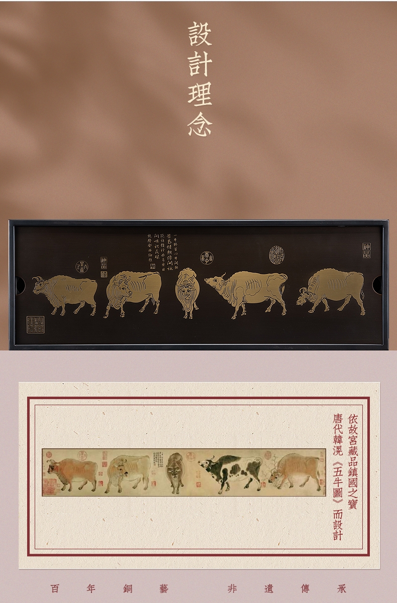 产品介绍: 依故宫国宝级藏品,唐代韩滉《五牛图》而设 计。寓意福禄寿喜财,春夏秋冬好;五福临门喜事多,金牛开道福运来。国家非遗精制,古朴诗韵大气。比例精妙,栩栩如生。