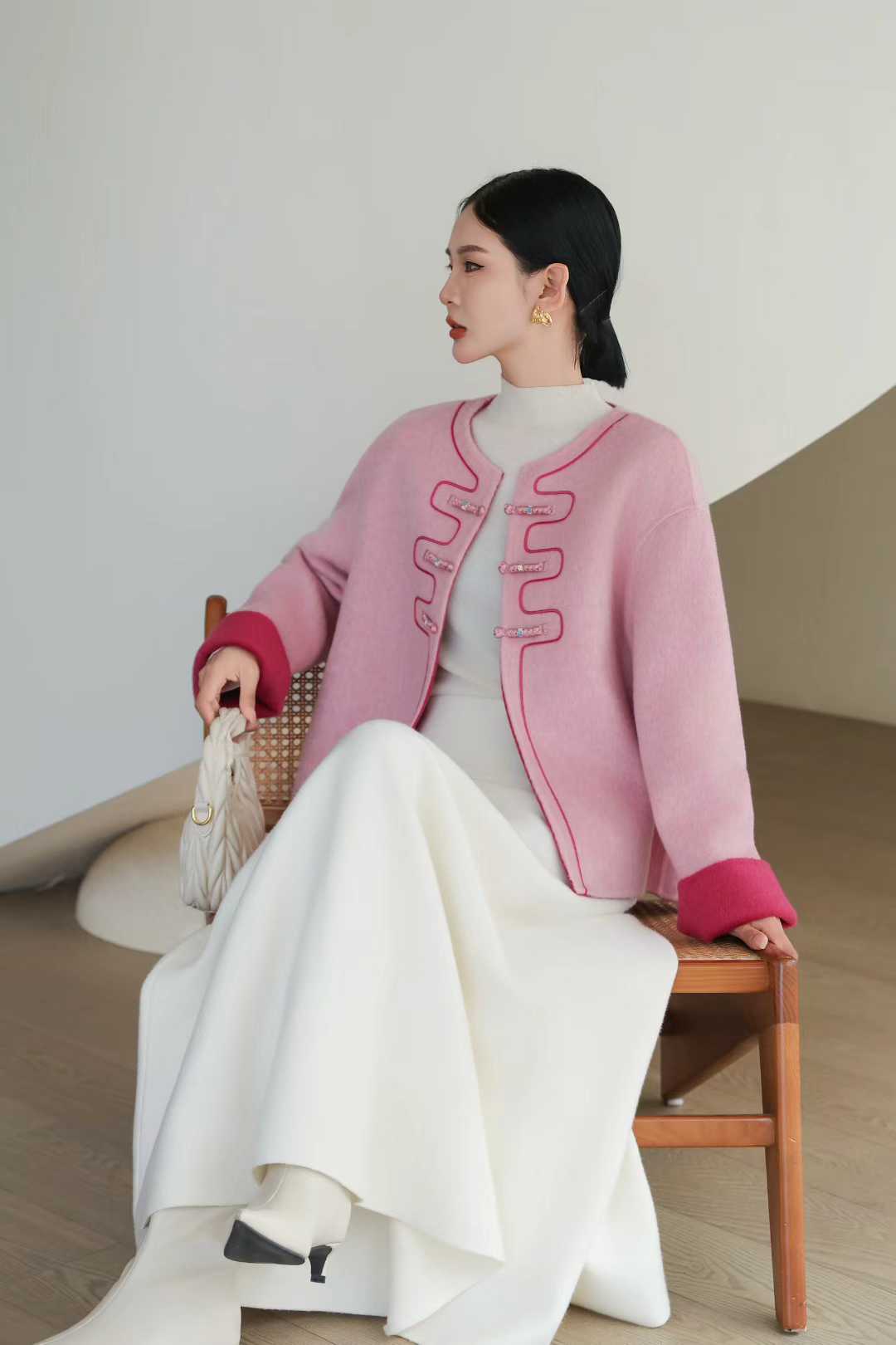SZ6A18_盈盈色_外套_秋冬_新中式圆领撞色镶边琵琶盘扣翻袖宽松_高级女装_BERNIEELEN 伯妮斯茵