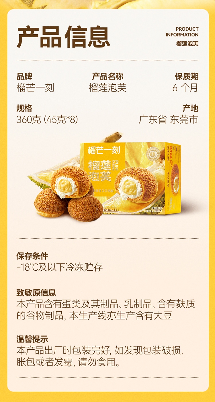 【冰火两重天】榴芒一刻榴莲泡芙360克(45g*8枚)/盒|纯动物奶油+榴莲果肉≥17%双重内陷 HY