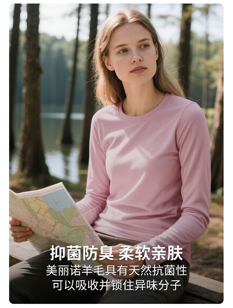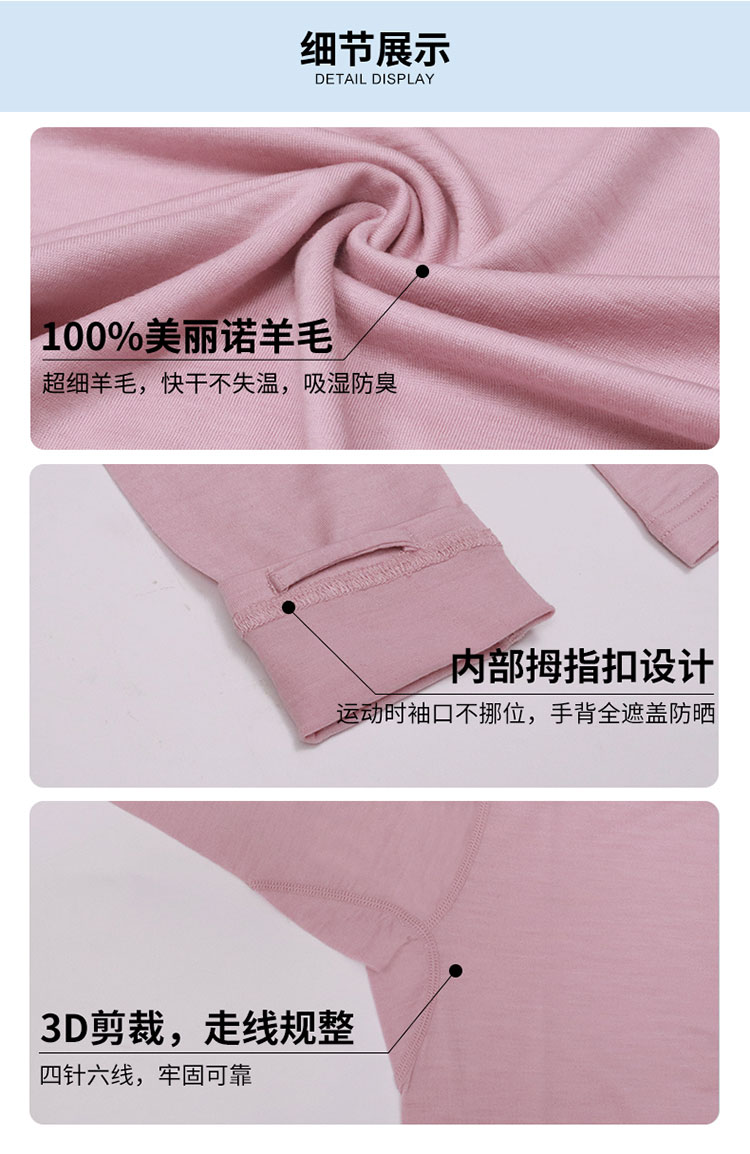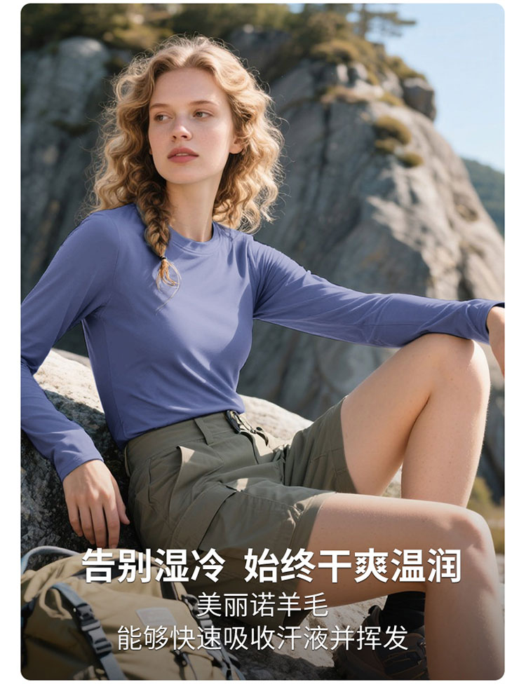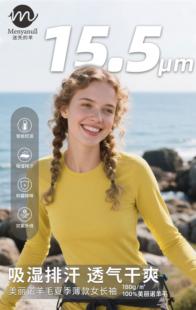 女士运动长袖T恤 100%美丽诺羊毛 15.5微米