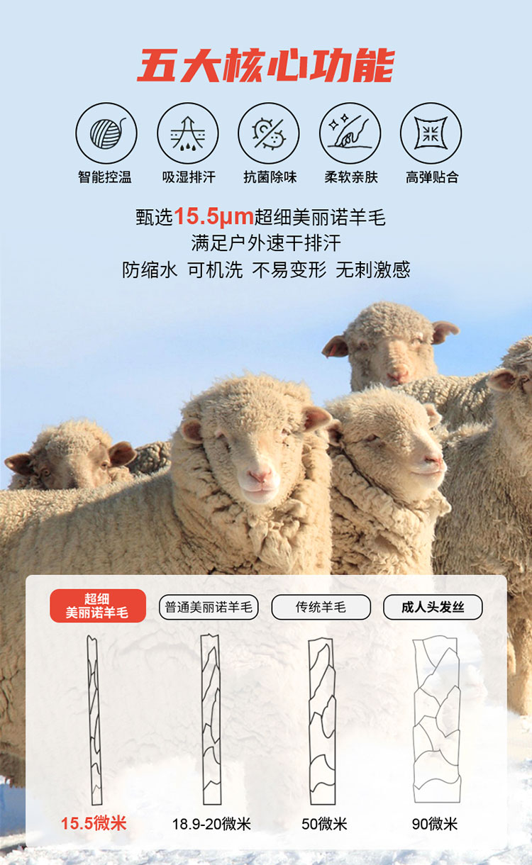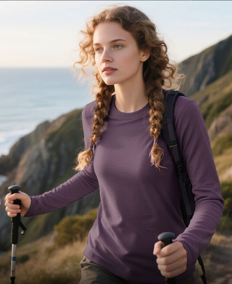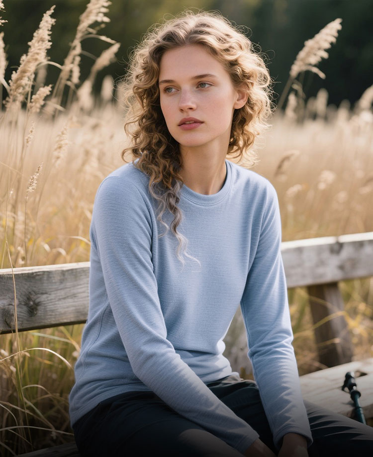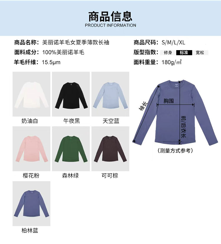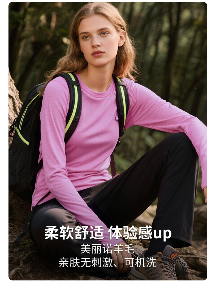 女士运动长袖T恤 100%美丽诺羊毛 15.5微米